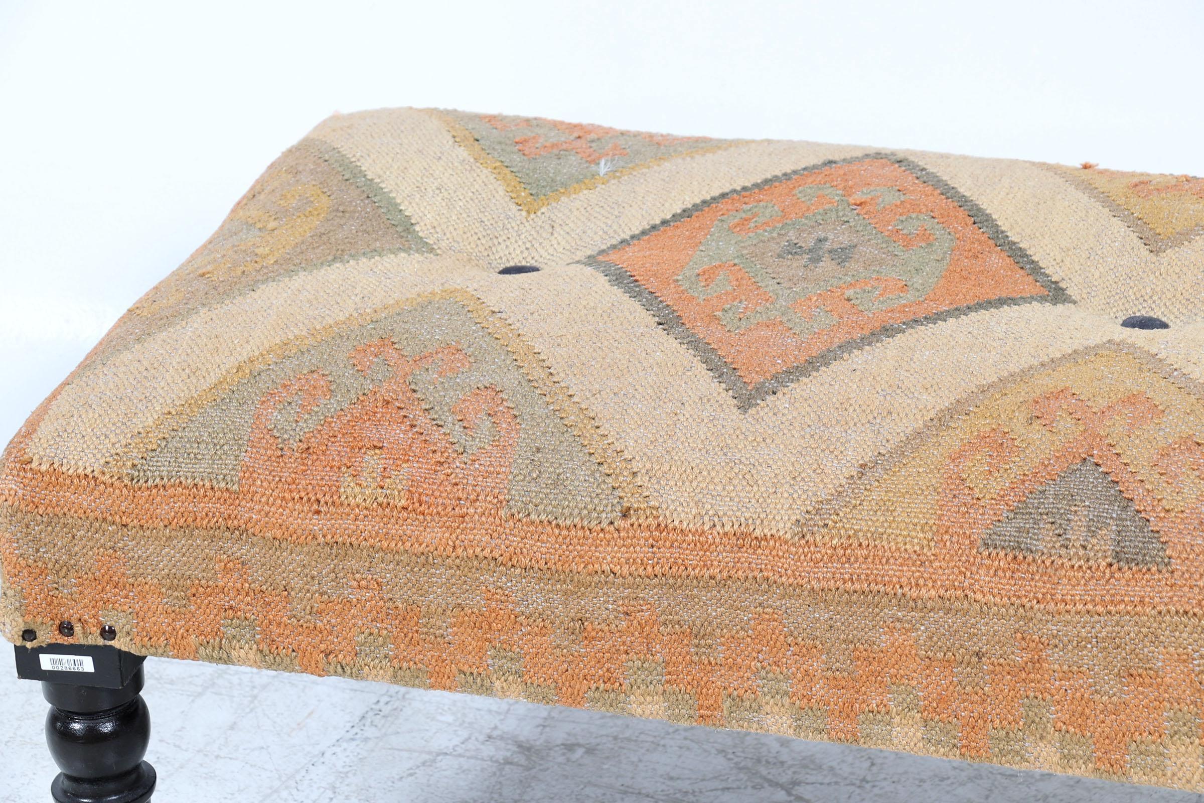 Poef op zwarte poten met Kelim stoffering, h.44 x b.120 x d.52 cm.