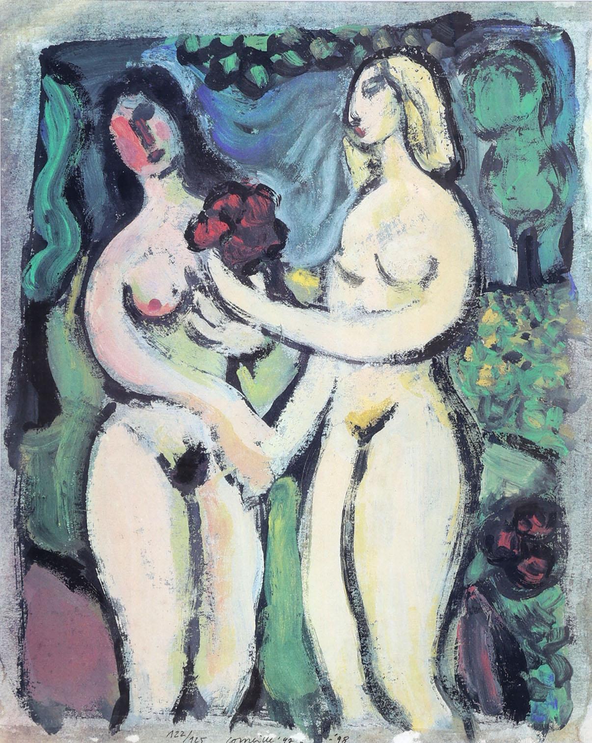 'Corneille', alias van Cornelis Guillaume van Beverloo, (1922- 2010), Blonde et Brune (1947-1998), zeefdruk, gesigneerd en genummerd in de plaat, oplage 122 / 125, uitgegeven ter ere van het 50-jarige bestaan van COBRA, 50 x 40 cm. Provenance: kunsthandel Elisabeth den Bieman de Haas