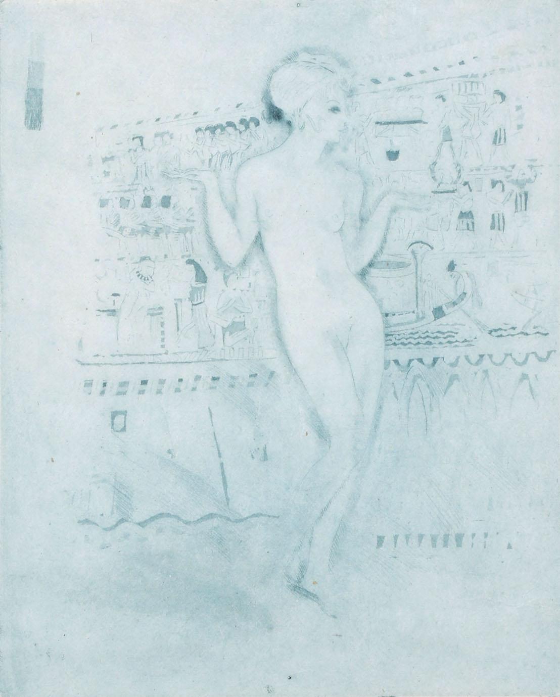 Onb. meester, Naakte dame voor Egyptische achtergrond, ets, 24,5 x 20 cm.