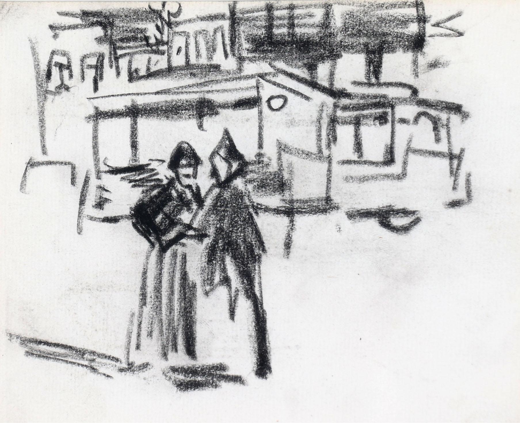 Omgeving Breitner, Personen in de stad, houtskooltekening, 13,5 x 15 cm. Provenance: collectie kunsthandel Elisabeth den Bieman de Haas