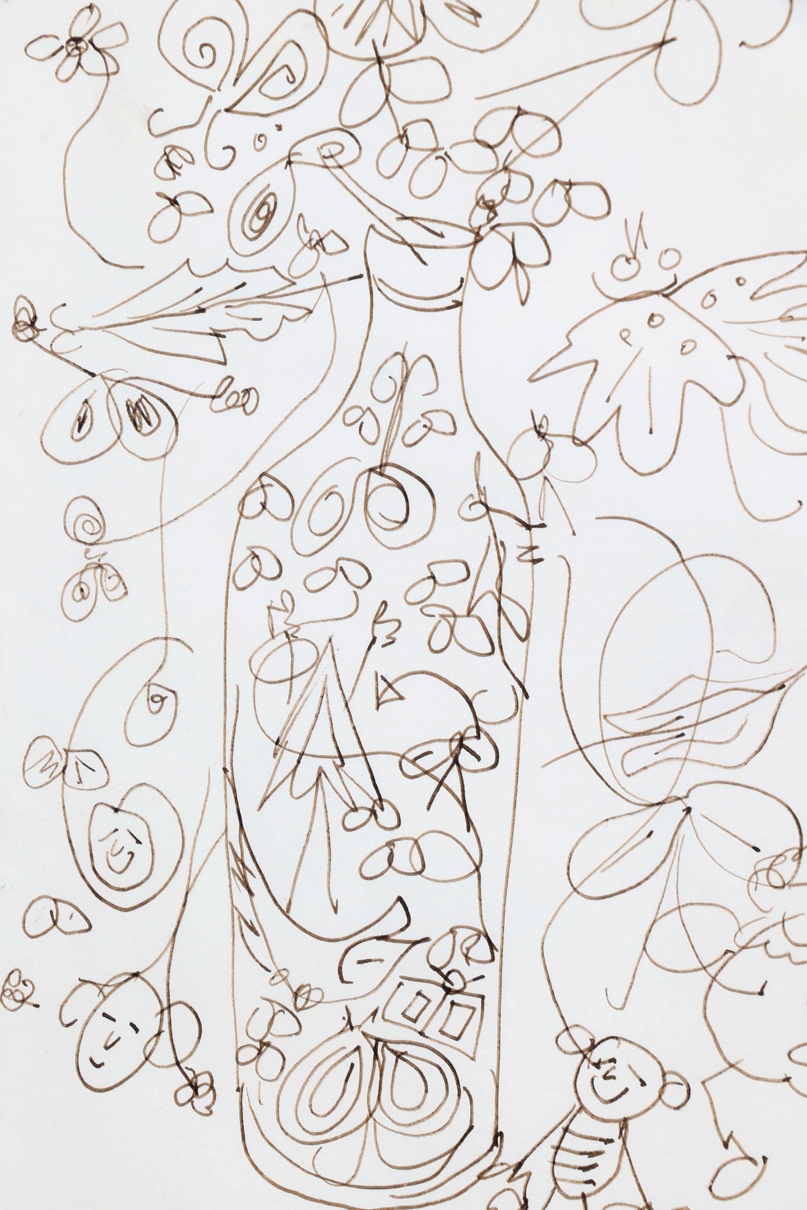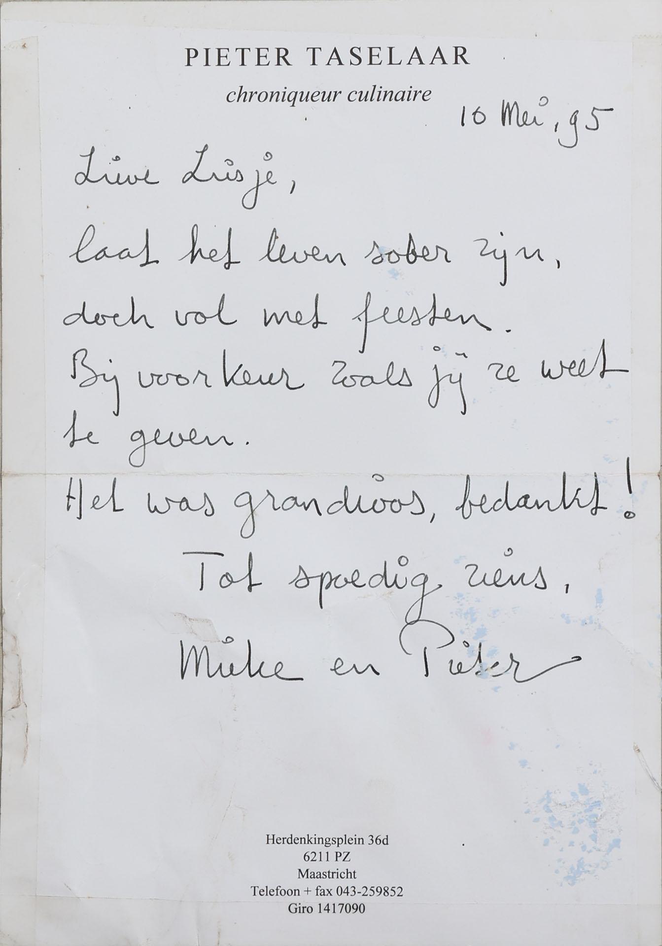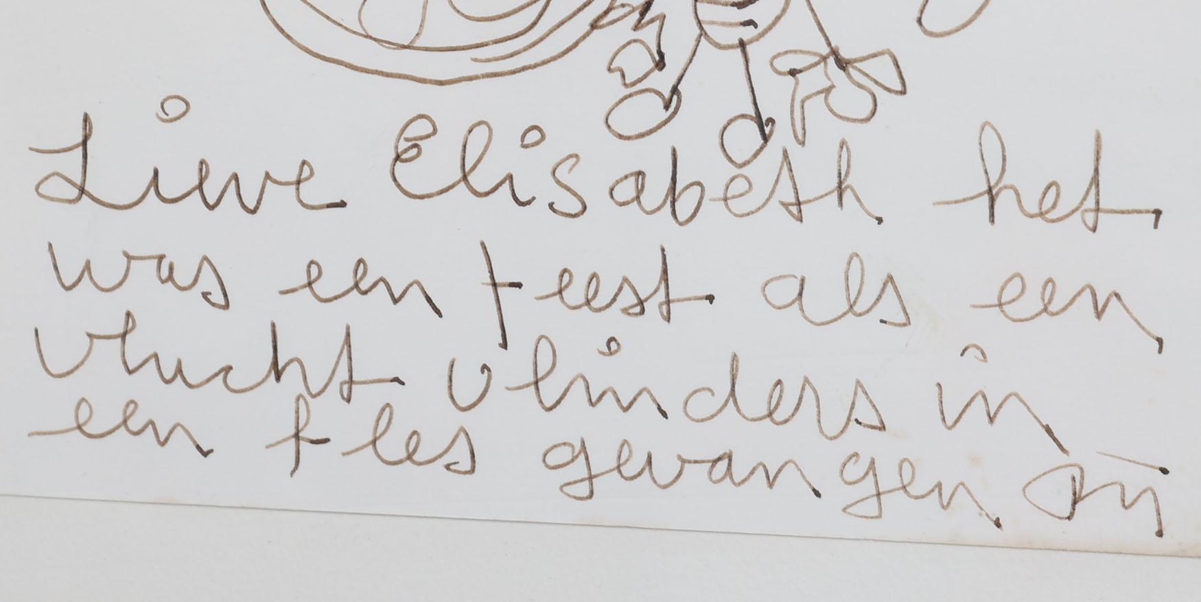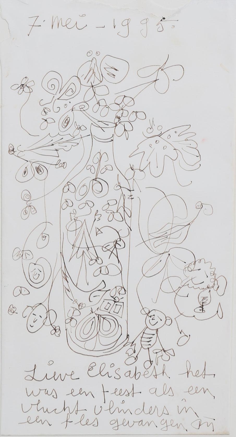 Persoonlijke boodschap van Corneille aan Elisabeth met tekening, 7 mei 1995, 33 x 18 cm. Provenance: collectie kunsthandel Elisabeth den Bieman de Haas