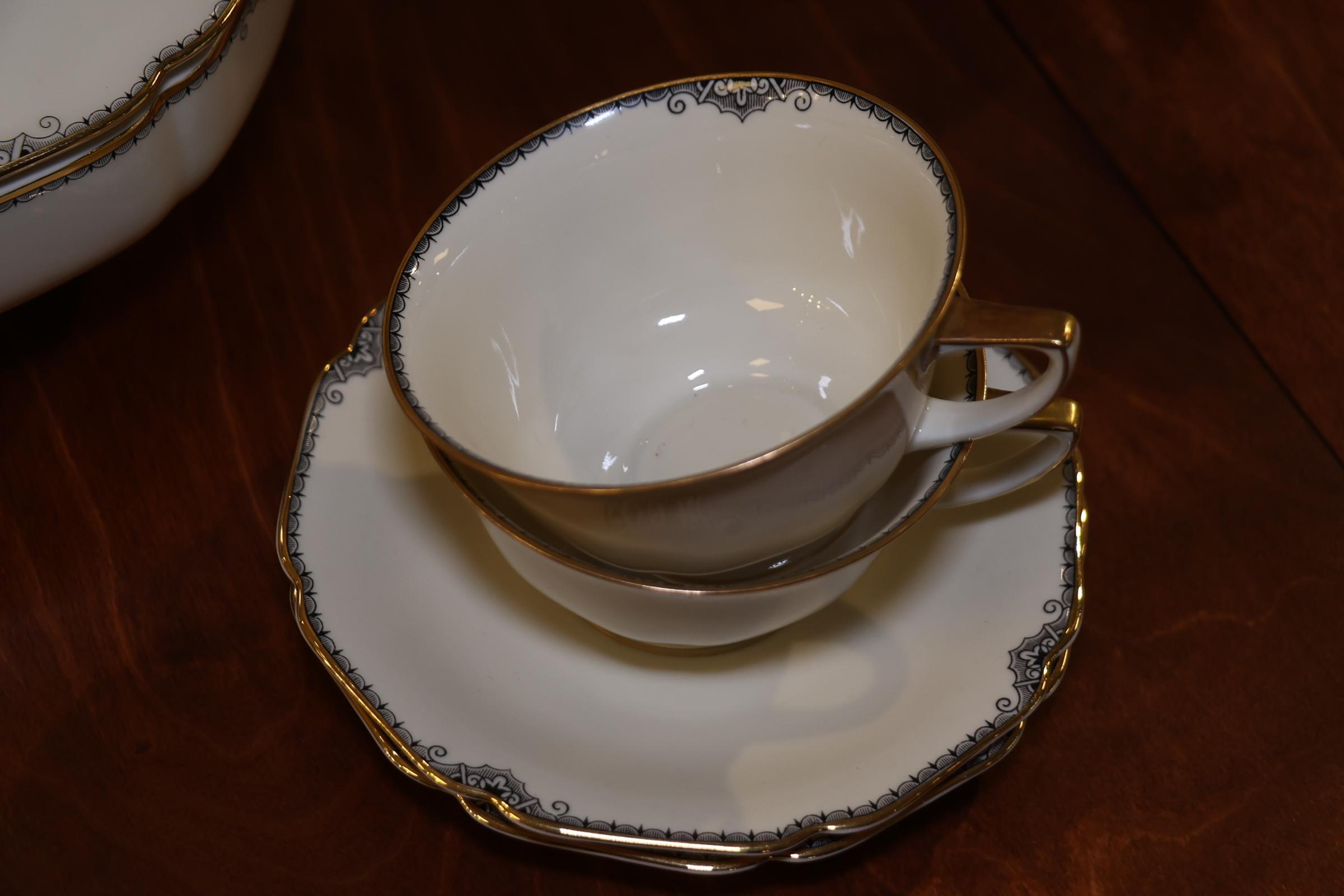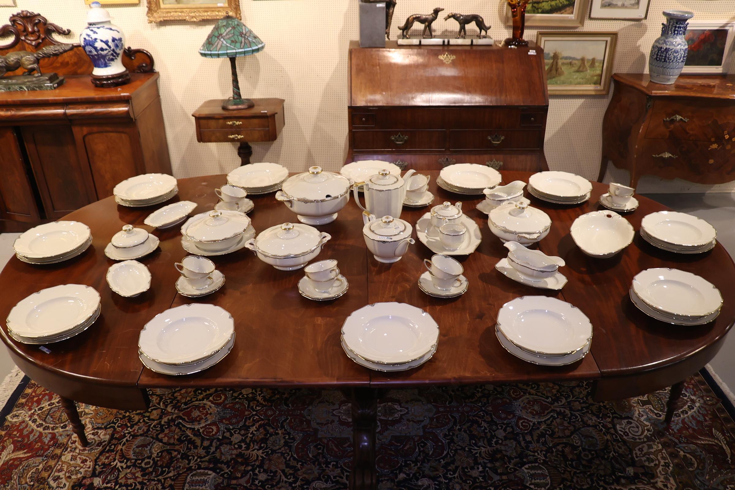 Zeer uitgebreid crèmekleurig porseleinen Hemrich serviesdeel met grijs/witte Art Deco-stijl decoratie en gouden accent afgezet, Bavaria Germany