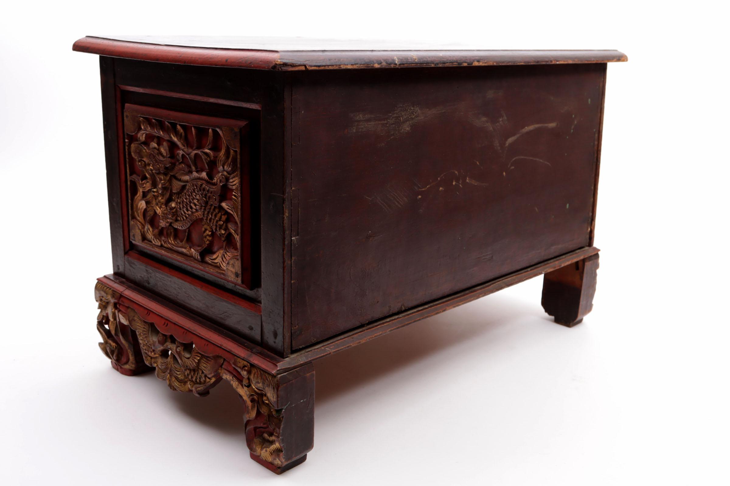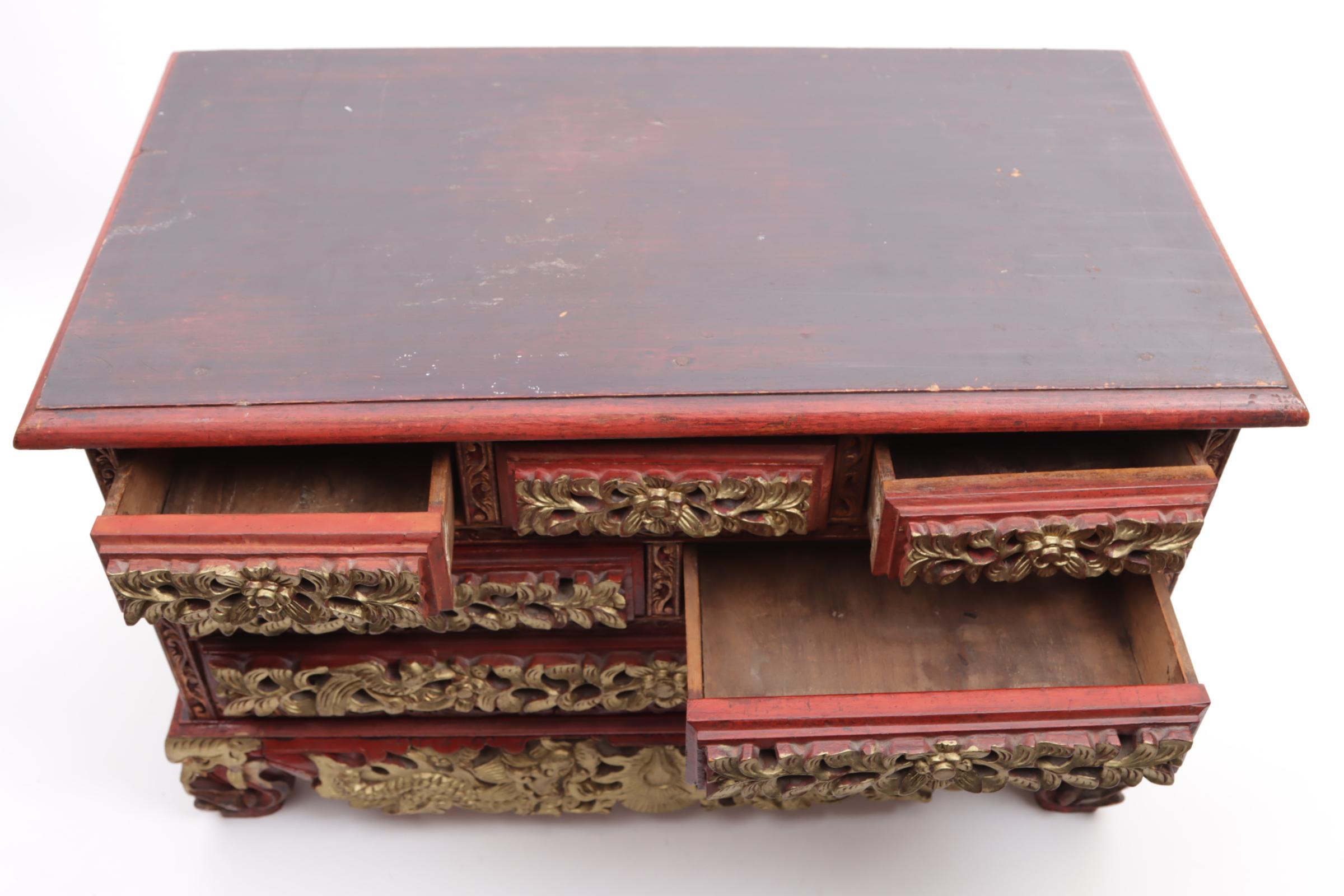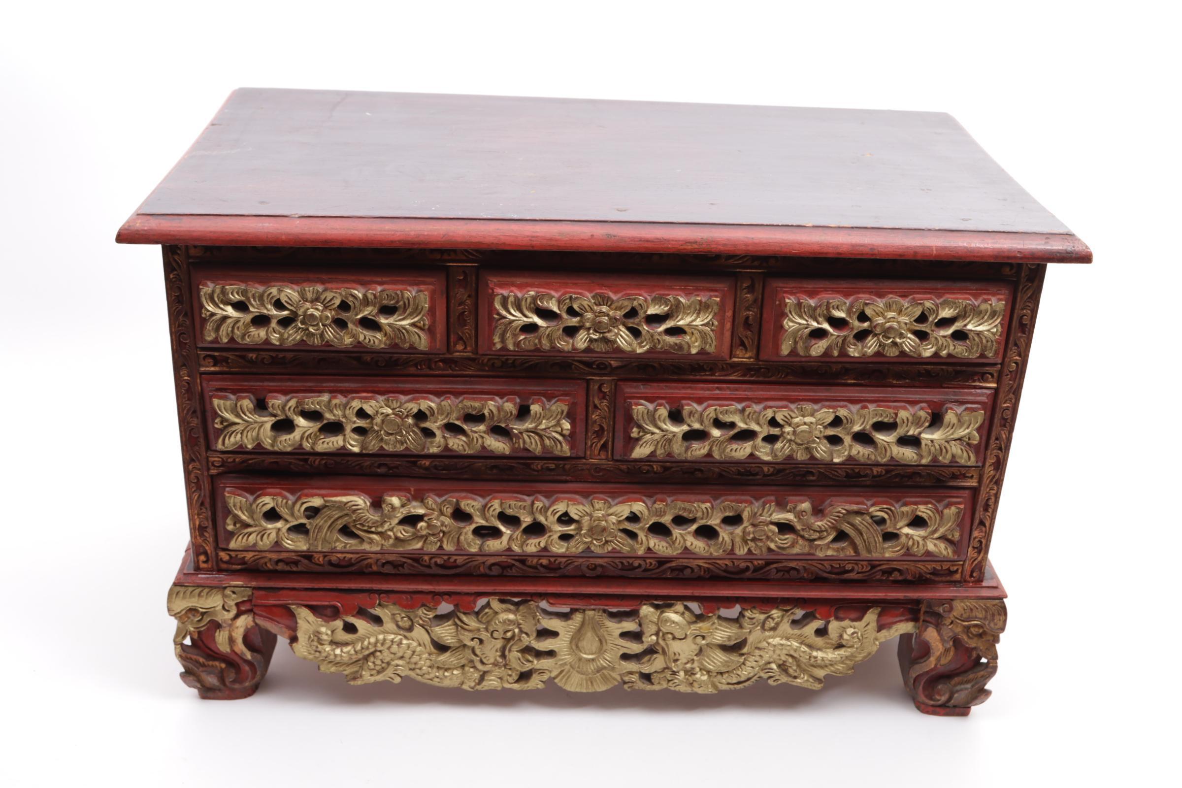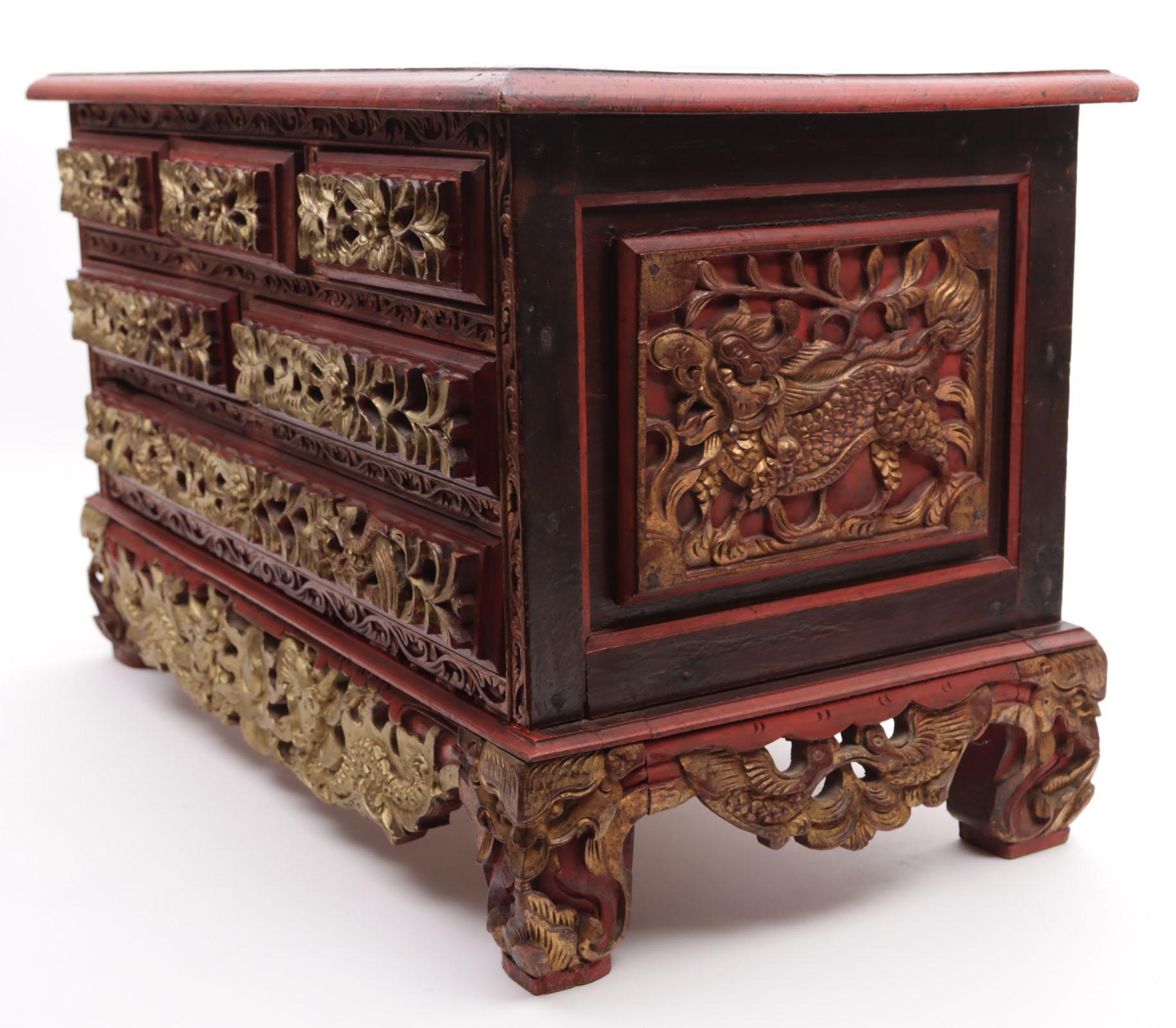 Rijkbewerkt Chinees miniatuur ladekast, h.34 x b.53 x d.29 cm. (ornament zijkant ontbreekt)