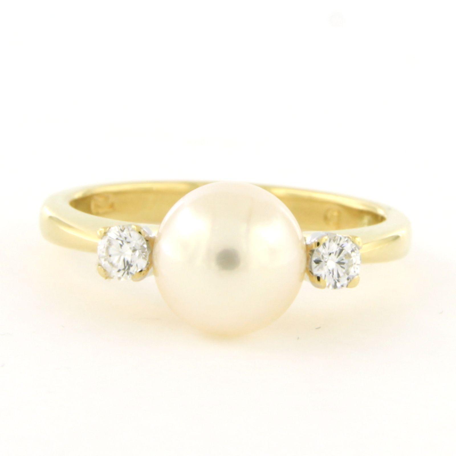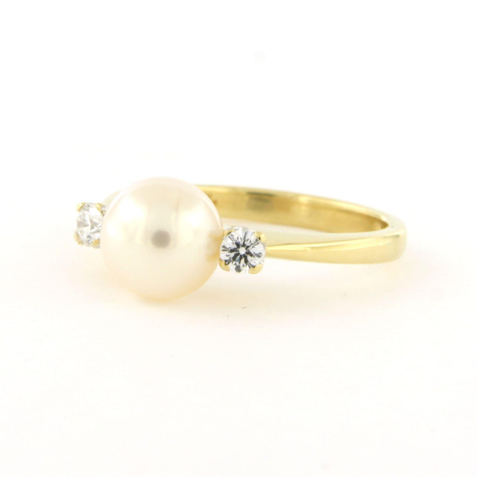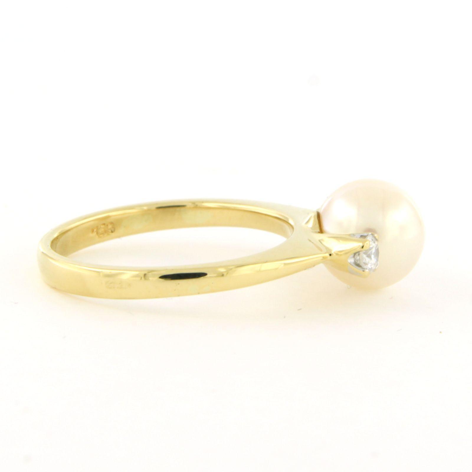 18 Kt. geelgouden ring bezet met parel en briljant geslepen diamant tot. 0.20ct 17.75(56)