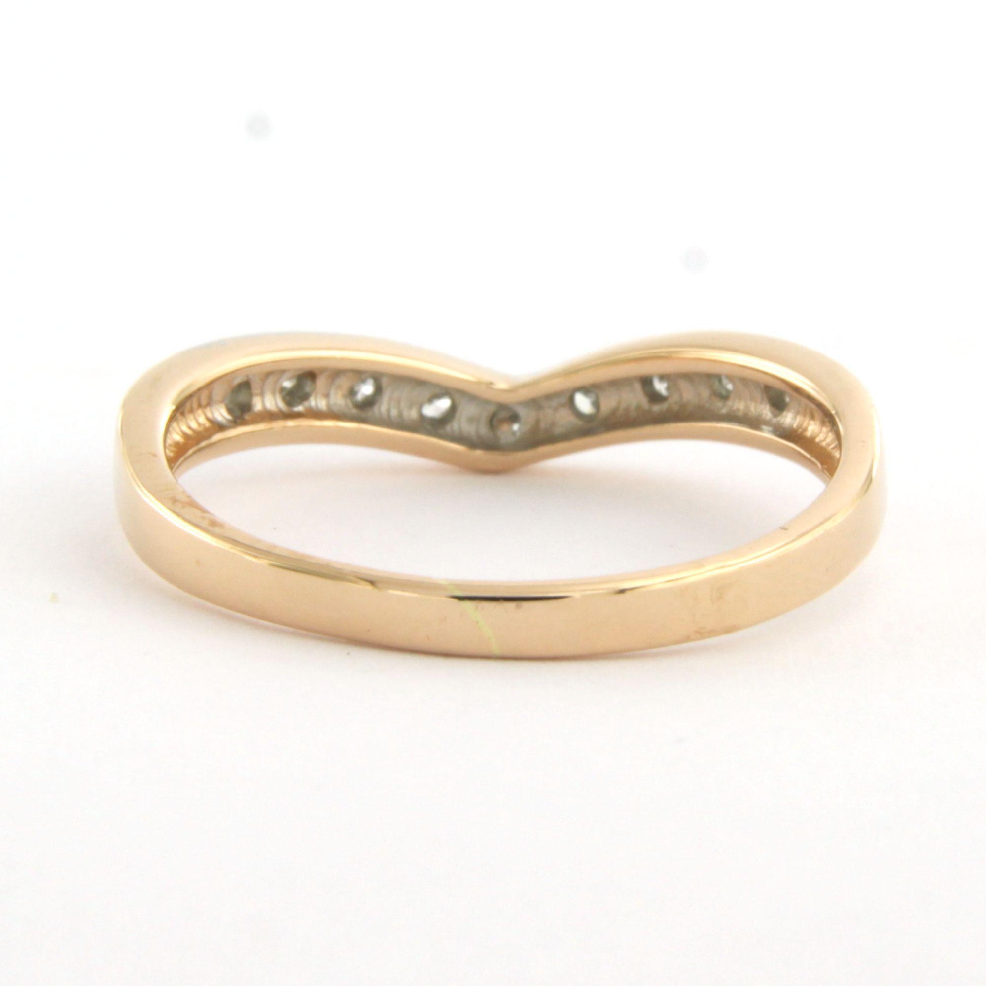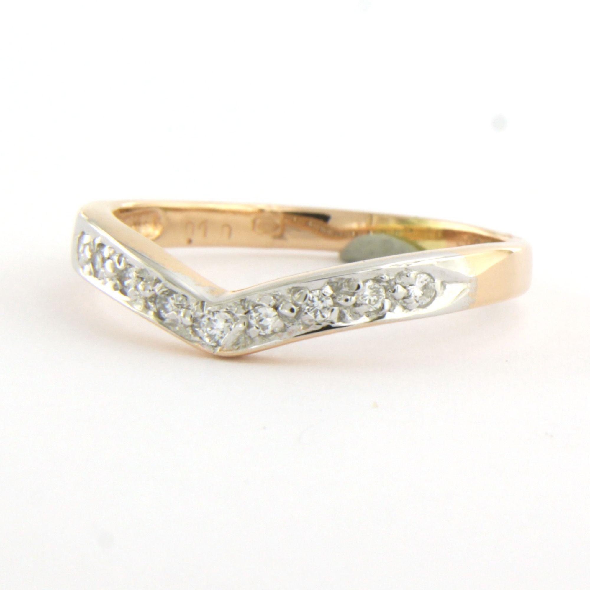 14 Kt. bicolor gouden ring in een vorm van een V bezet met briljant geslepen diamant tot. 0.05ct - ringmaat 17(53)