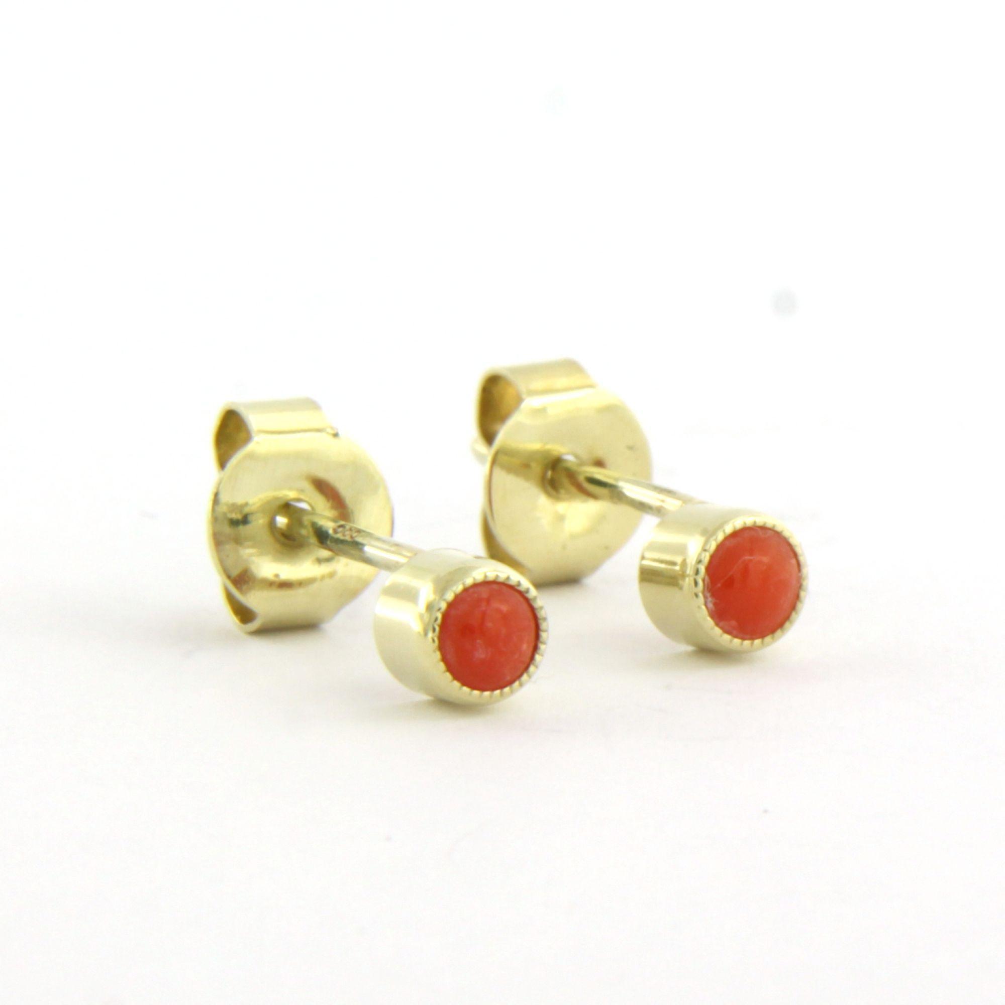 14 Kt. geelgouden oorknoppen bezet met koraal