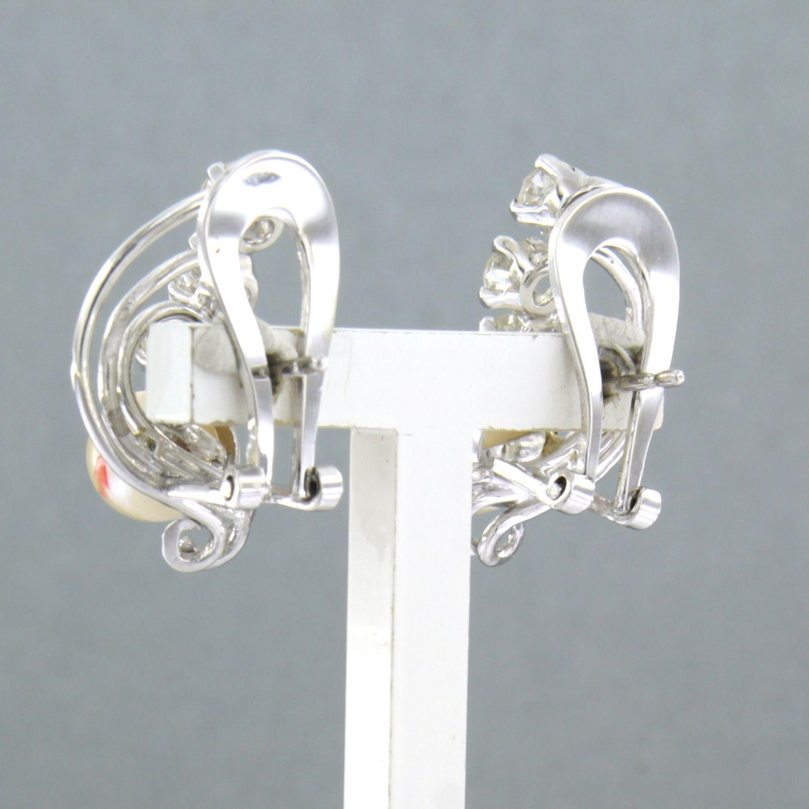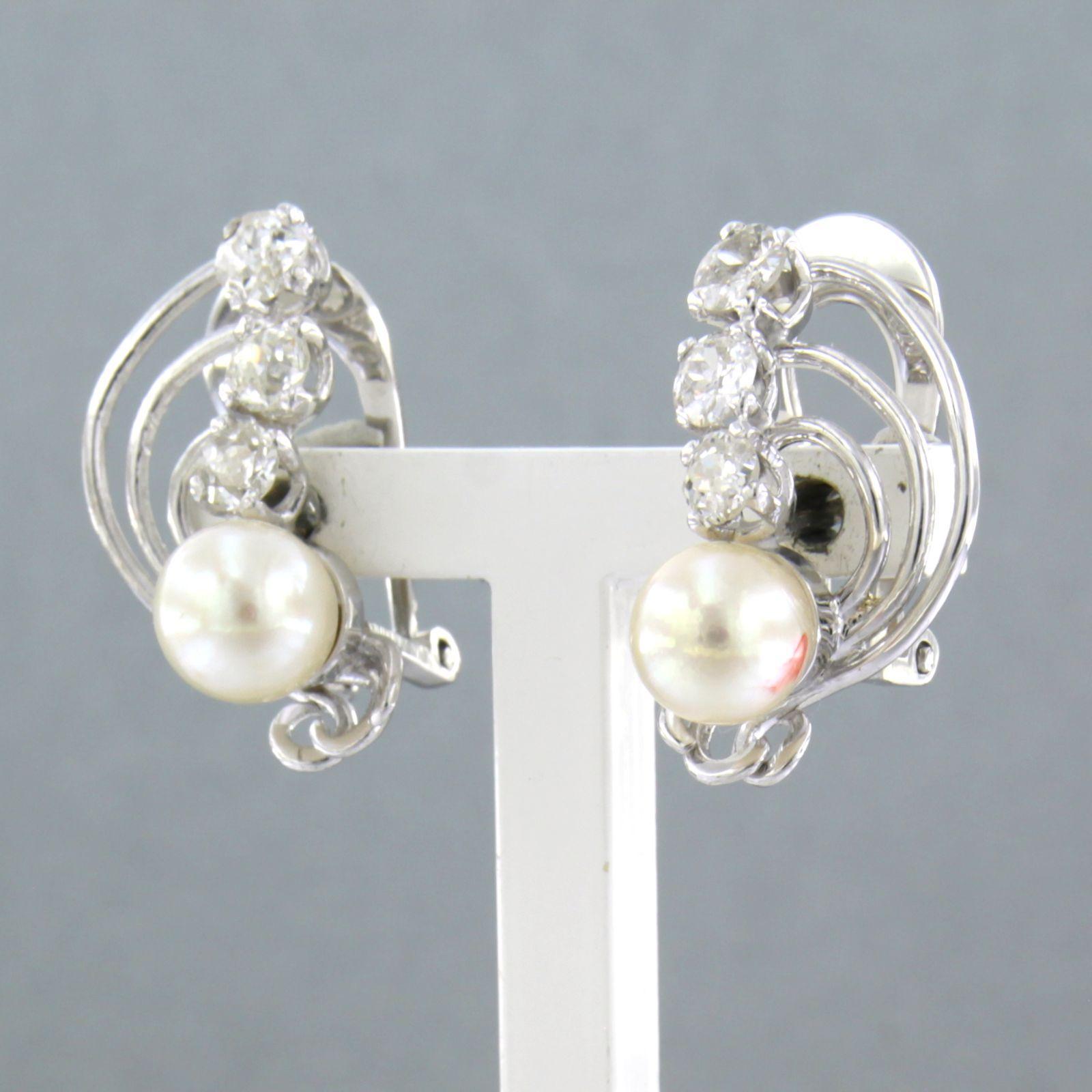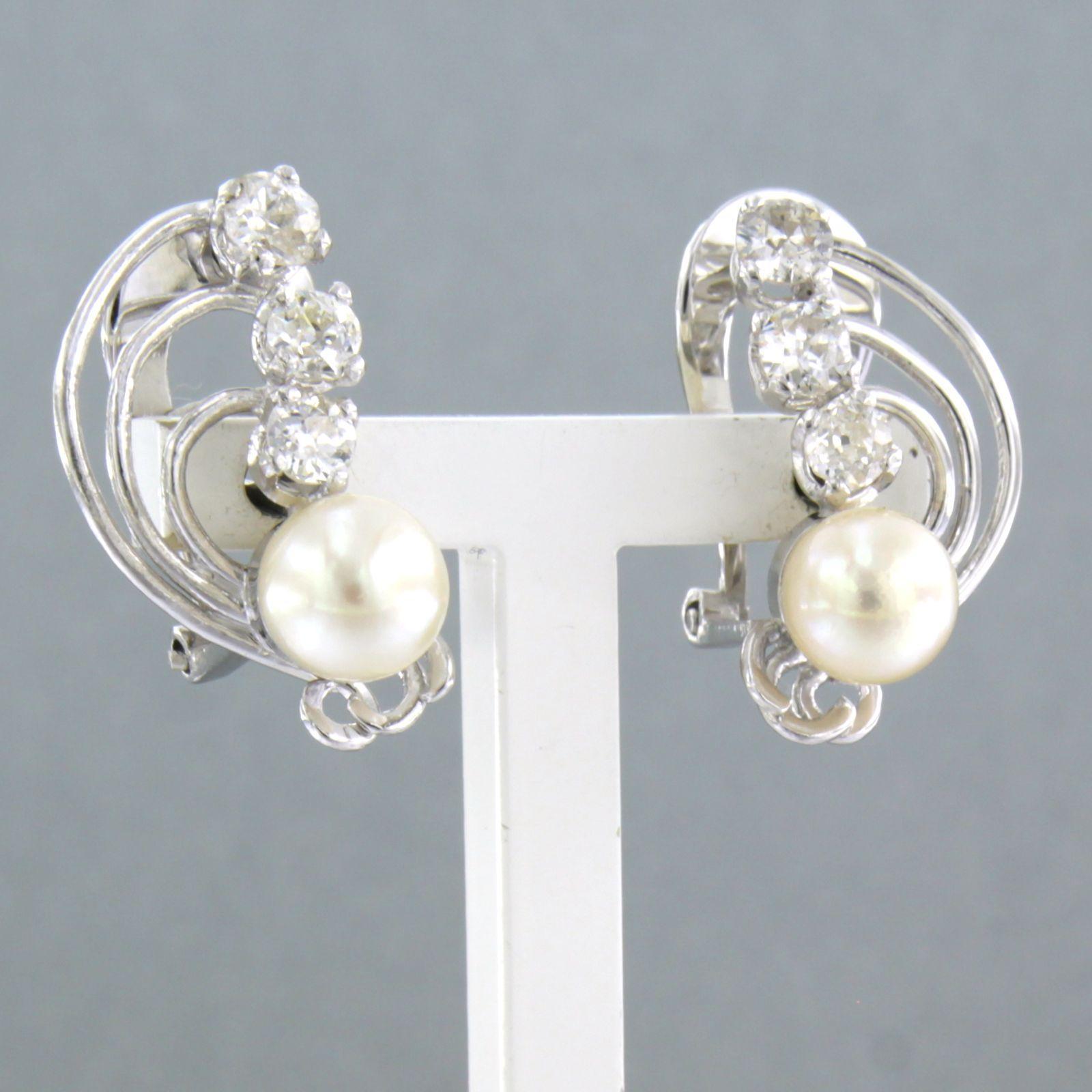 14 Kt. witgouden met platina oorclips bezet met parel en Bolsjewiek geslepen diamant tot. 0.80ct