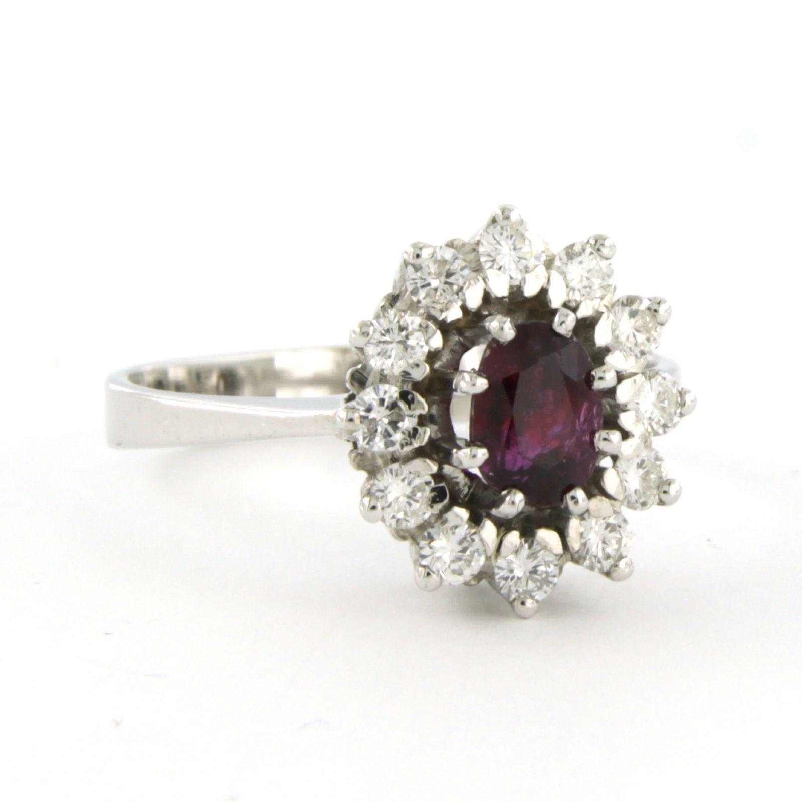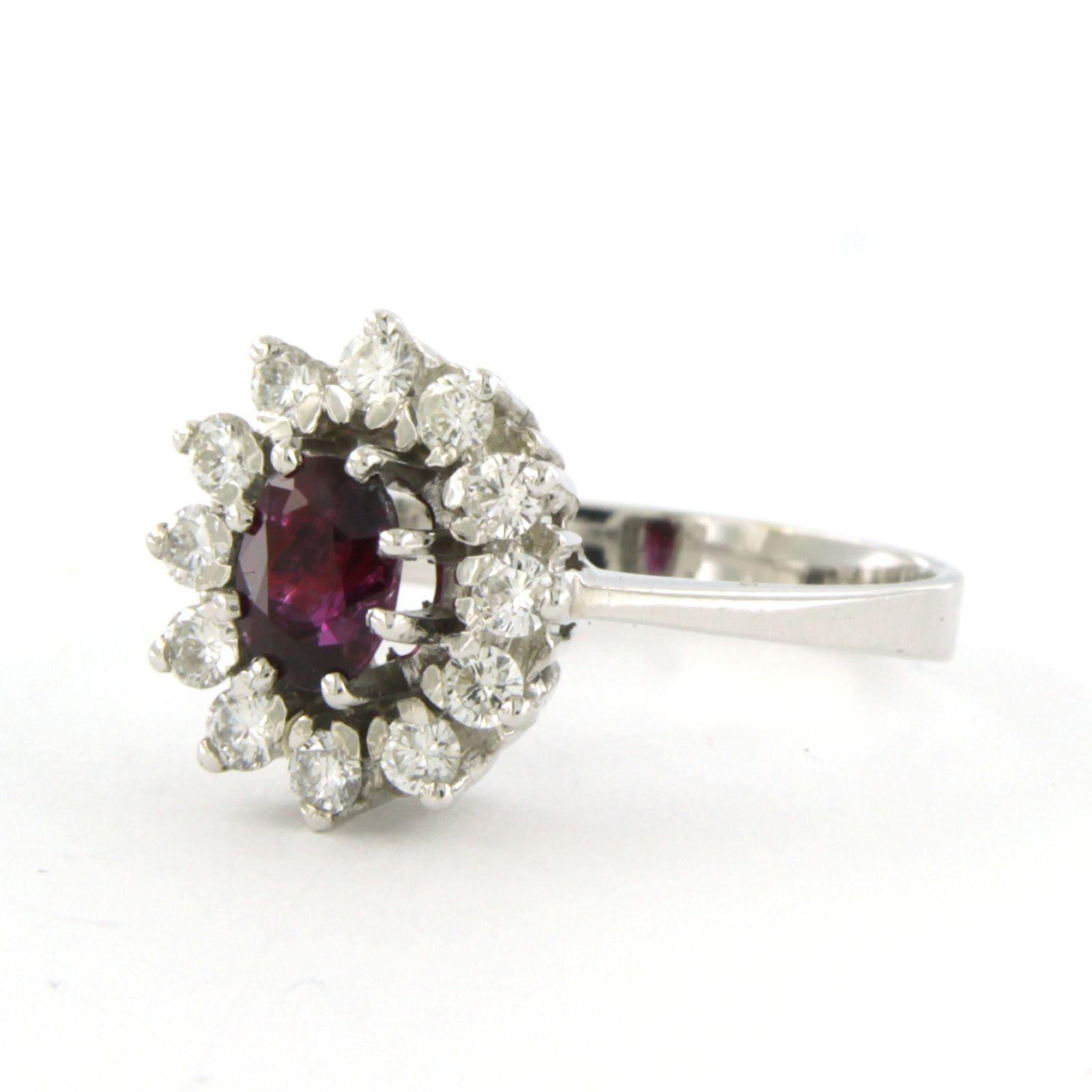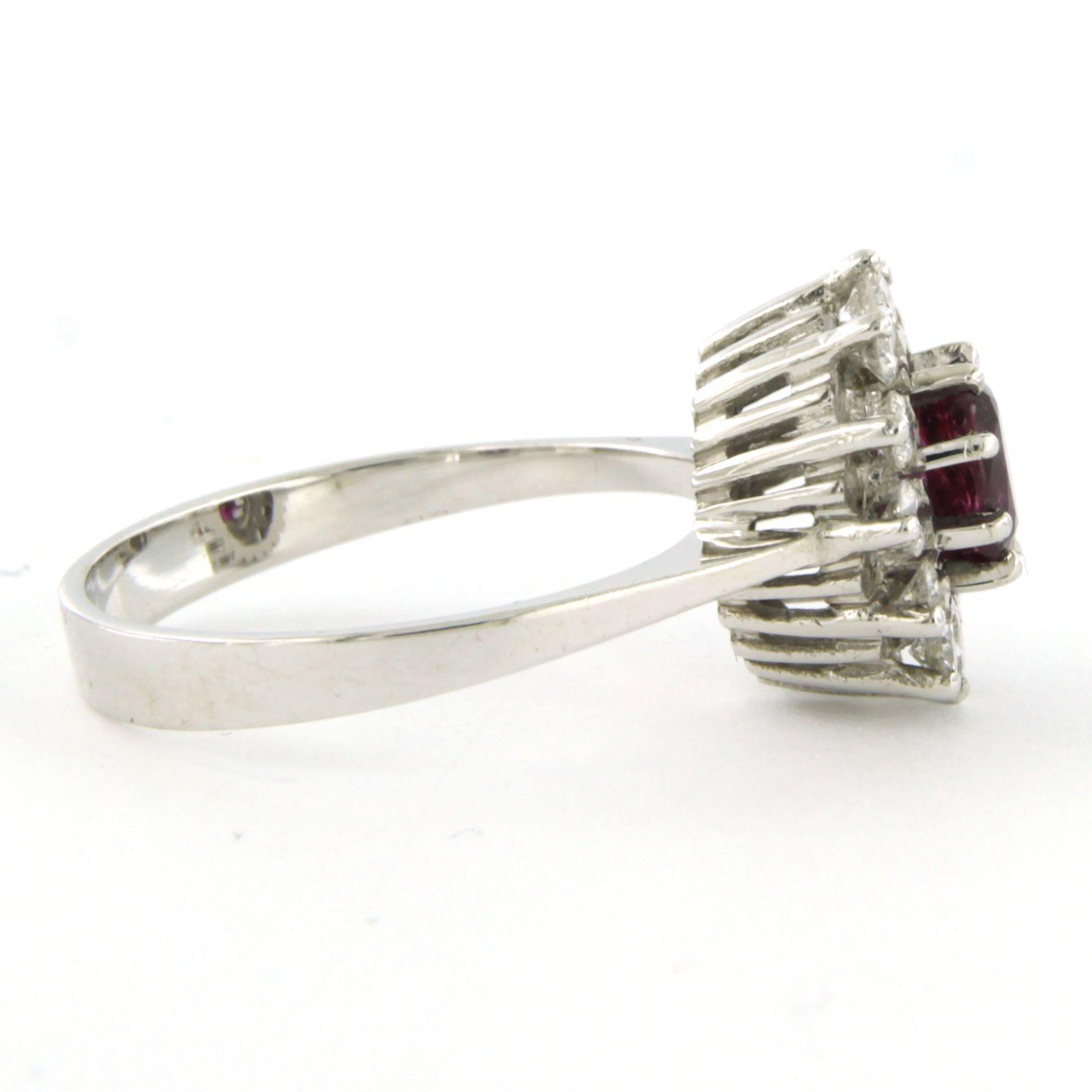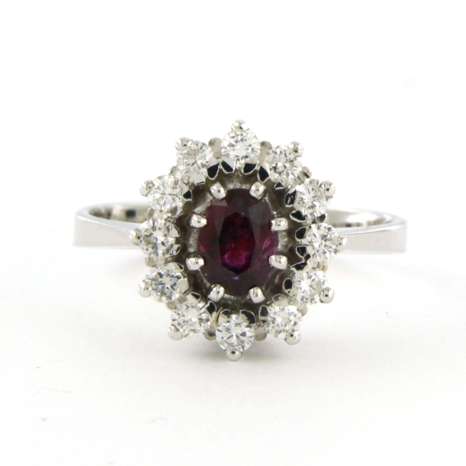 14 Kt. witgouden ring bezet met centraal een robijn en erom heen briljant geslepen diamanten tot. 0.50ct - ringmaat 18.5(58)