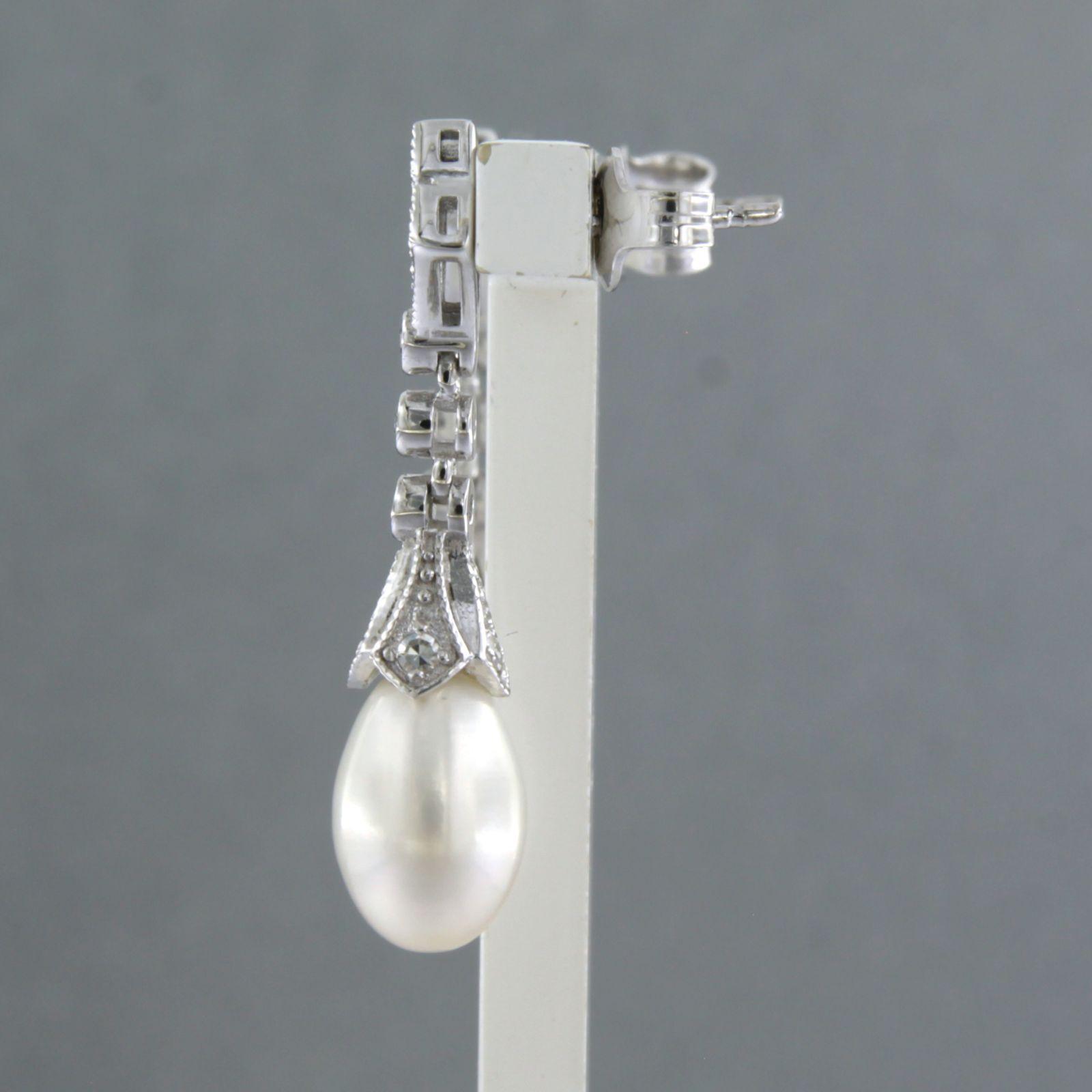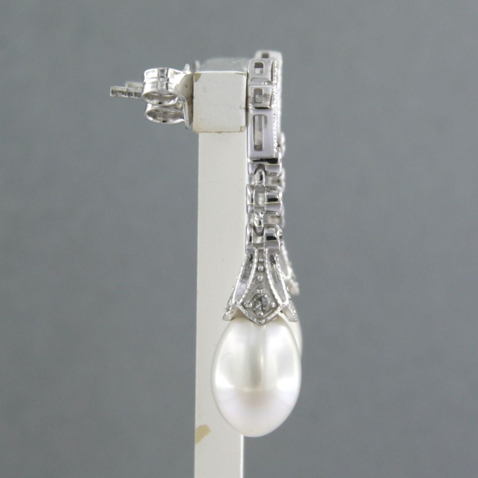 14 Kt. witgouden oorhangers bezet met parel en single cut geslepen diamant tot. 0,30ct