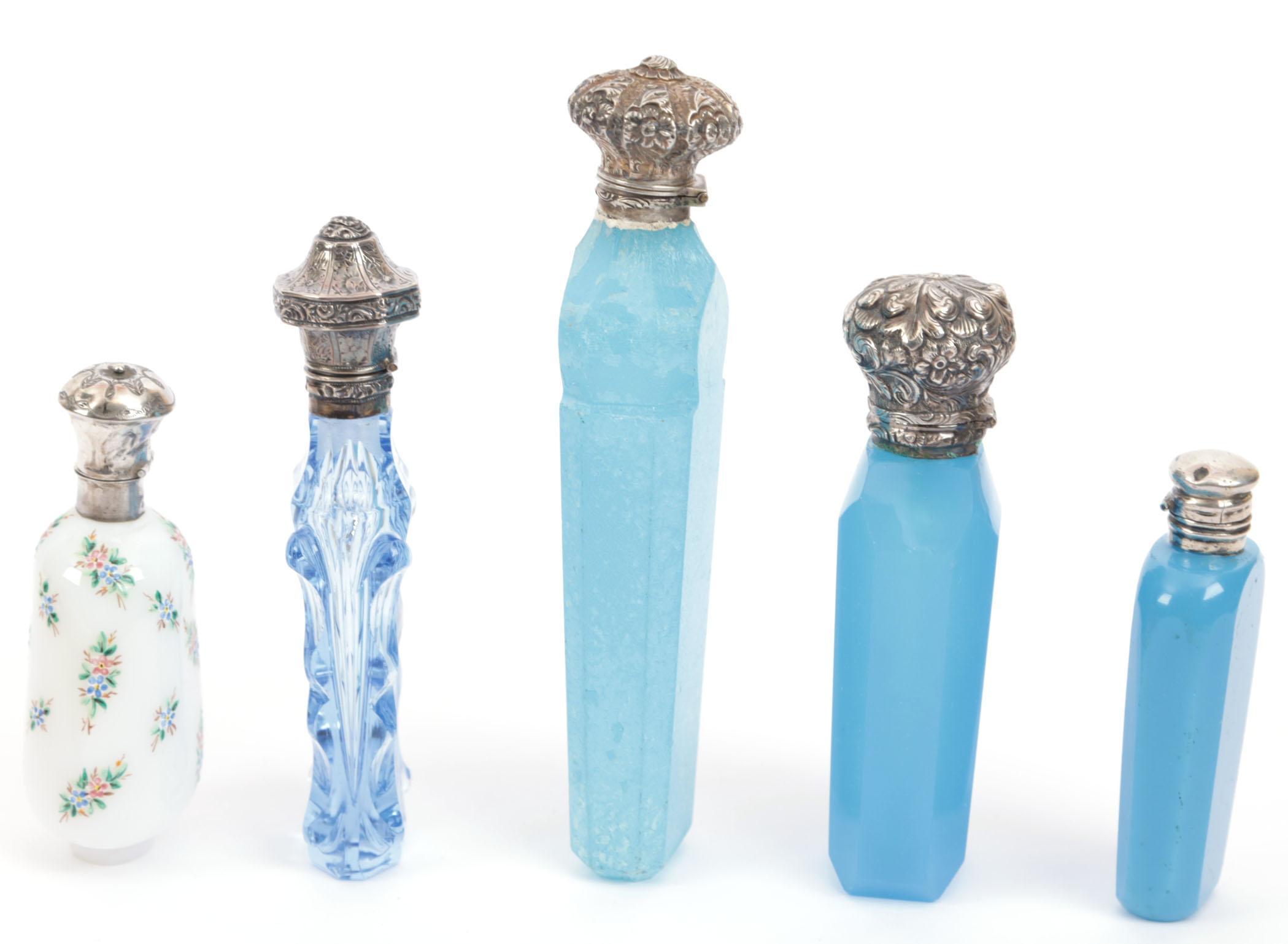 Verzameling van 5 parfumflesjes, waaronder 3 x blauw opaline flessen met zilveren dop, waarvan 2 met glazen binnenstop, 1e helft 19e eeuw-Frans, 1 transparant glazen fles met zilveren scharnierende dop, 1 witte opaline fles met emaile bloemdecoraties. scharnierende zilveren dop en glazen stopje, Nederlands keur, rond 1900, hoogte 8,5 cm