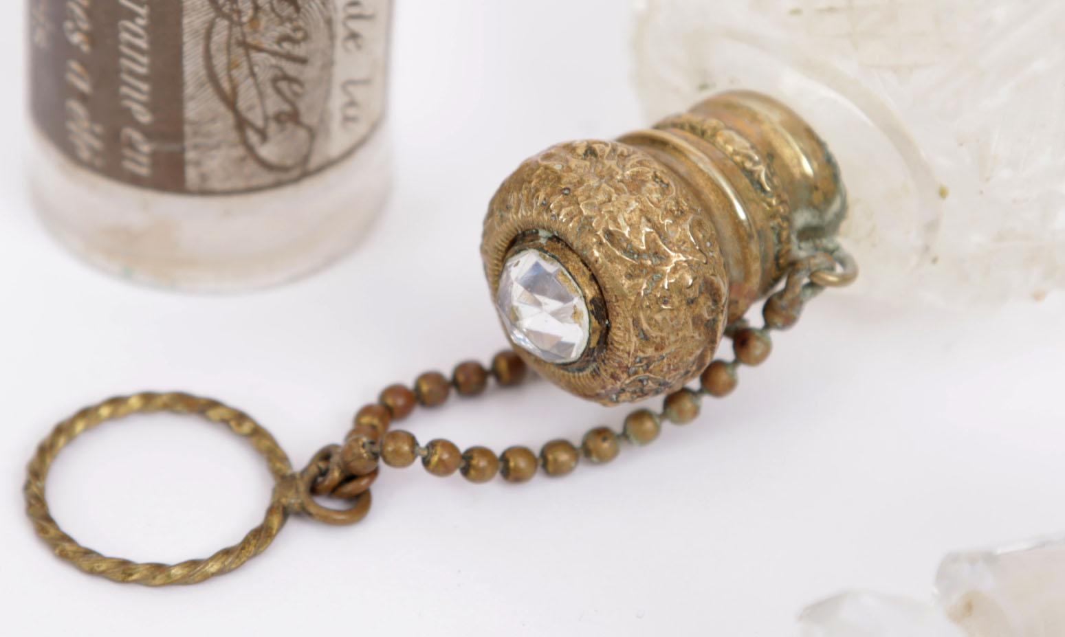 Verzameling van 4 parfumflessen, waaronder 1 hartvormige crystallen flacon met koperen scharnieren dop en ketting met ring, 1 crystallen flesje met stop, 2 glazen flessen waarvan 1 met stalen dop en 1 met kurk dop