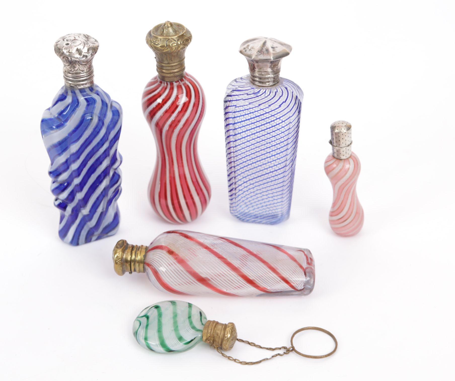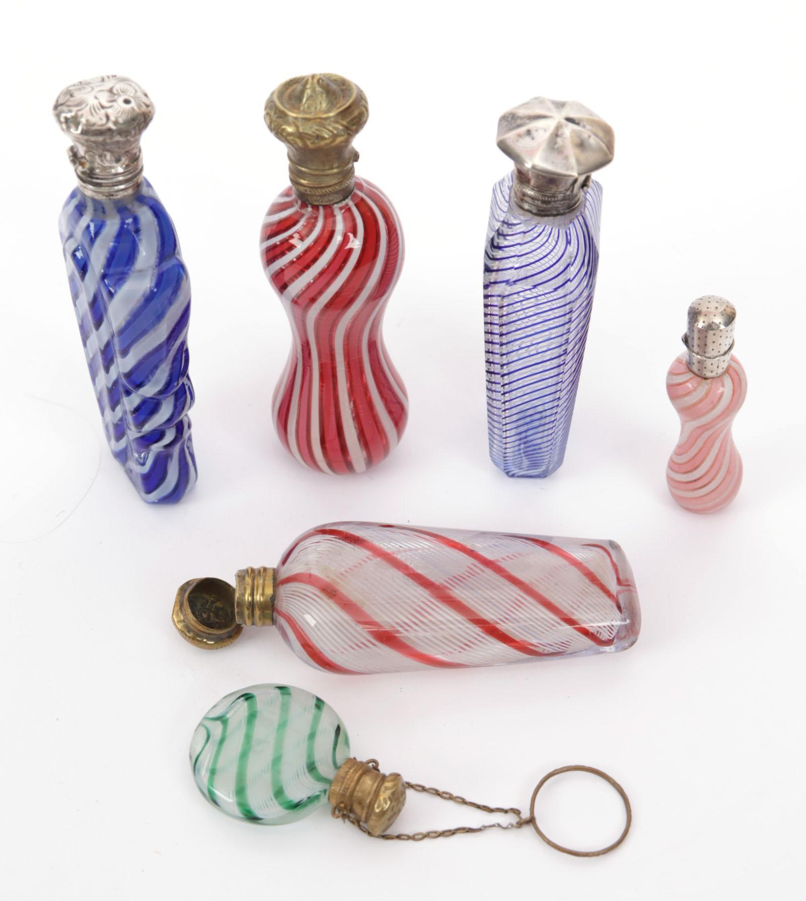 Verzameling van 6 Clichy parfumflesjes, waarvan 3 met zilveren dop en 3 met stalen dop. 1 flesje aan ketting met pinkring, begin 19e eeuw, Frans, hoogte variërend van 4,5 - 10 cm
