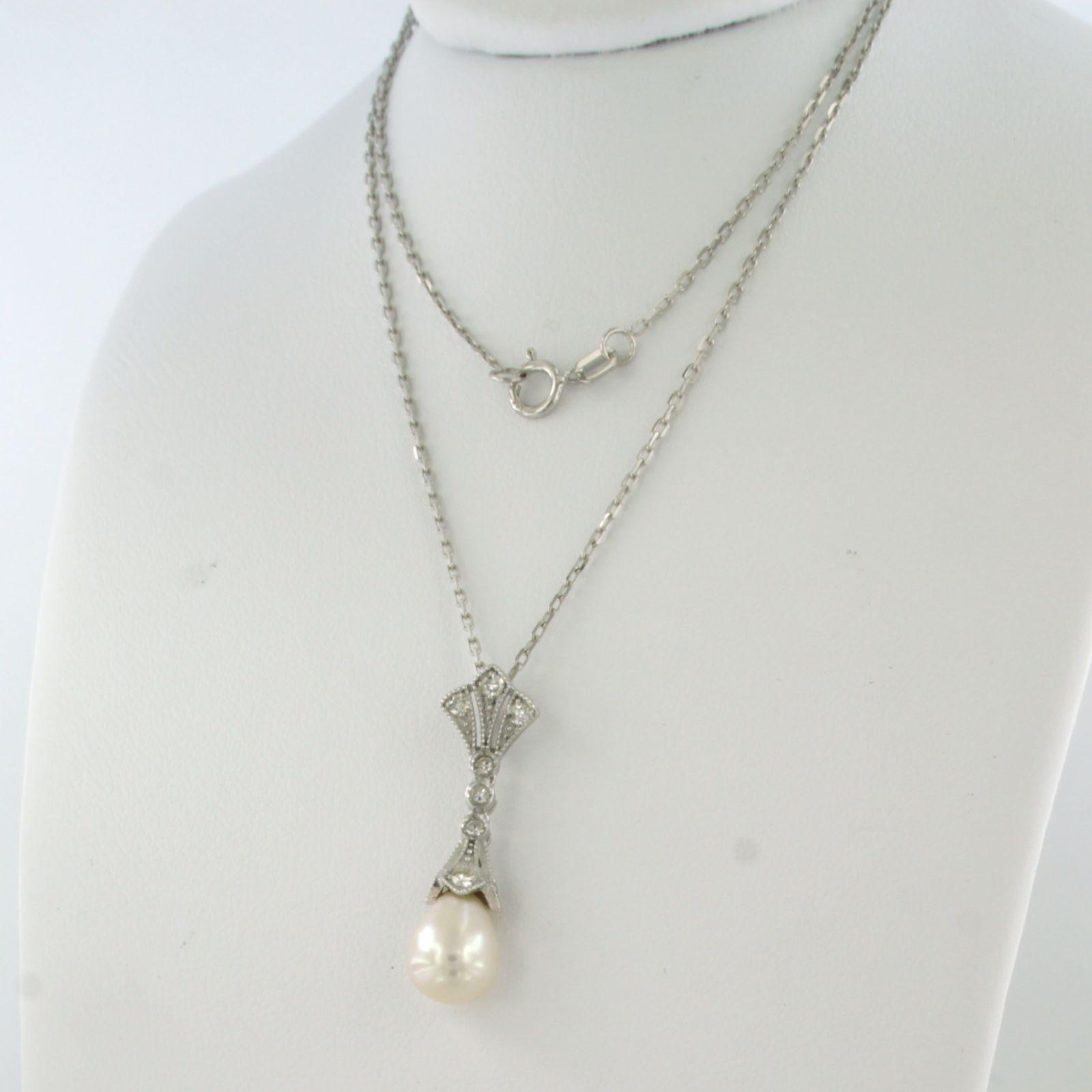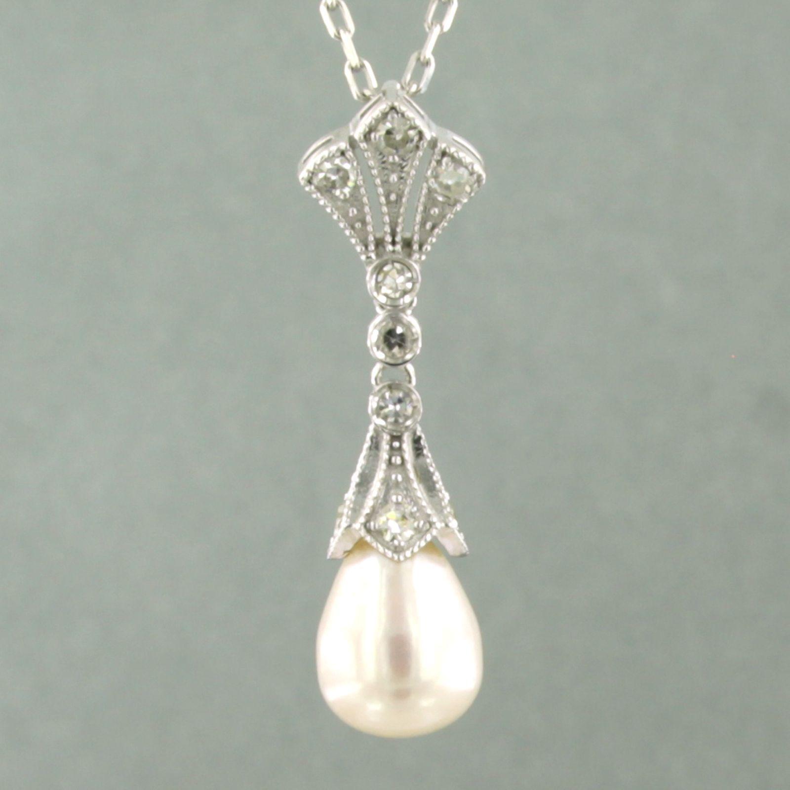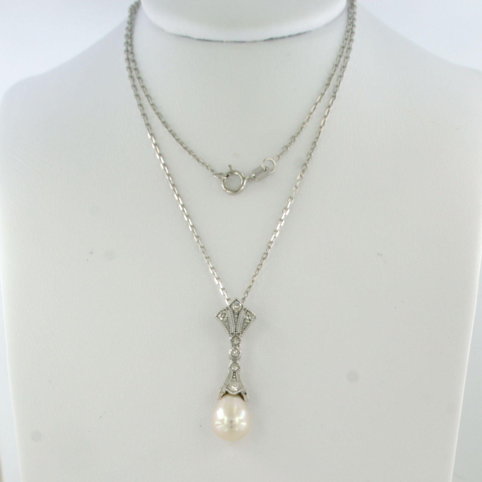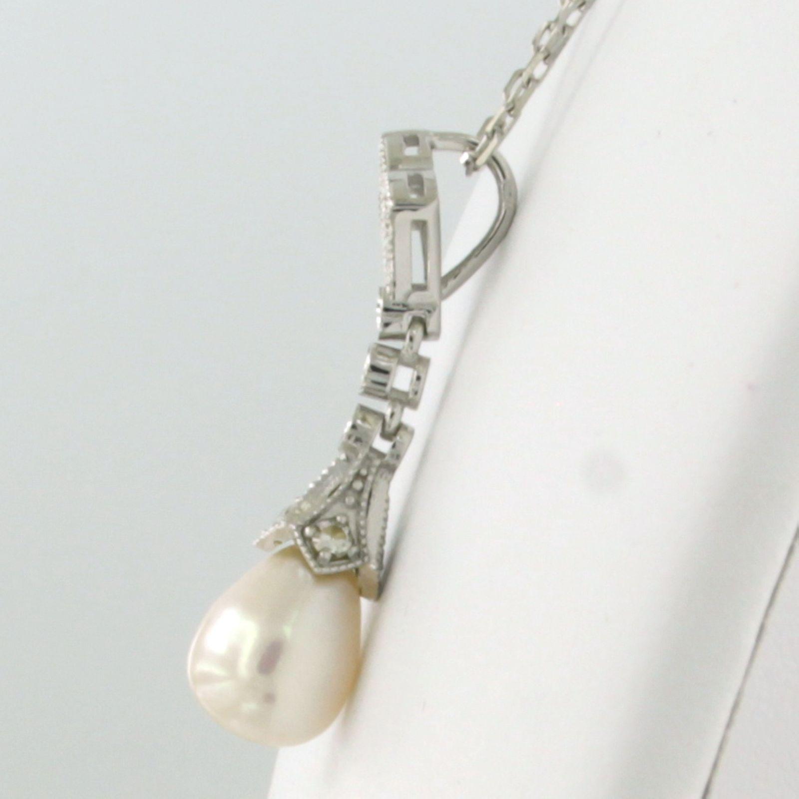 14 Kt. witgouden collier met hanger bezet met parel en single cut geslepen diamanten totaal 0.20 ct
