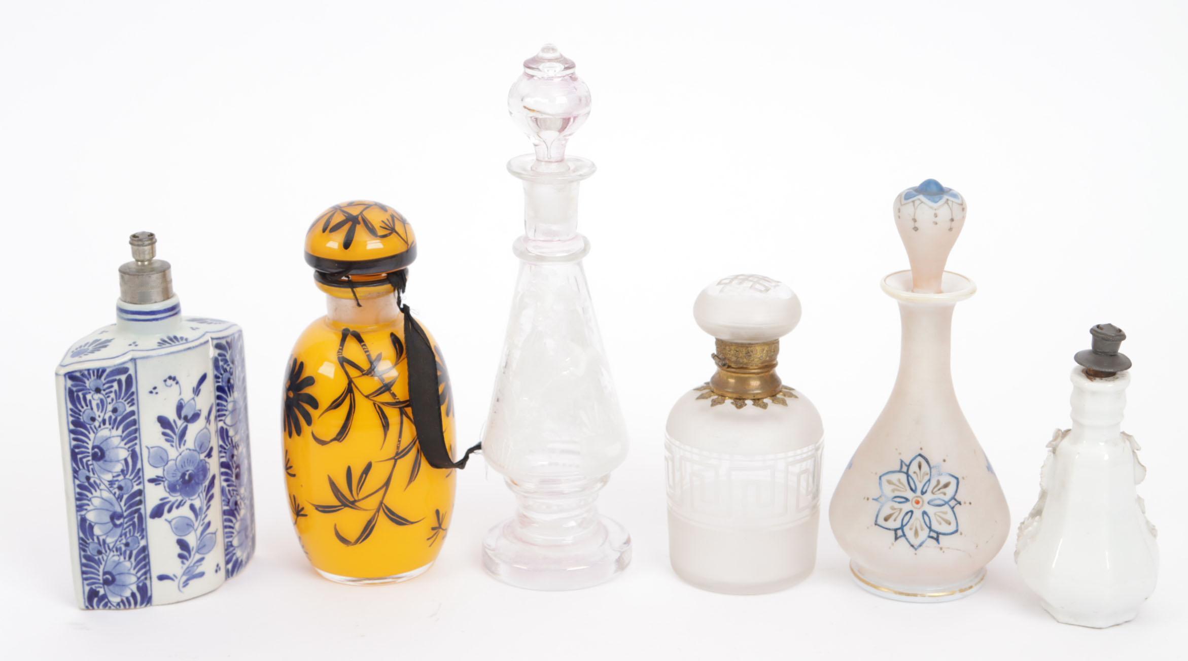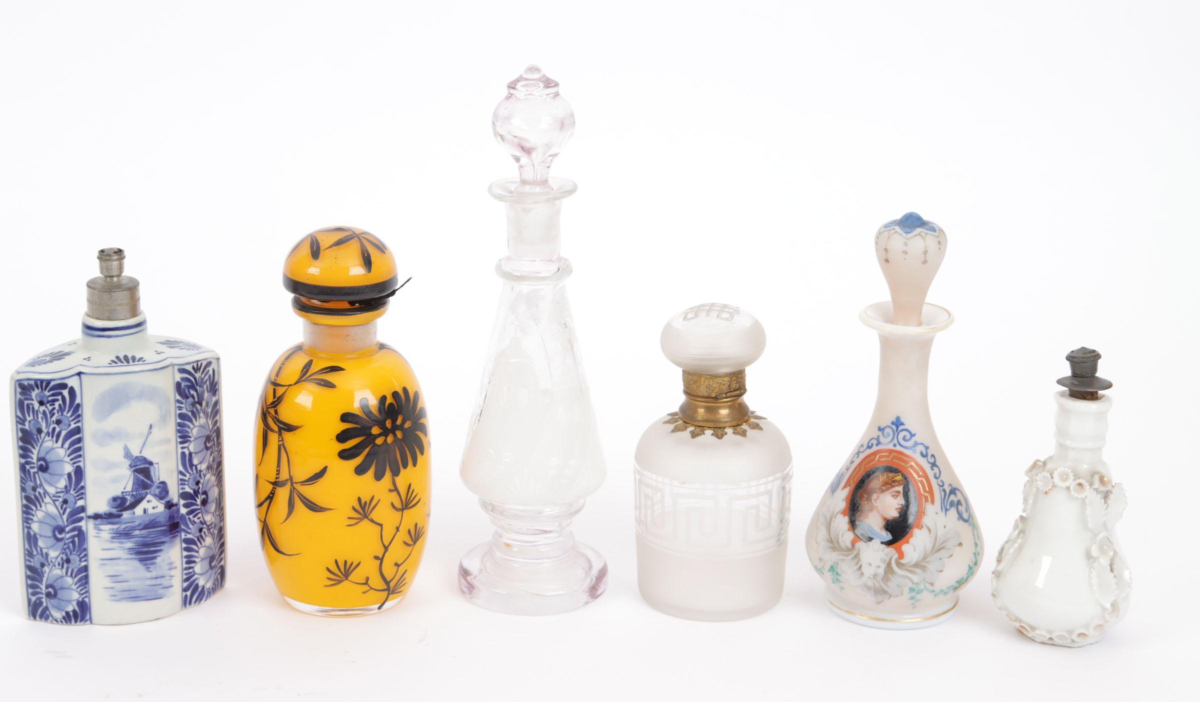 Verzameling van 6 parfumflessen, waaronder: 1 opaline flacon met polychroom beschildering, oa romeinse vrouw en profil, mid 19e eeuw, Frans, hoogte 15 cm, 1 boldootfles Mary Gregory, dop en voet roze getint, rond 1880, hoogte 19,8 cm, 1 gele glazen flacon met zwarte email beschildering, Frans, Babani?, rond 1920, hoogte 13,5 cm, 1 blauw-wit porseleinen boldootfles, hoogte 13,5 cm, 1 wit porseleinen flesje met opliggende bloemetjes en blaadjes, hoogte 10 cm, 1 glazen flesje met scharnierende dop en glazen binnenstop, hoogte 10,5 cm
