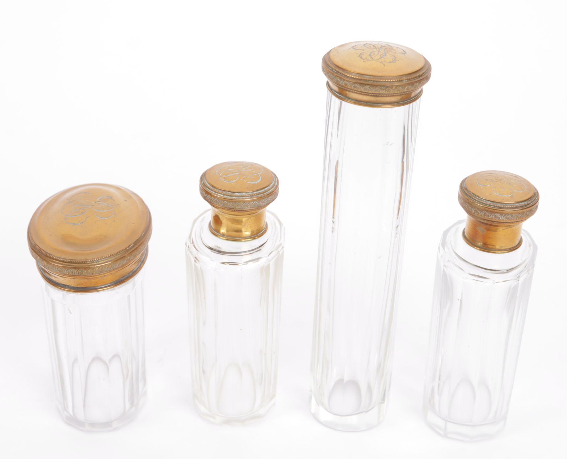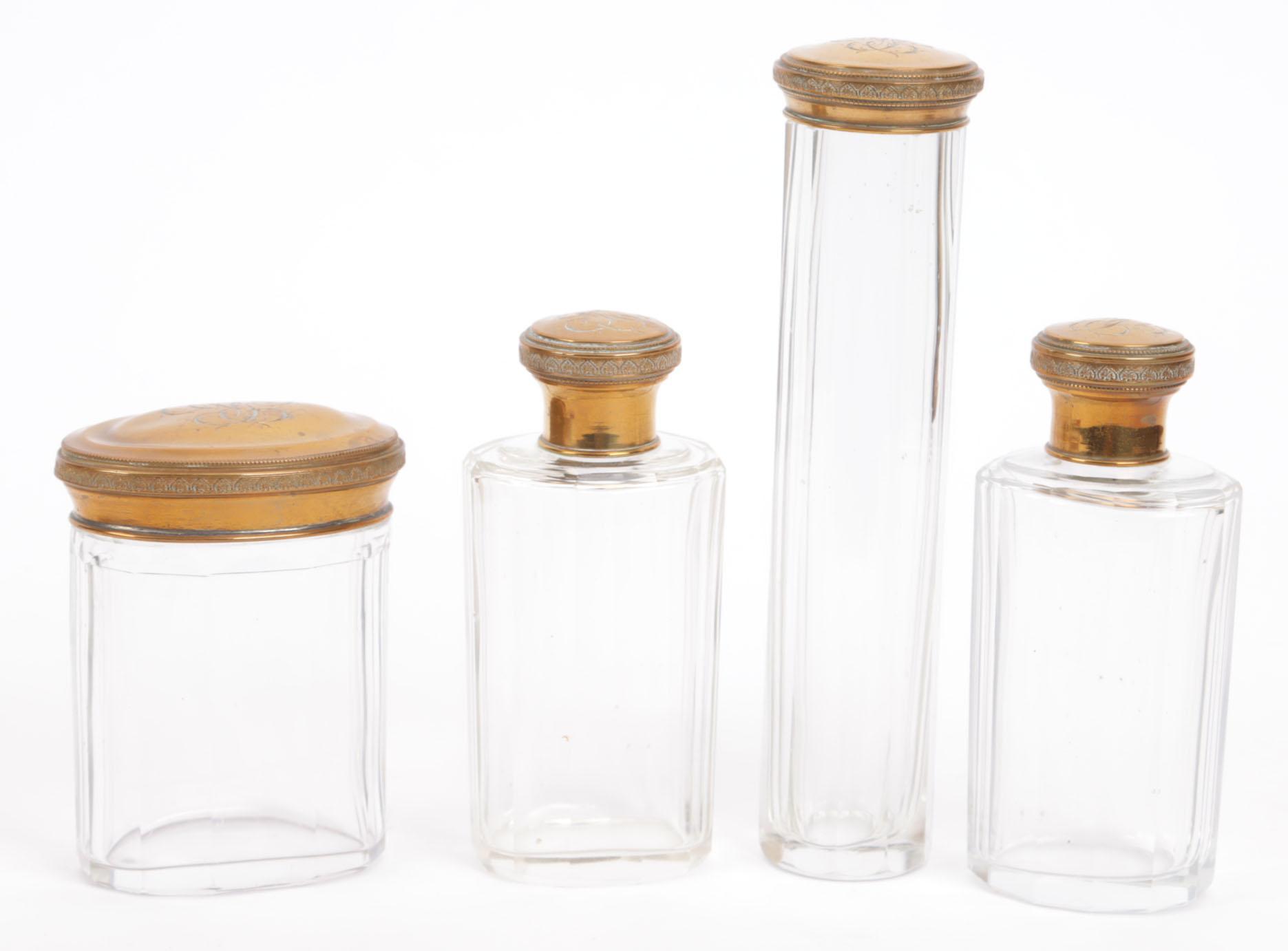 4-delige toilettafel-set waaronder 2 parfumflacons, crystal, goudkleurige metalen deksels waarop initialen RL, Frans, rond 1913, hoogte 9,5-12-17 cm