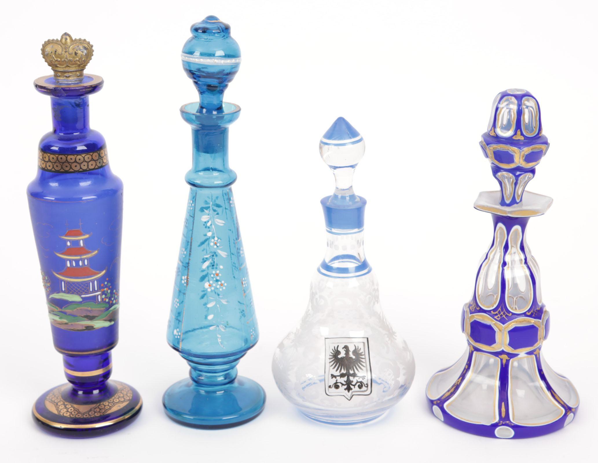 Verzameling van 4 parfumflessen, waaronder: 1 fles geëtst en met blauw emaille beschilderd, crystal, eind 19e eeuw, 1 turquoise toilettafel flacon met wit/rode emaille beschildering, eind 19e eeuw, hoogte 20,5 cm, 1 toilettafel flacon koningsblauw/wit overlay met goudbeschildering, 6-kantig Boheems, mid 19e eeuw, hoogte 17,1 cm, 1 blauwe flacon met goud- en emaille beschildering voorstellend een pagode, gouden kroon als stop, hoogte 19 cm