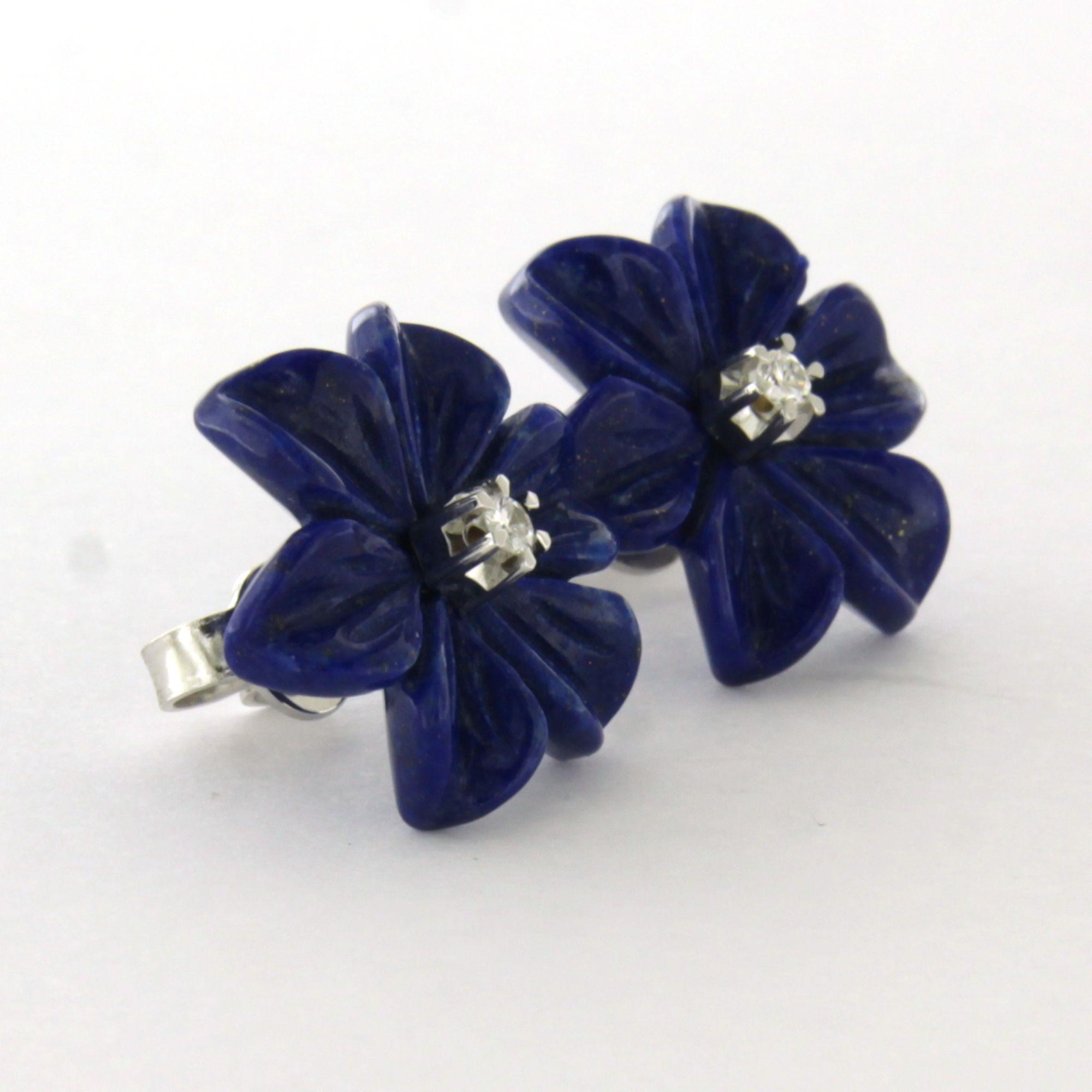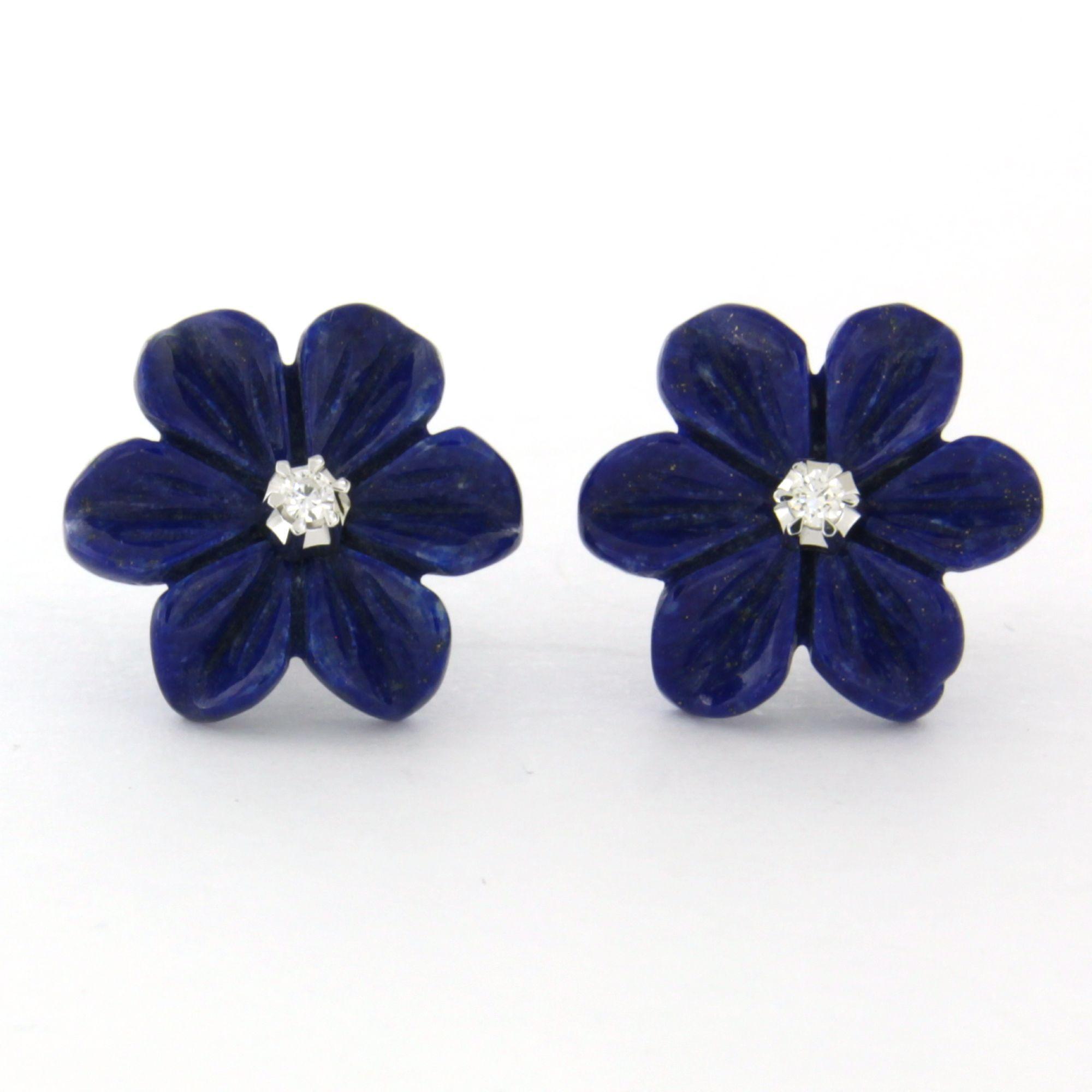 18 Kt. witgouden oorknoppen bezet met bloemvorm geslepen lapis lazuli en briljant geslepen diamanten totaal 0.08 ct