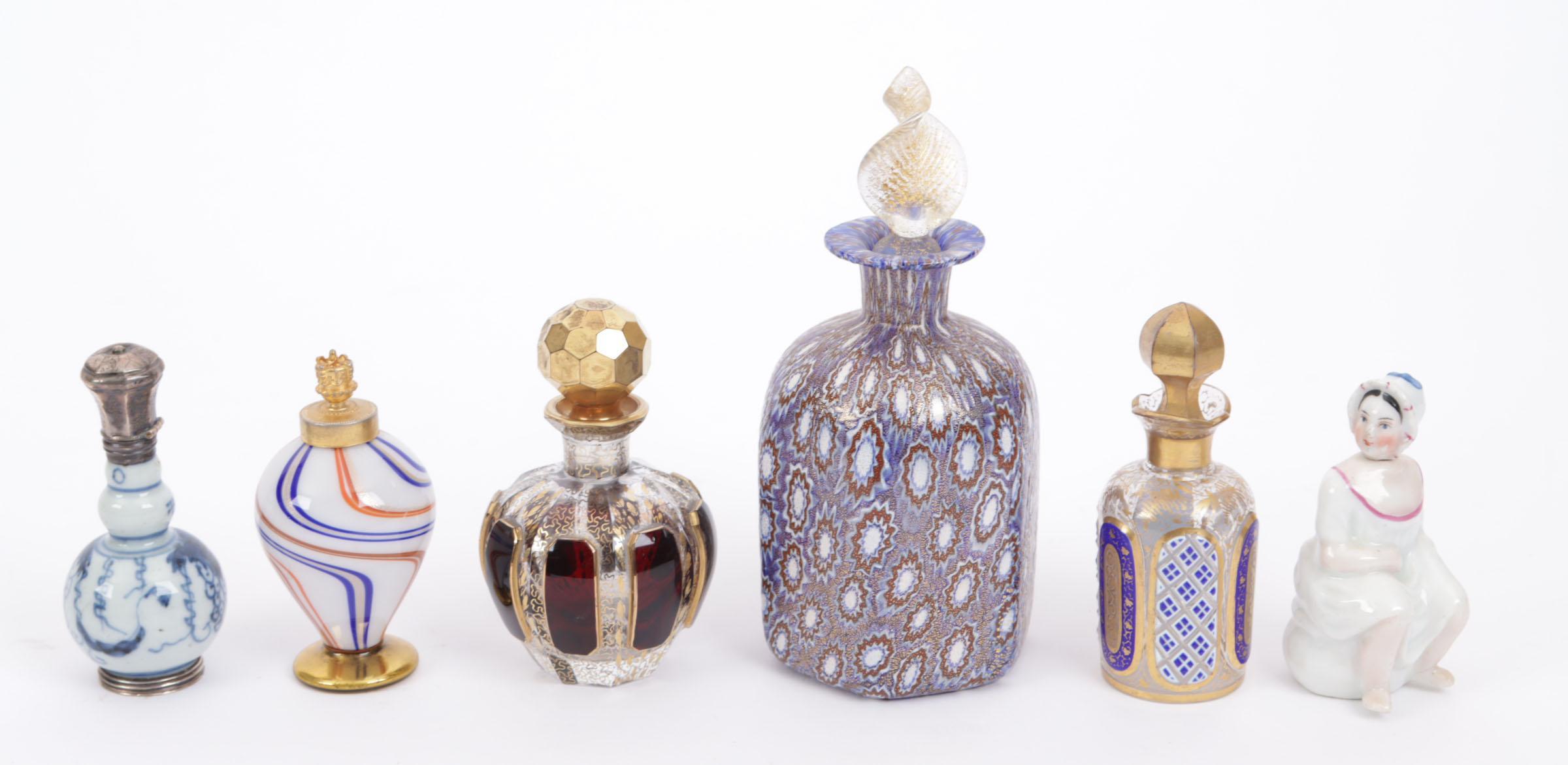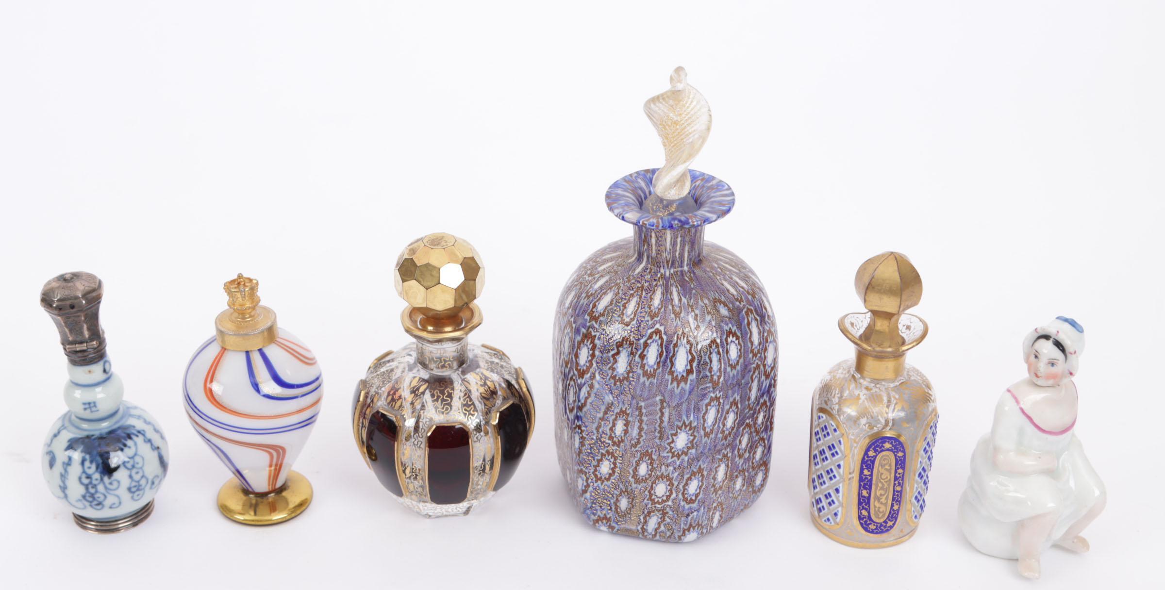 Verzameling van 6 parfumflacons, waaronder: hurkend plassend vrouwtje, biscuit porselein, Duits, eind 19e eeuw, hoogte 5,9 cm, 1 6-kantig Murano glazen flacon, bruin-blauwe motieven met goudglans, Italiaans rond 1900, hoogte 14 cm, 1 1 chinees (?) porseleinen flesje met zilveren scharnierende dop, hoogte 8 cm, 1 italiaans glazen fles op goudkleurig voetje, hoogte 8 cm, 1 glazen flesje met blauw/wit overlay en gouden beschildering, hoogte 9 cm, 1 bolvormig glazen flesje met wijnrood overlay en gouden beschildering, hoogte 9 cm