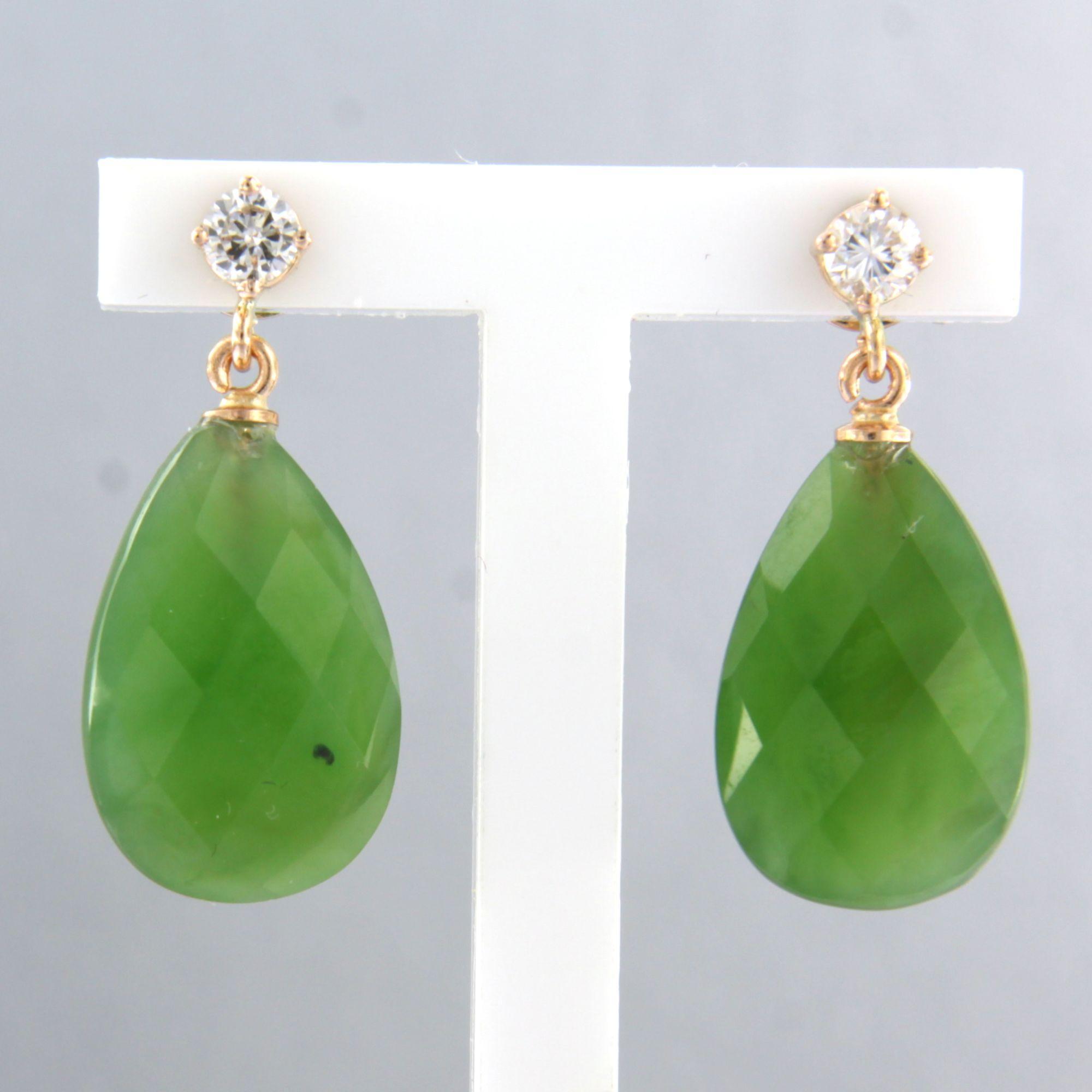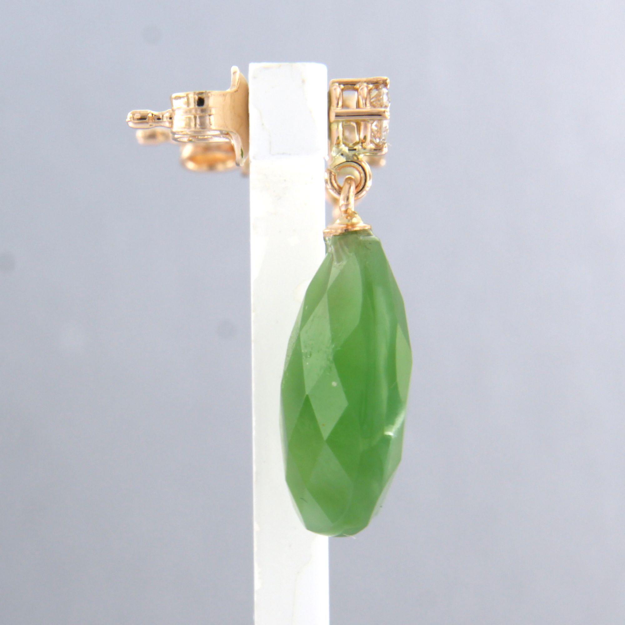 18 Kt. roodgouden oorhangers bezet met jade en briljant geslepen diamanten totaal 0.22 ct