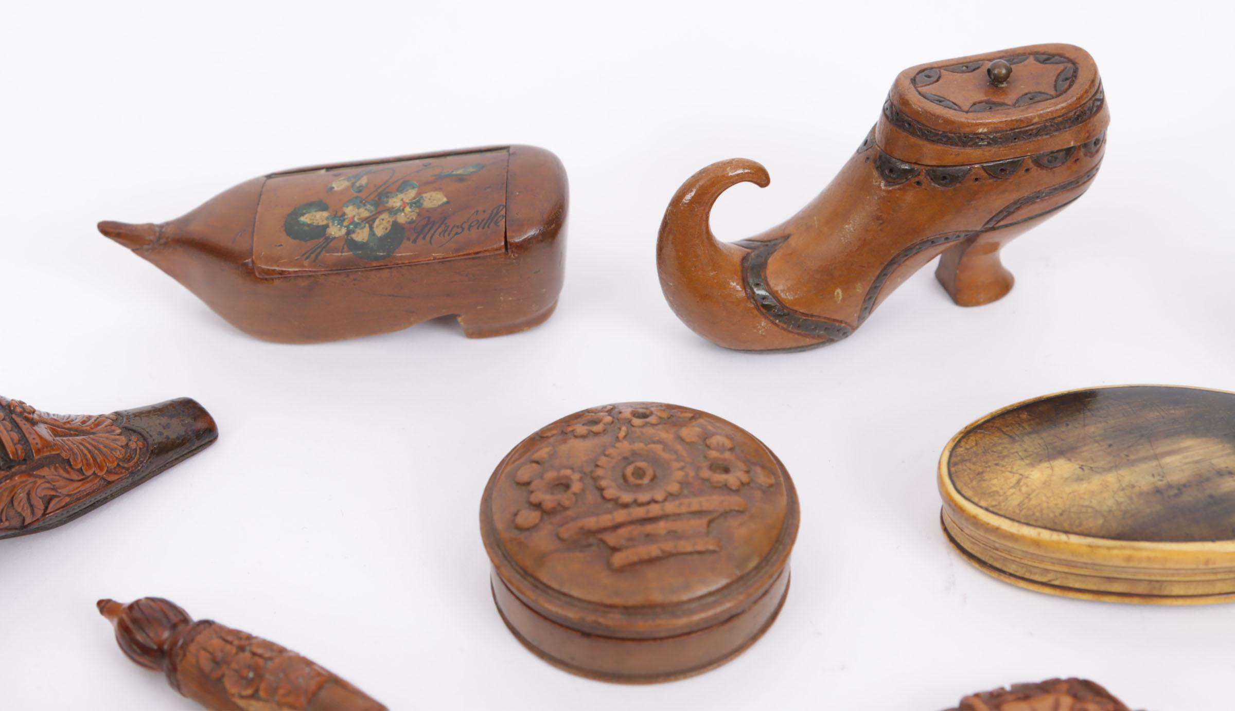 Verzameling van 12 houten en noten items, waaronder 5 snuifdoosjes in de vorm van houten schoentjes, rond 1800, 3 noten flesjes met decoratie, rond 1820, 1 rond houten doosje met bloemmotief op deksel, doorsnede 5,5 cm, 1 ovaal benen doosje, 8x4,4 cm, 1 fraai handgesneden kokertje met schroefsluiting, hoofde op de kop, lengte 12 cm, 1 houten flesje, handgesneden, vaasvormig met engelen decoratie aan beide zijden, benen stopje, hoogte 5,6 cm .