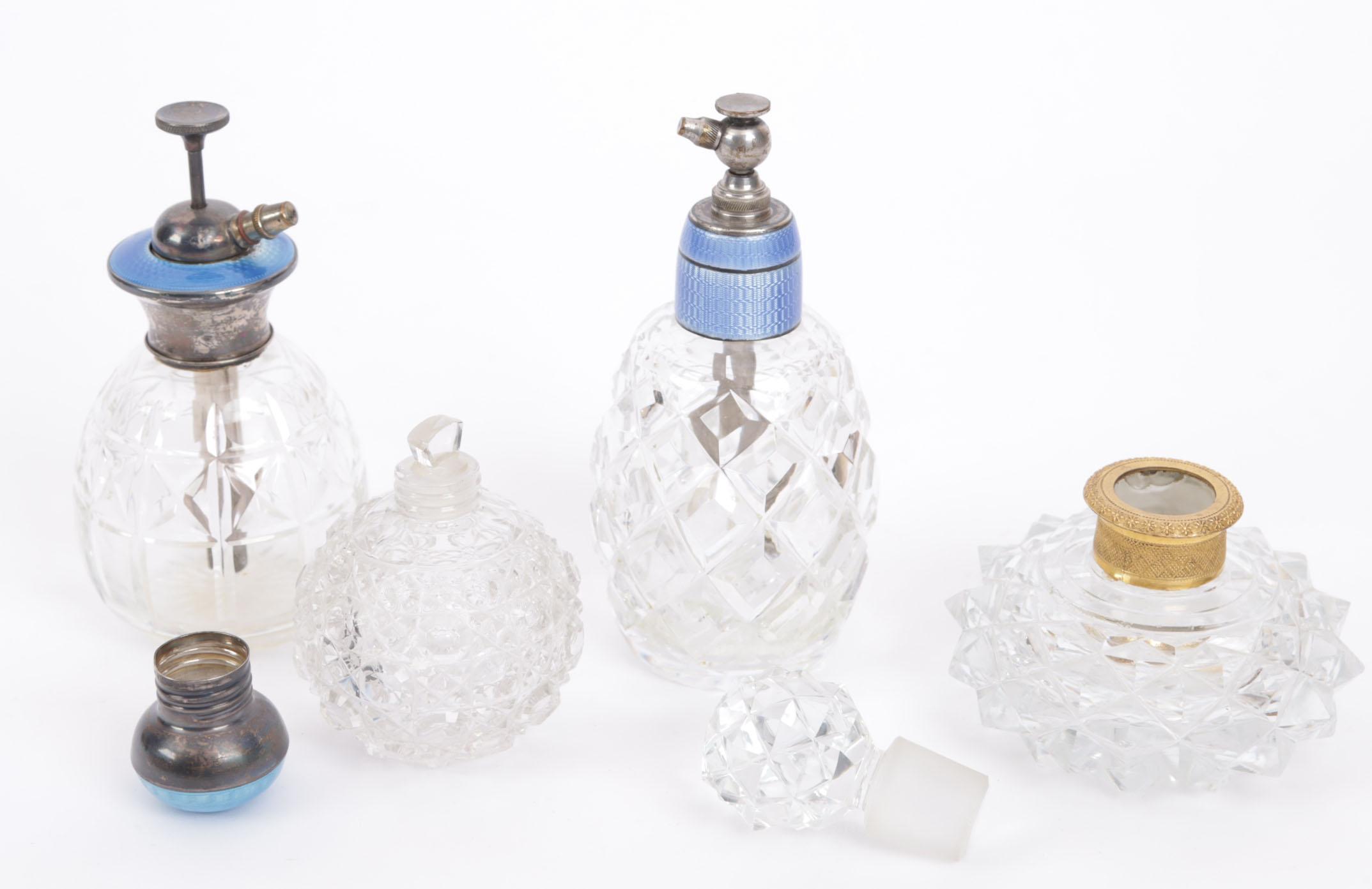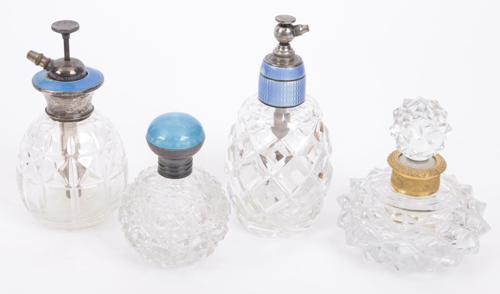 4 toilettafel parfumflessen, waaronder: 1 crystallen vaporisateur met zilveren dop, blauw emaille guilloché bovenkanr, pomp en mechanisme 'sterling silver' gemerkt, Engels begin 20e eeuw, hoogte 12,5 cm, 1 crystallen bolvormige fles, diamantslijpsel, zilveren schroefdop, met guilloche blauw emaille bovenkant, dop gemerkt met S = Zweden en 3 kroontjes, glazen binnendop, rond 1920, hoogte 9 cm, 1 barokke tafelflacon, goudkleurig montuur w.i. dop die op dezelfde manier geslepen is, Frans, 19e eeuw, hoogte 10 cm, 1 crystallen flacon met lichtblauw geëmailleerde bovenkant, hoogte13 cm