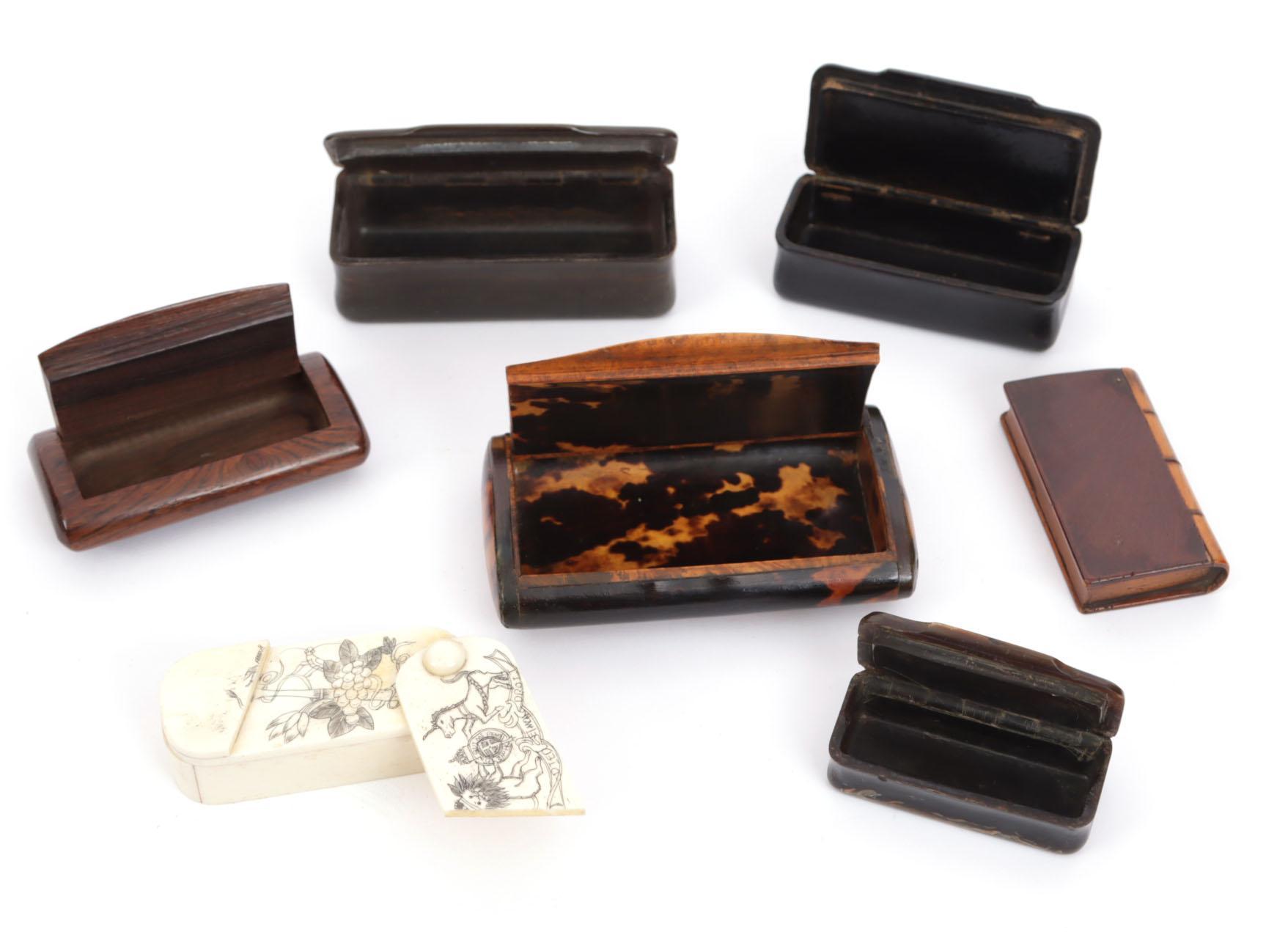 Verzameling van 7 houten en benen snuifdoosjes, waaronder: benen doosje met ruitvormig motief waarin zilveren motief, 19e eeuws, 1 langwerpige snuifdoos met ingelegd hoorn in meerdere bruintinten, Schots?, 19e eeuws, papiermacyhe doosje met op scharnierend deksel kubussen, 19e eeuws, houten doosje in vorm van boek, licht en donker hout met op binnenzijde schuurpapier om lucifers aan te strijken, begin 19e eeuw, Frans? 1 benen doosje waarvan het deksel kan opendraaien en dan komt ander motief tevoorschijn, 1 houten doosje met scharnierend deksel waarin bloemmotief van parelmoer, 1 houten doosje met scharnierend deksel waarop ingelegd een klavertje 4 van metaal