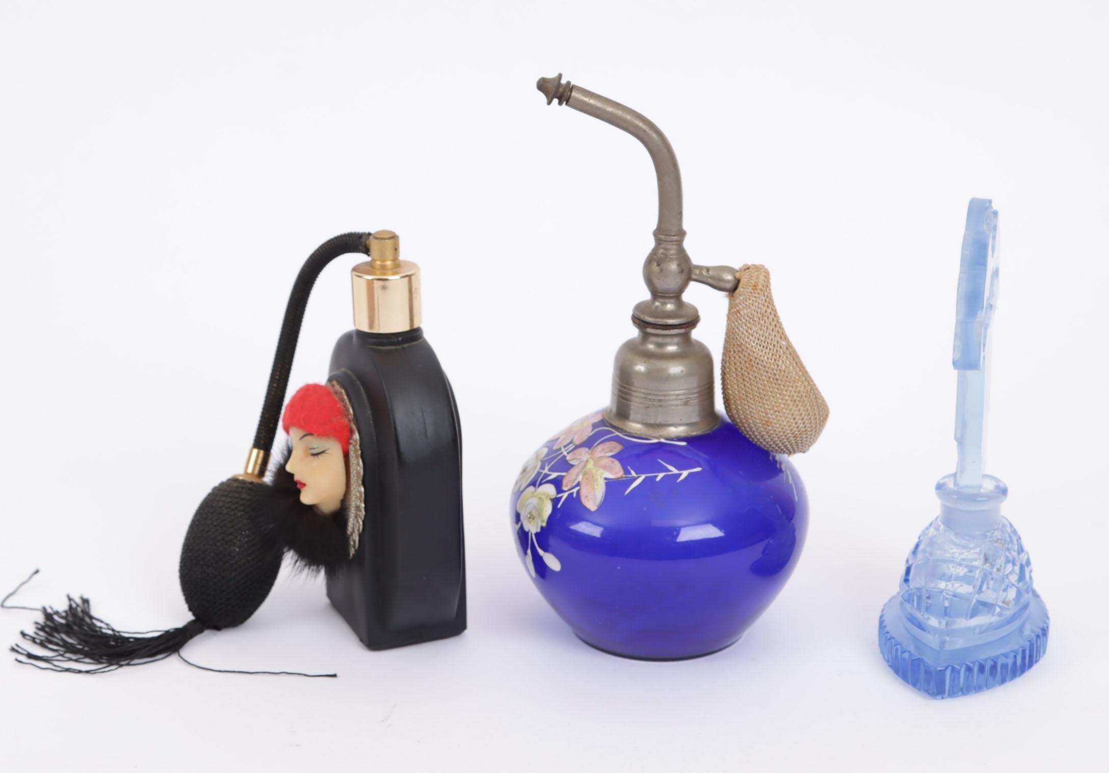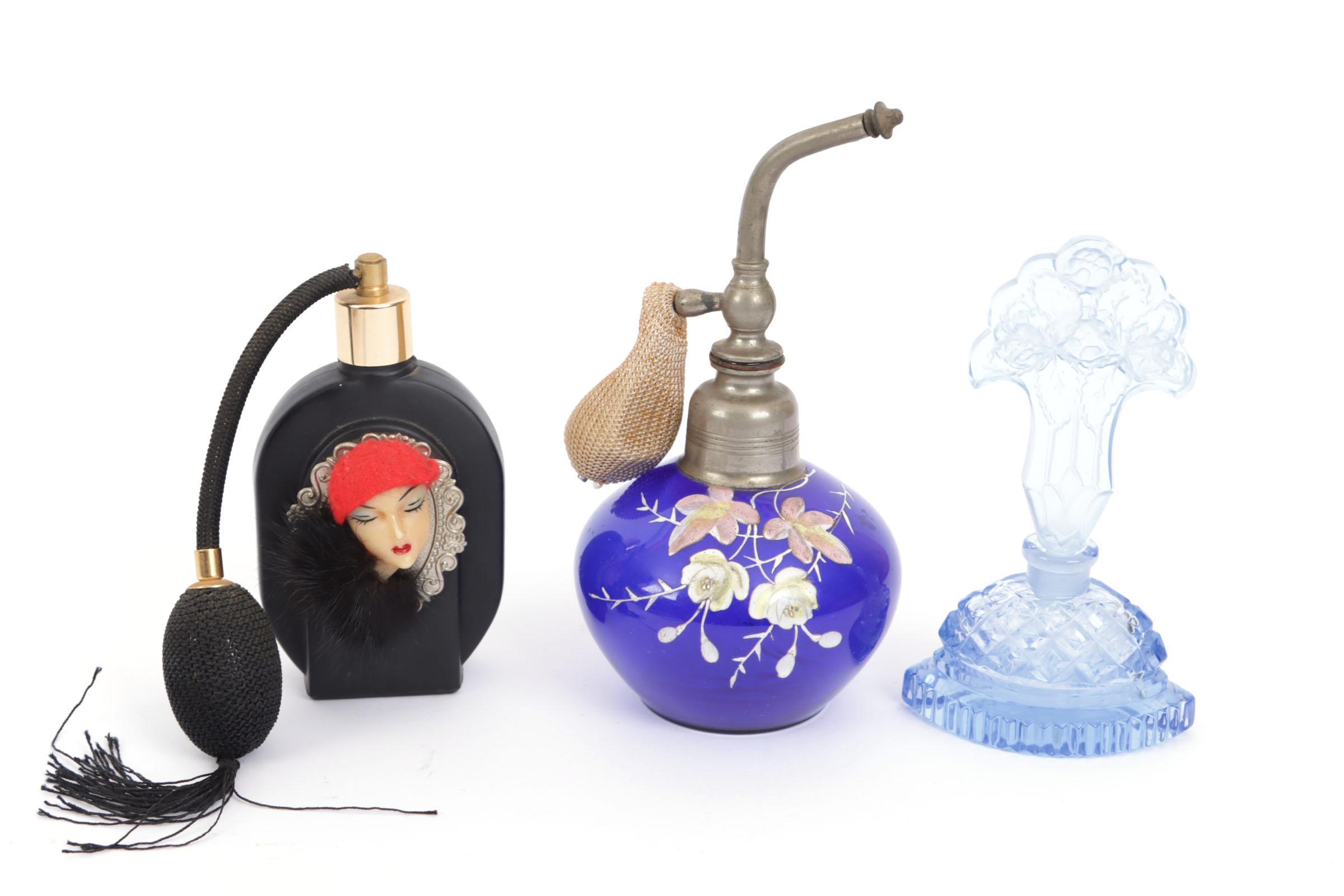 Verzameling van 3 parfumflessen, waaronder: 1 zwart glazen flacon, vaporisateur met zwarte verstuiver, vrouwenkopje met rode hoed en zwarte bontkraag, Fabriqué a Taiwan, 50er jaren?, hoogte 12,2 cm, 1 bolvormige blauwe glazen verstuiver met email bloemmotieven, tinkleurig montuur en grijze ballon, hoogte 17 cm, 1 lichtblauwe glazen fles, bloembormen op stop, hoogte 14,2 cm