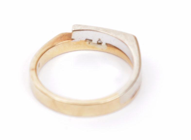 14 Kt. wit met geelgouden ring bezet met briljant, diam.17 mm., 4.6 gram