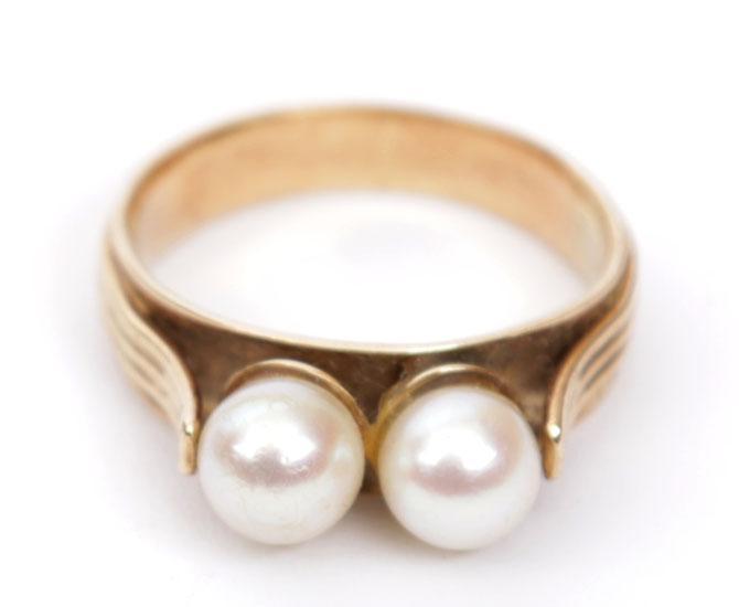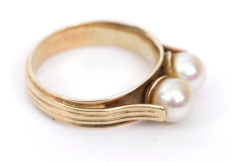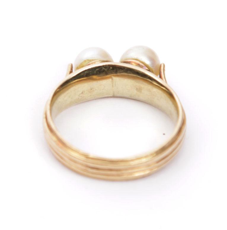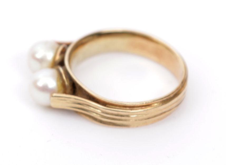 14 Kt. gouden damesring bezet met 2 parels, diam.18 mm., 5.4 gr.