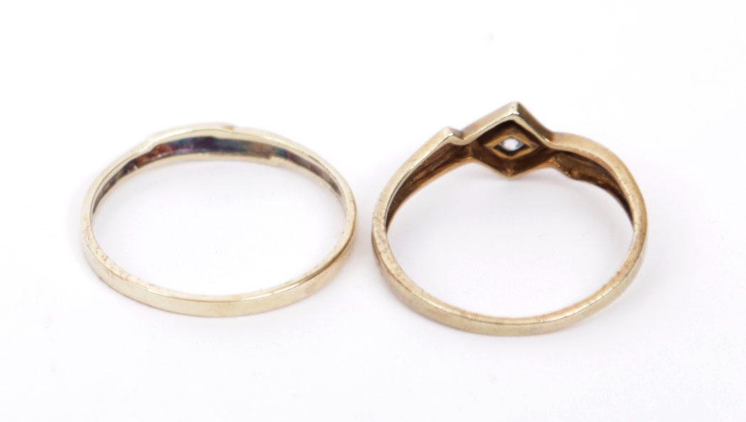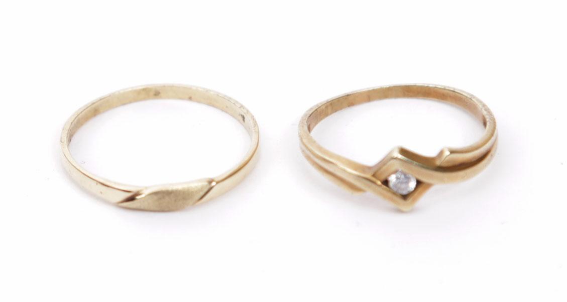 Twee 14 kt. gouden damesringen o.a. bezet met zirkonia, rm 15,5 en 16