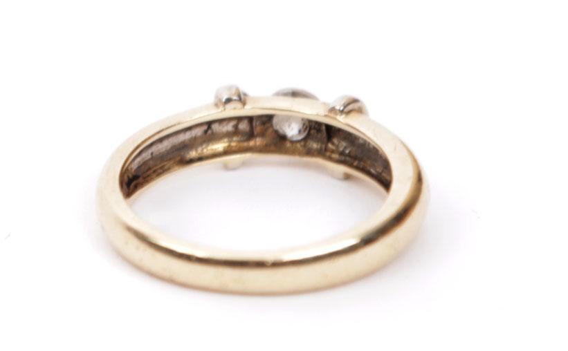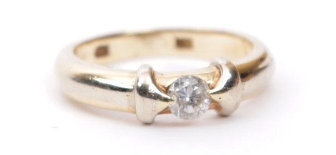 14 Kt. gouden damesring bezet met briljant, 16 mm., 3.5 gram