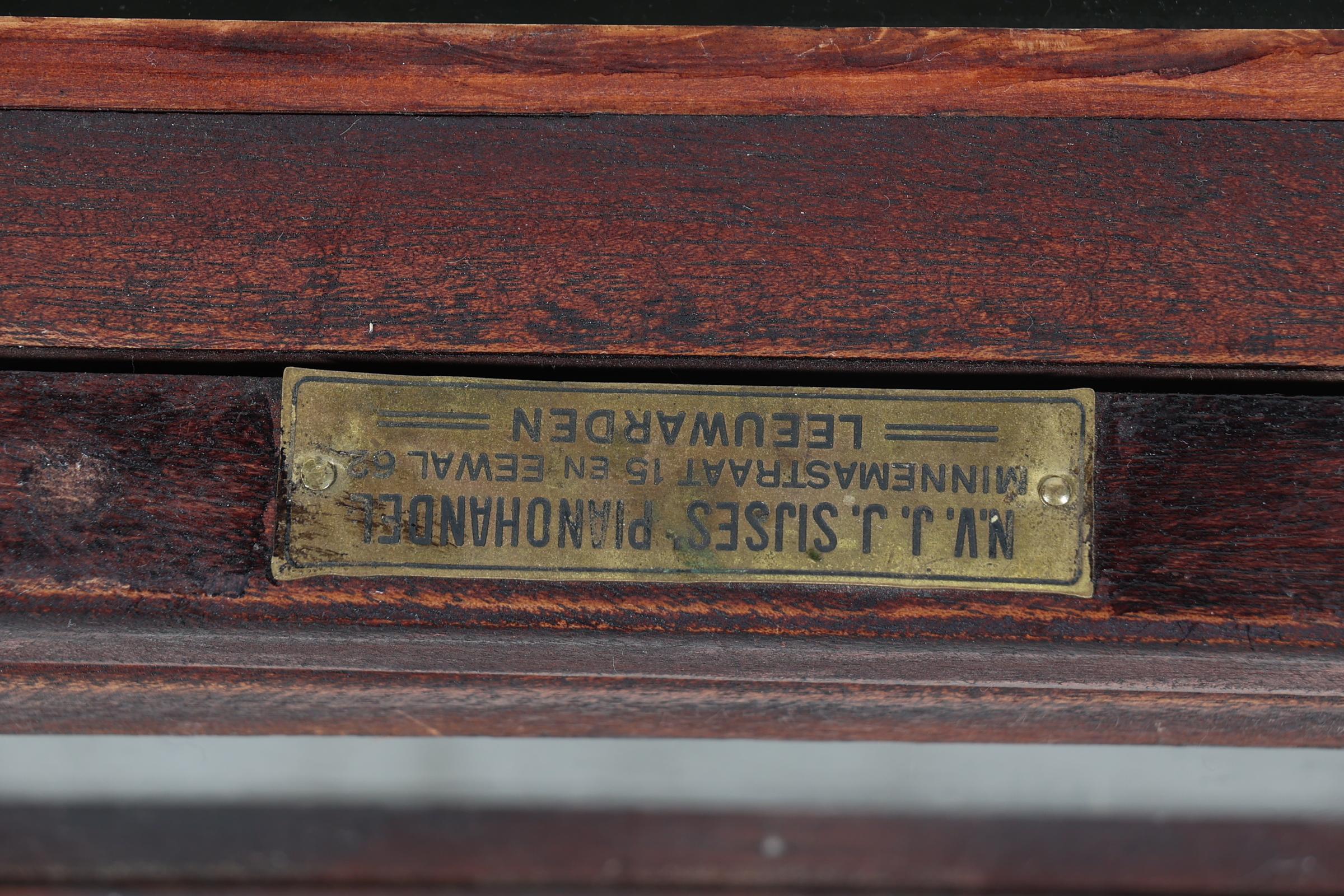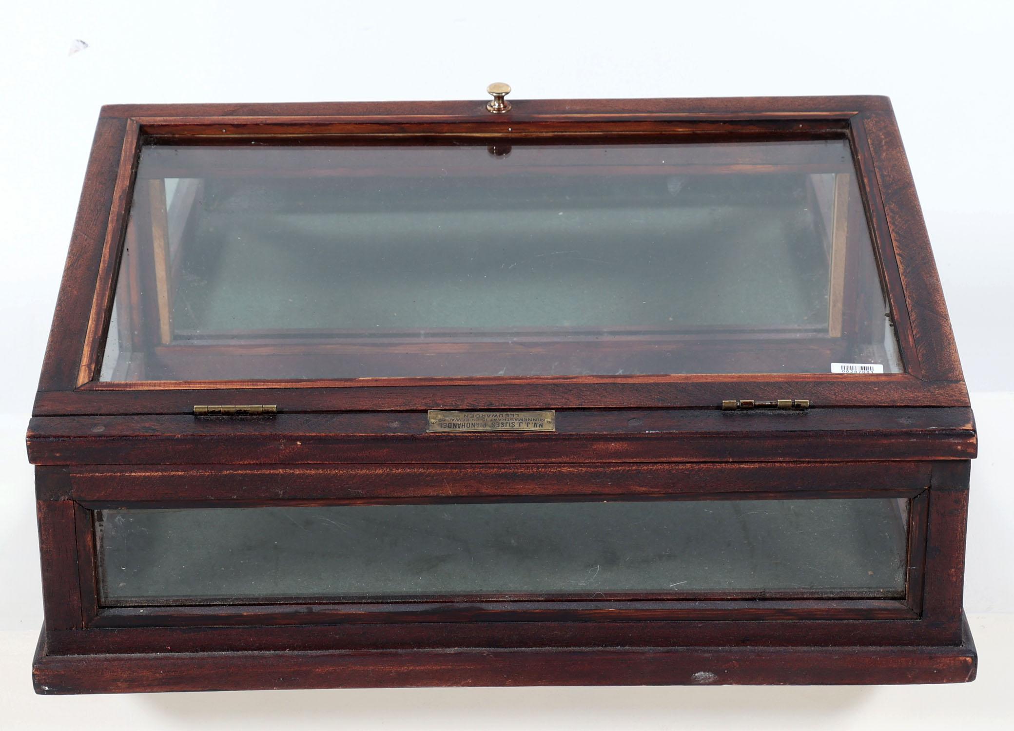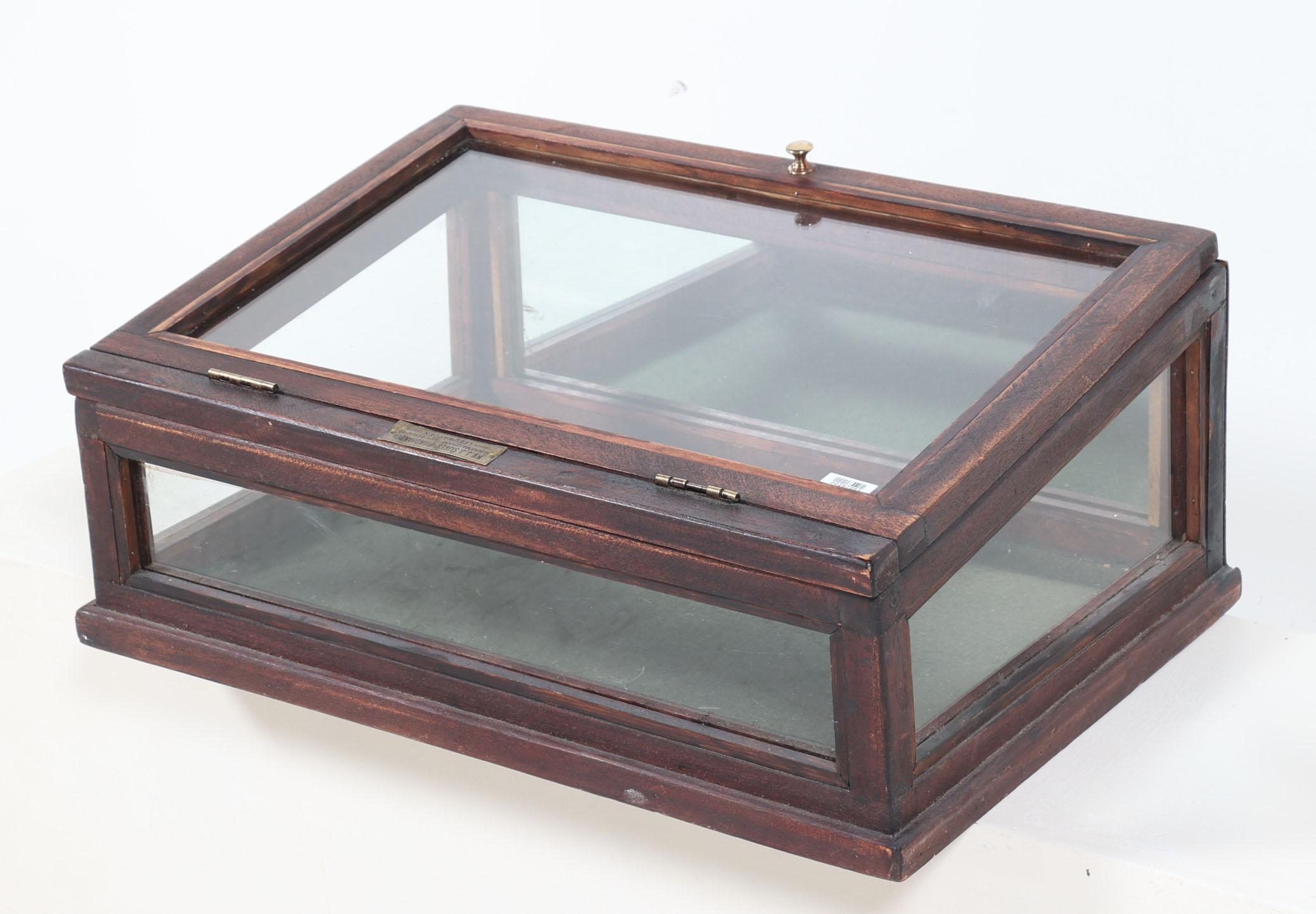 Oude gebeitste houten tafelvitrine met groen vilten blad