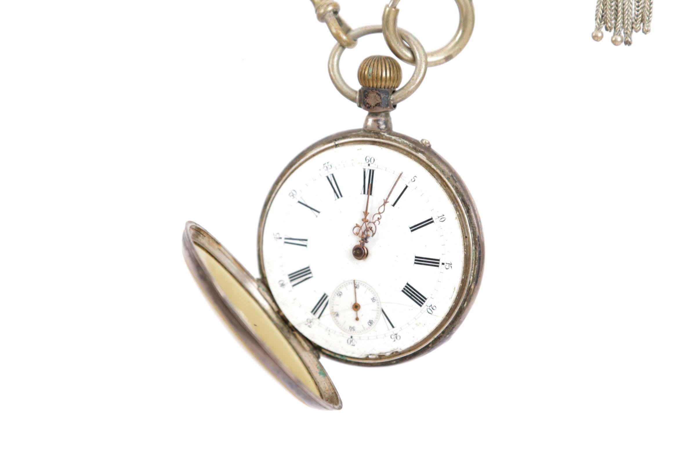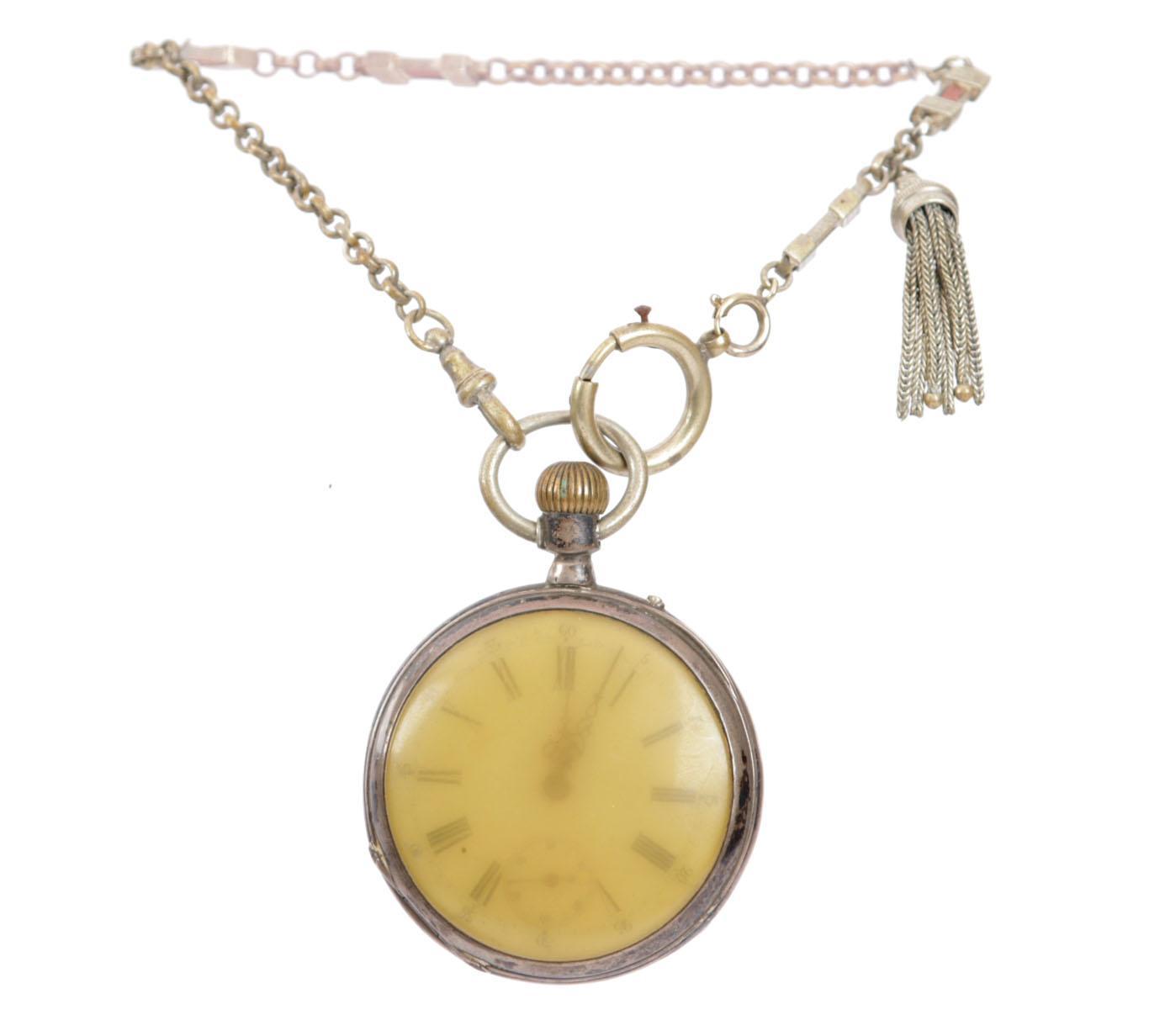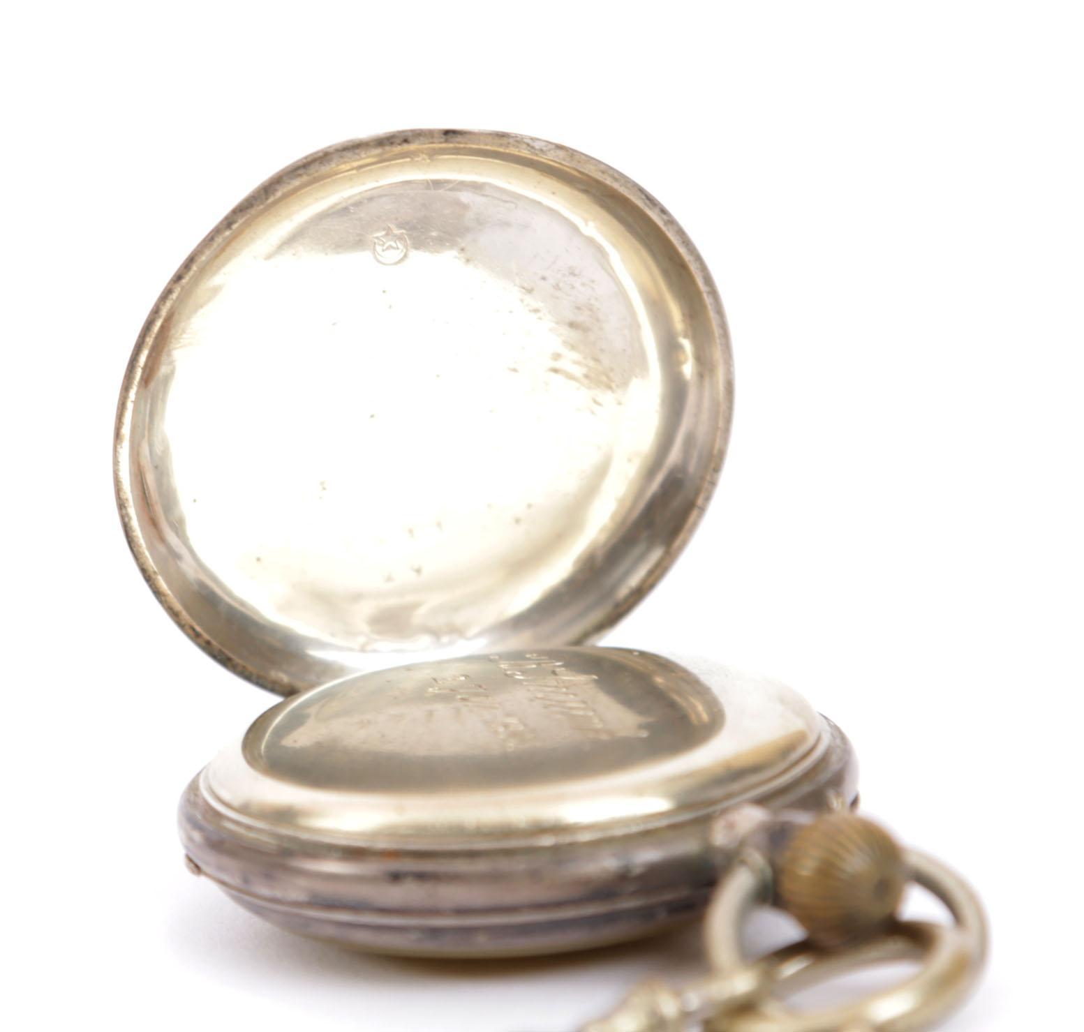 Antiek vestzakhorloge in 2e gehalte zilveren kast met horlogeketting