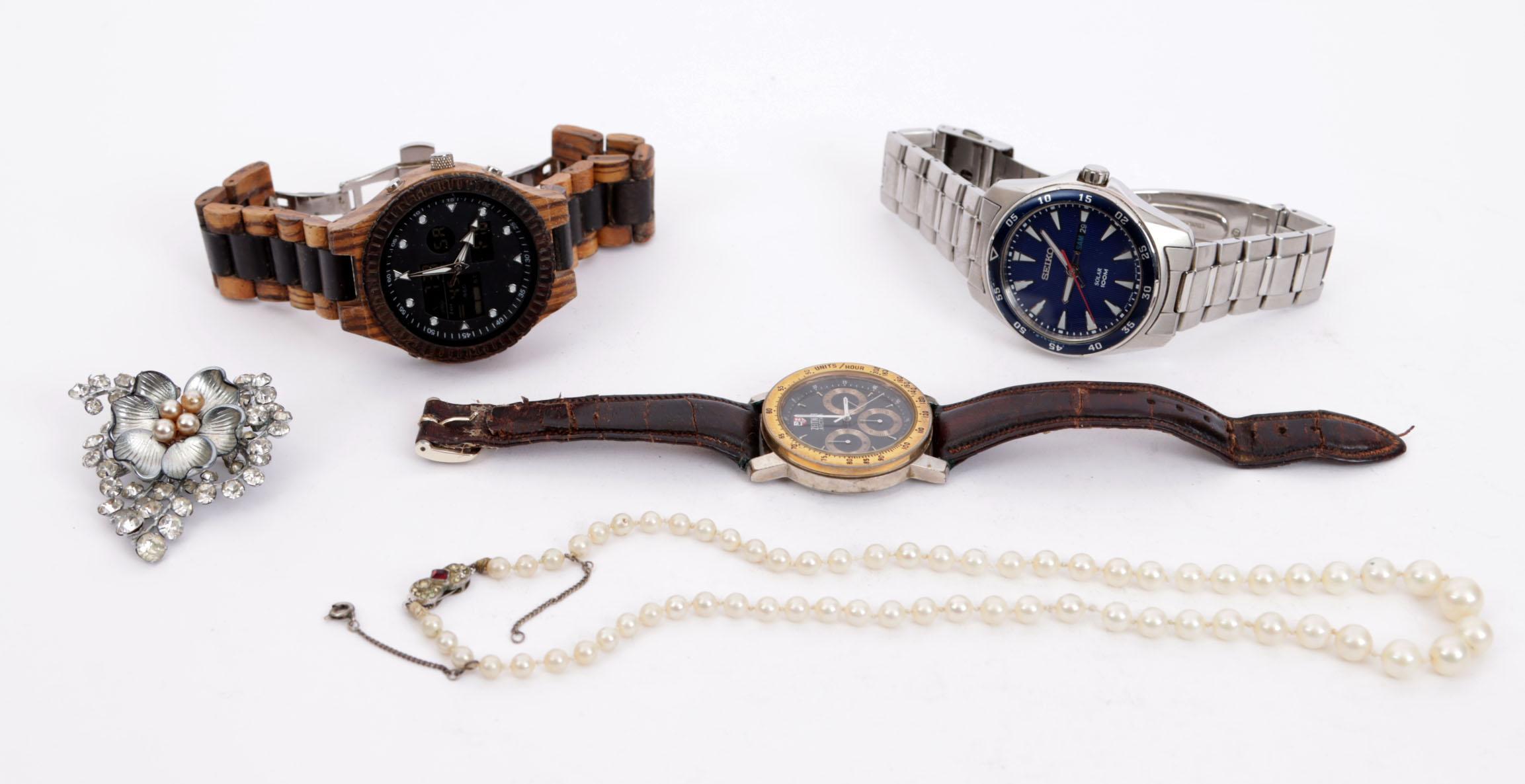 Seiko herenpolshorloge met stalen band, 2 herenhorloges en divers bijoux