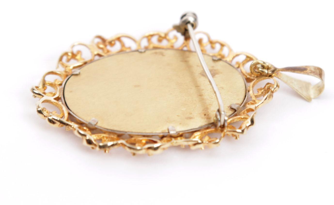 14 Kt. gouden broche/hanger met geschilderd portretminiatuur, totaal 8,5 gram