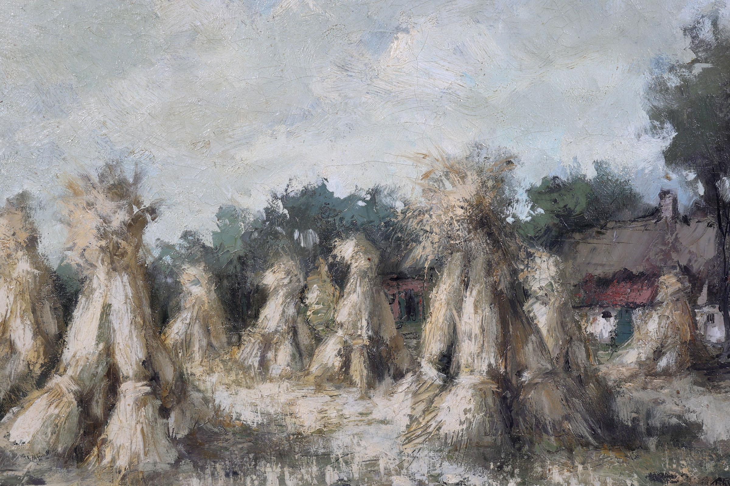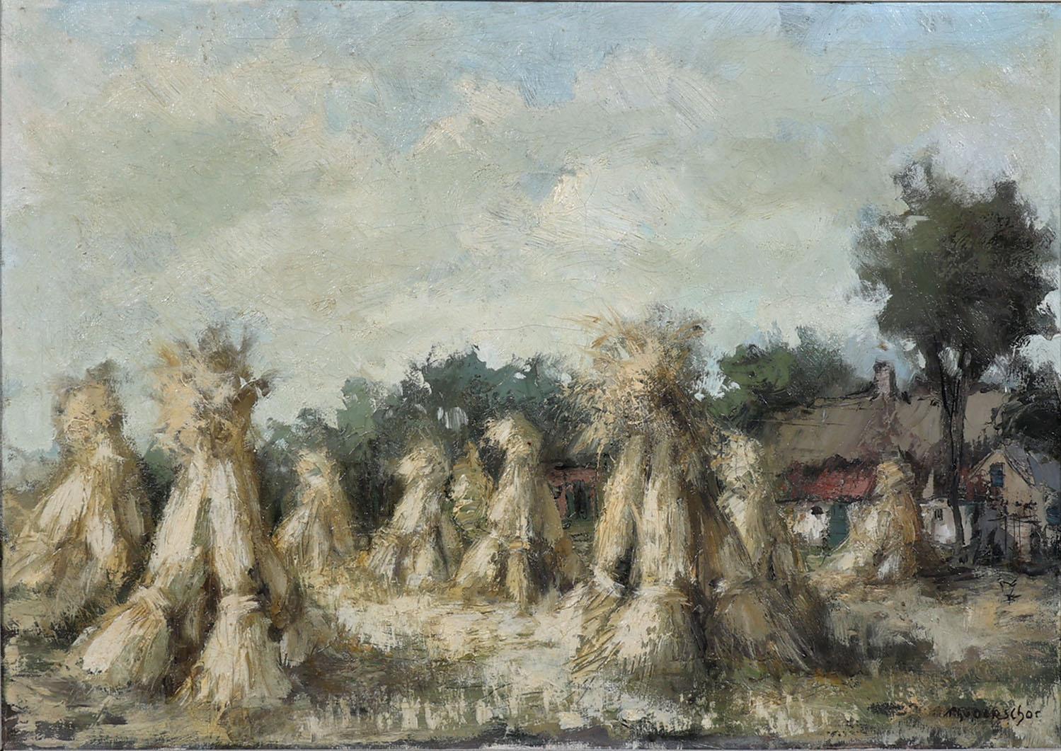 M. Van Oorschot, Korenschoven met boerderij, olieverf op doek, 70 x 50 cm.