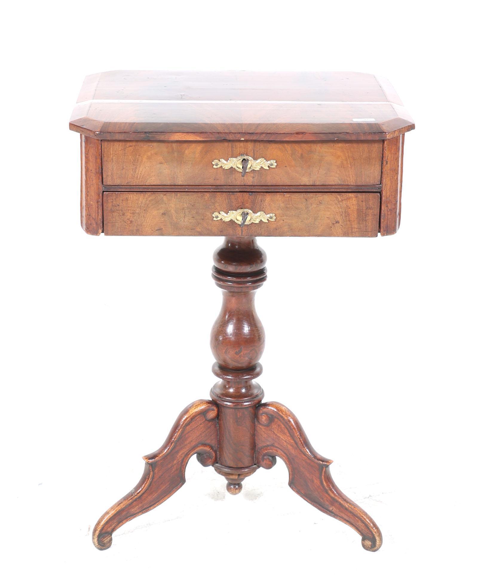 Antieke notenhouten naaitafel op 3-spanpoot, h.77 x b.53 x d.41 cm.