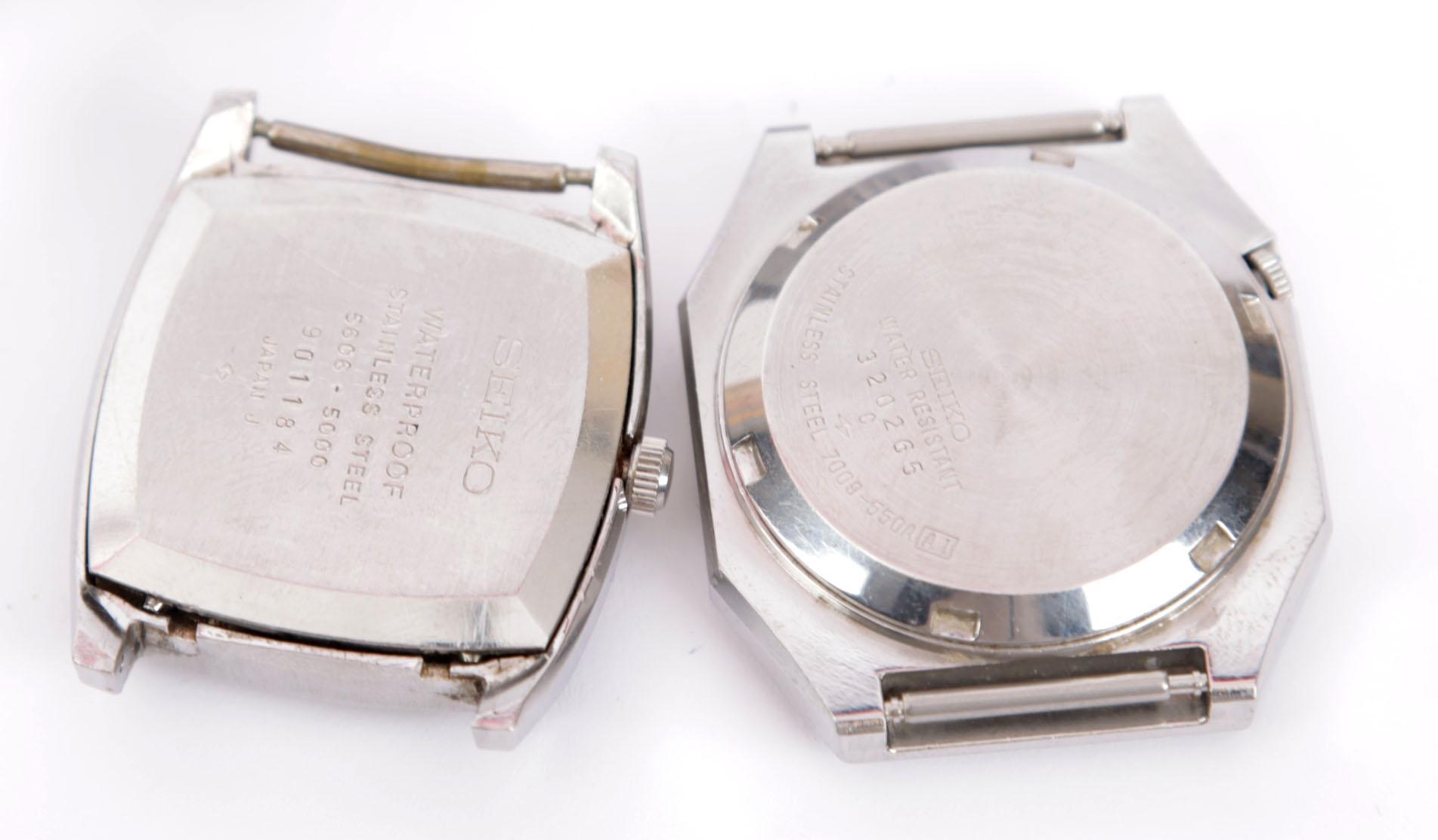 Koop met 3 vintage seiko herenpolshorloges, 1 volledig met band en twee kasten, Twee maal Seiko 5 en een Seiko load matic LM 5605-5000