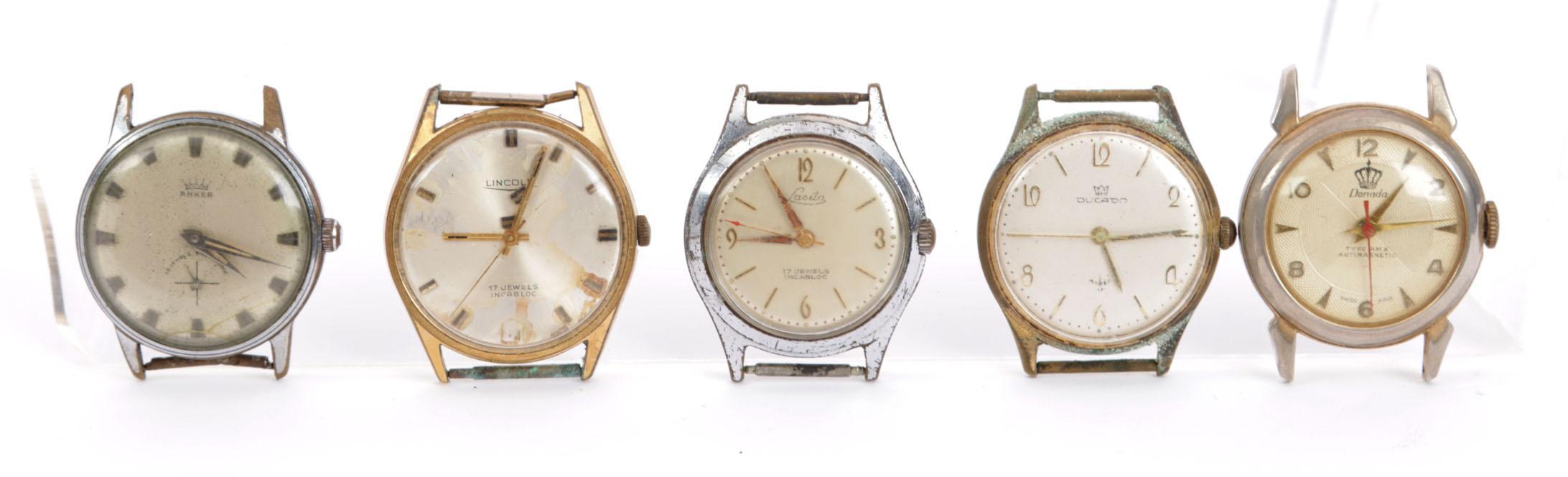 Koop met vijf diverse vintage horlogekasten, w.o. Donada, Lasita, Ducado, Anker en Lincoln (Let op met defecten)