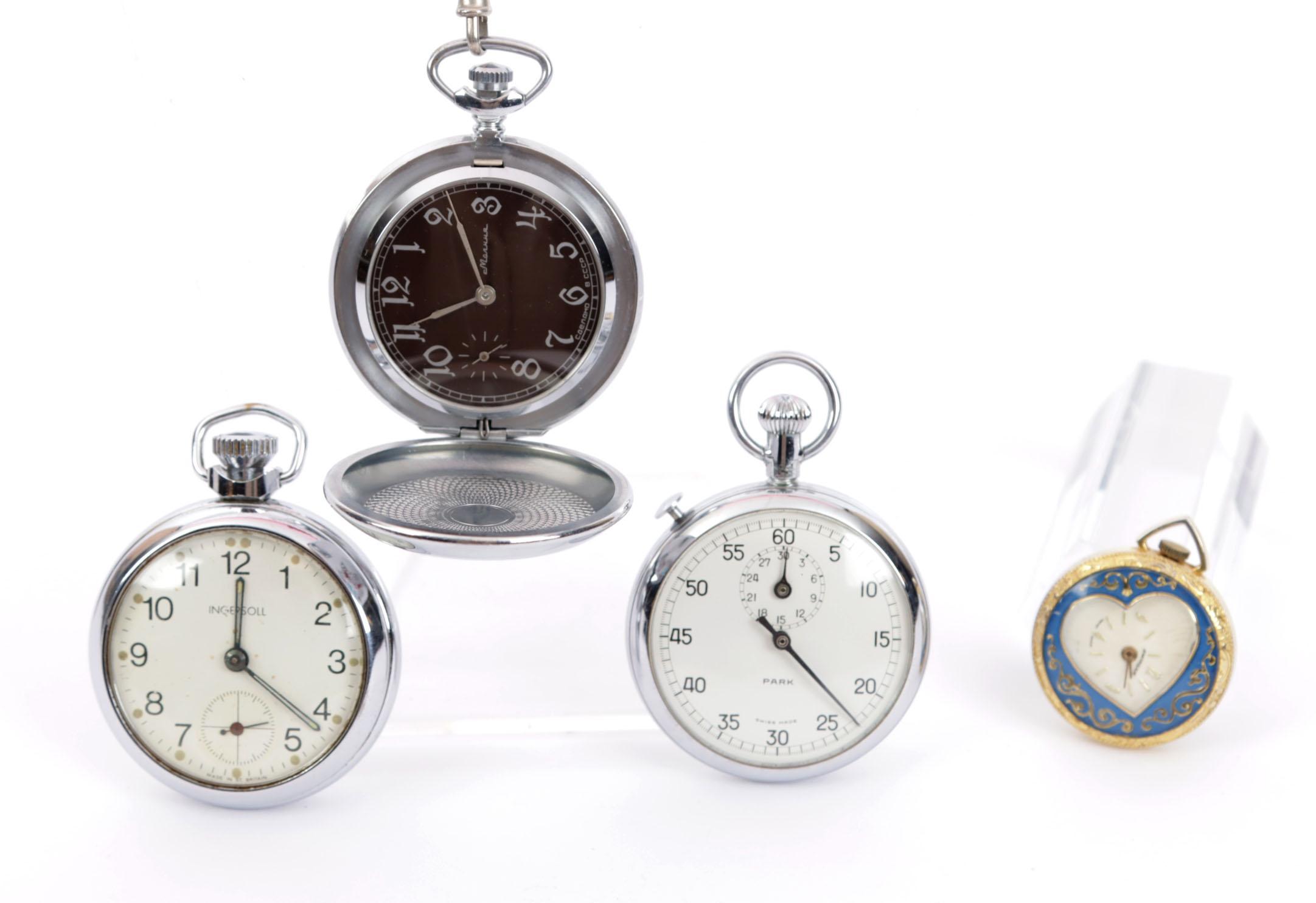 Vier vintage vestzakhorloges, w.o een Russisch model en een stopwatch