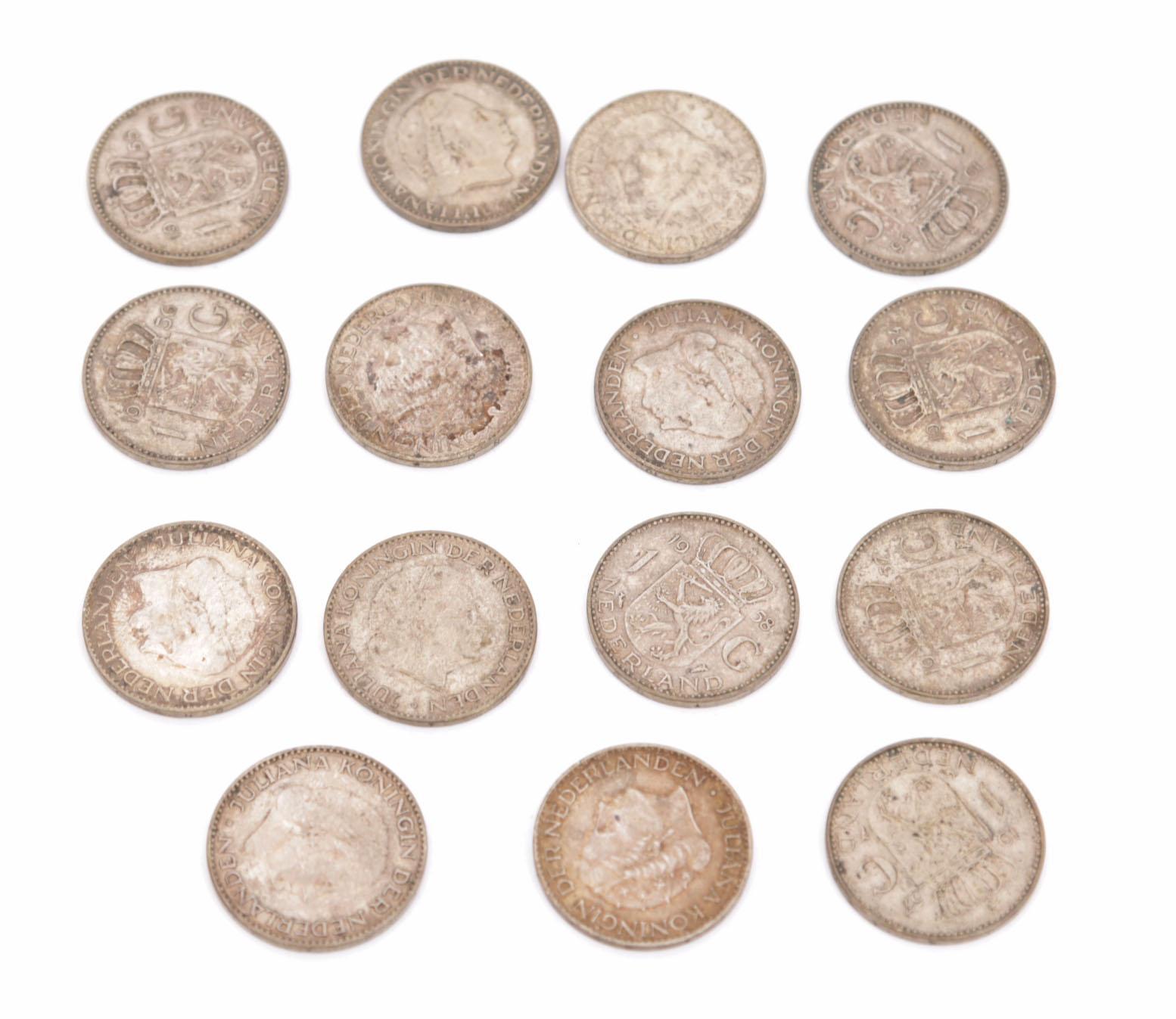 15 Zilveren gulden muntstukken, Koningin Juliana, diverse jaren, 100 gram