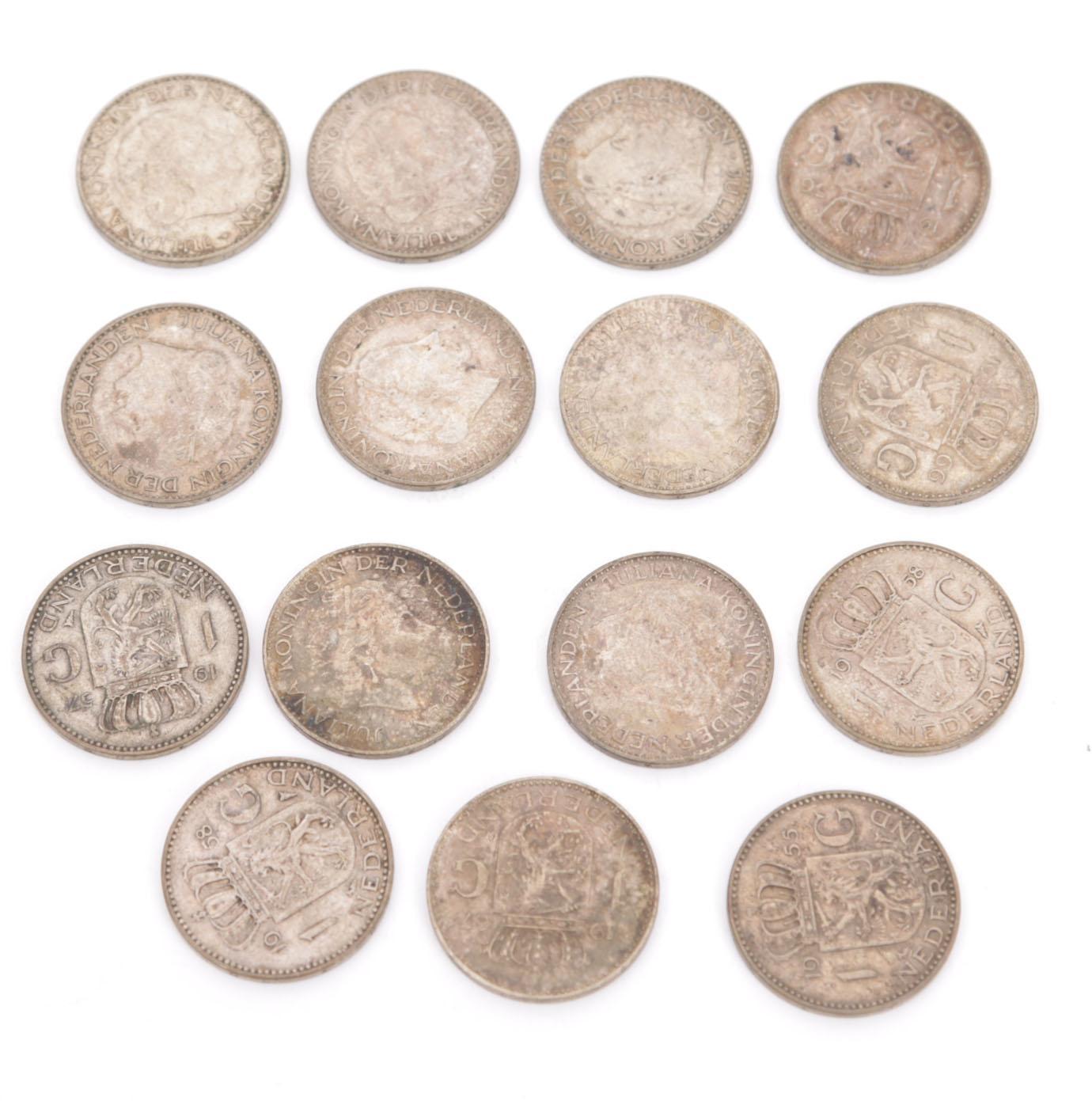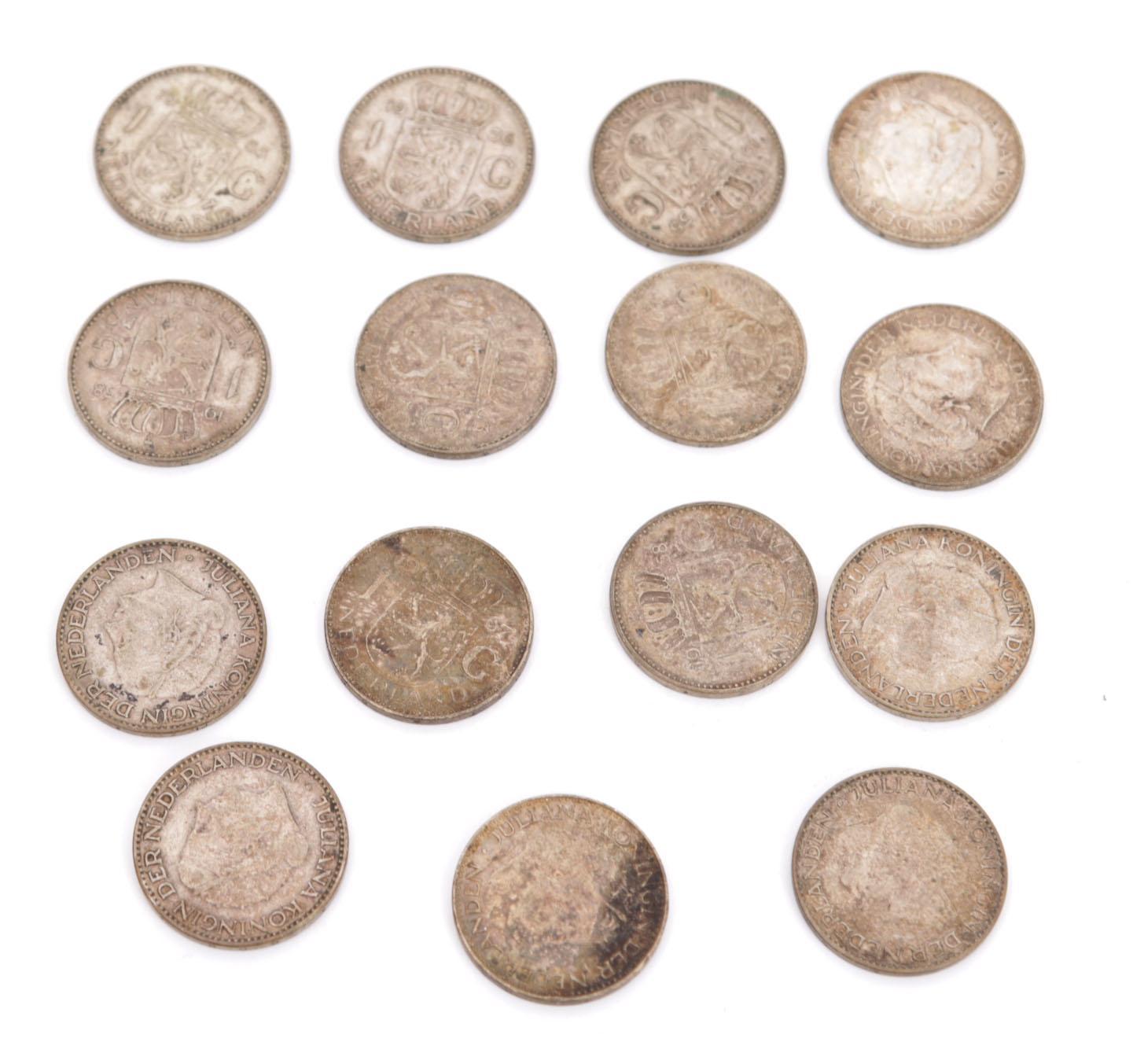 15 Zilveren gulden muntstukken, Koningin Juliana, diverse jaren, 100 gram