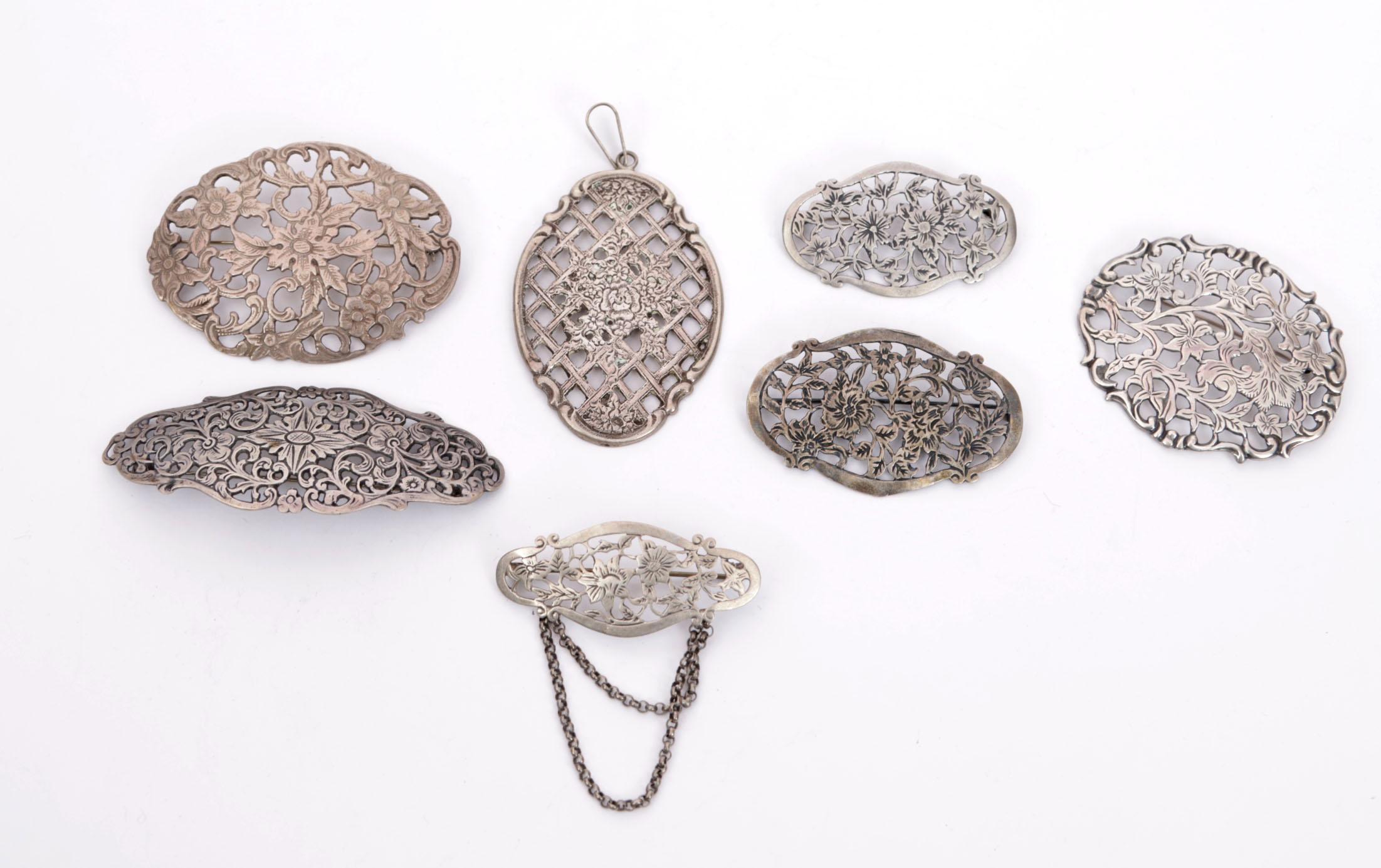 Koopje diverse antieke zilveren broches en hangers, ca.65 gram