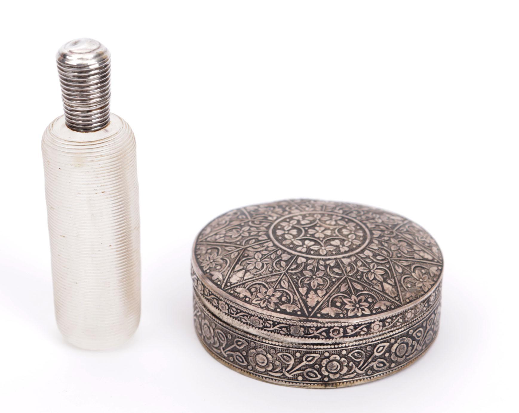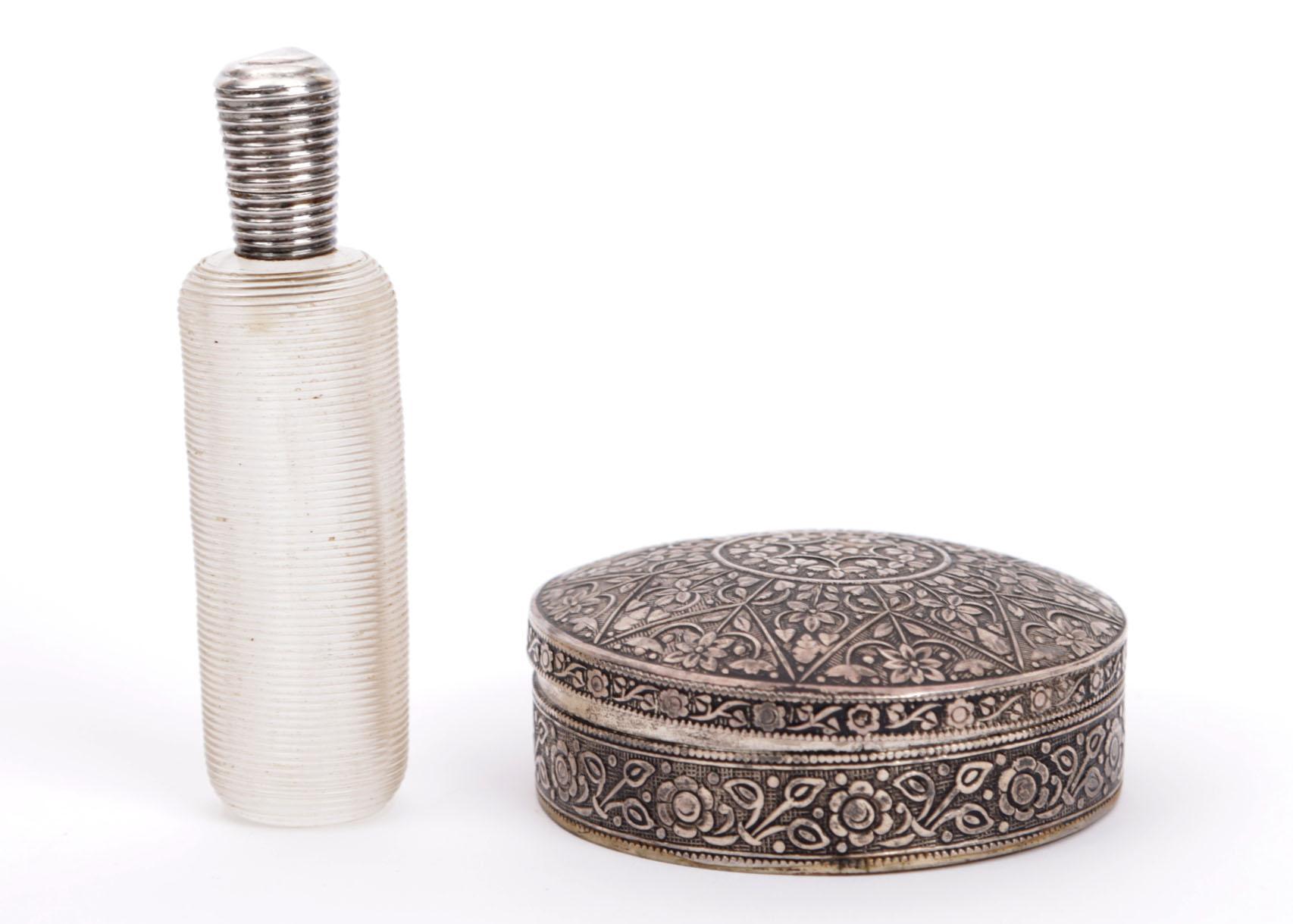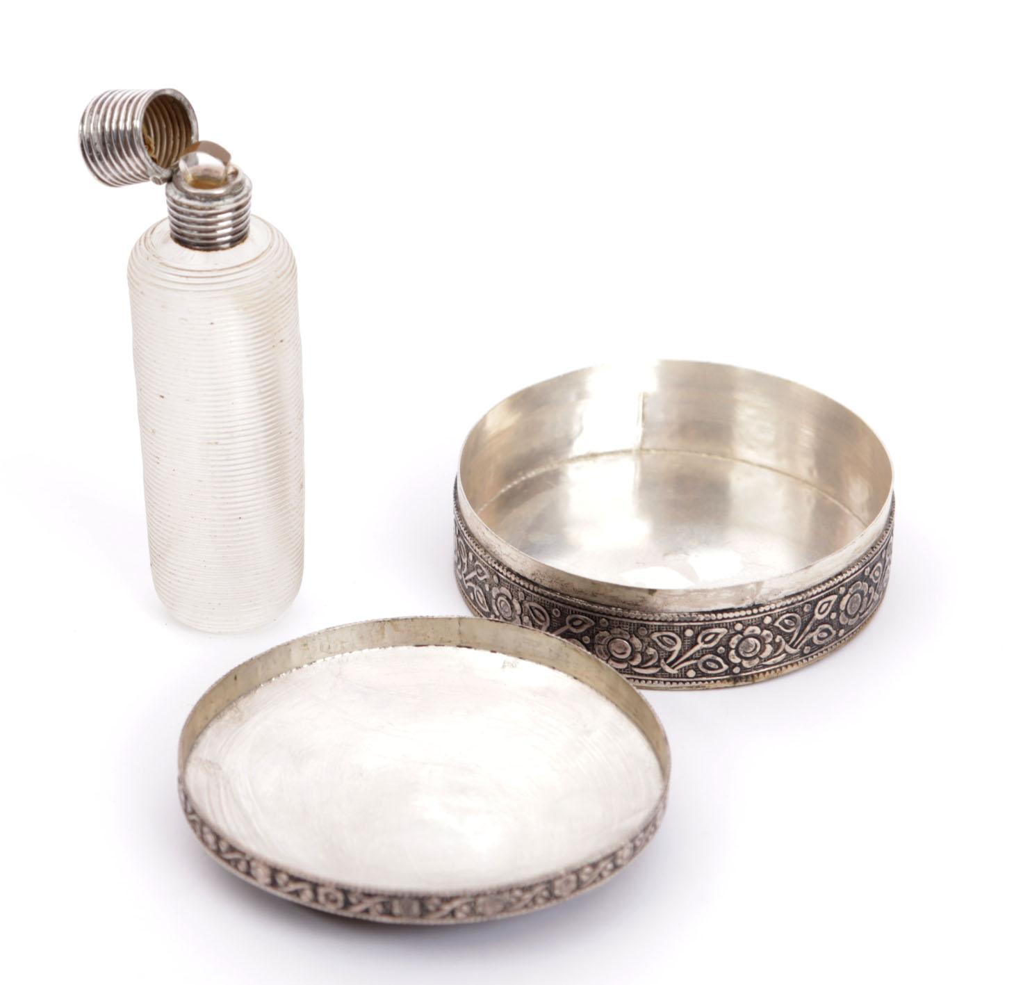 Koopje van een draadglazen odeurflacon met zilveren dop en een zilveren doosje