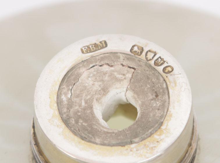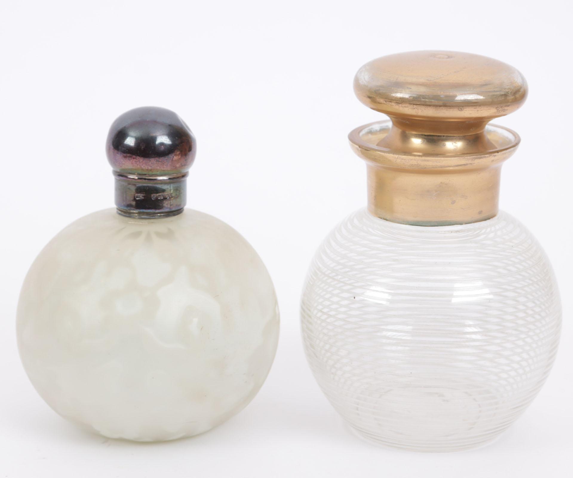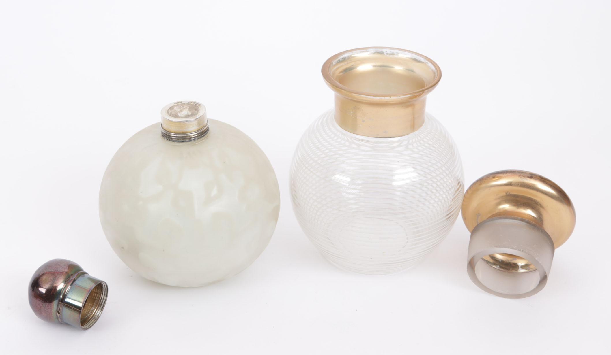 2 bolvormige glazen flacons, waaronder 1 grijs/witte opaline-achtige flacon met overlay grillig motief in glas, zilveren schroefdop, keurmerk F.B.M., jaarletter M (1887), Londen, beschadiging in glas, hoogte 12,5 cm, 1 glazen fles met witte emaille ringen en goud beschilderde hals en -dop, hoogte 15 cm