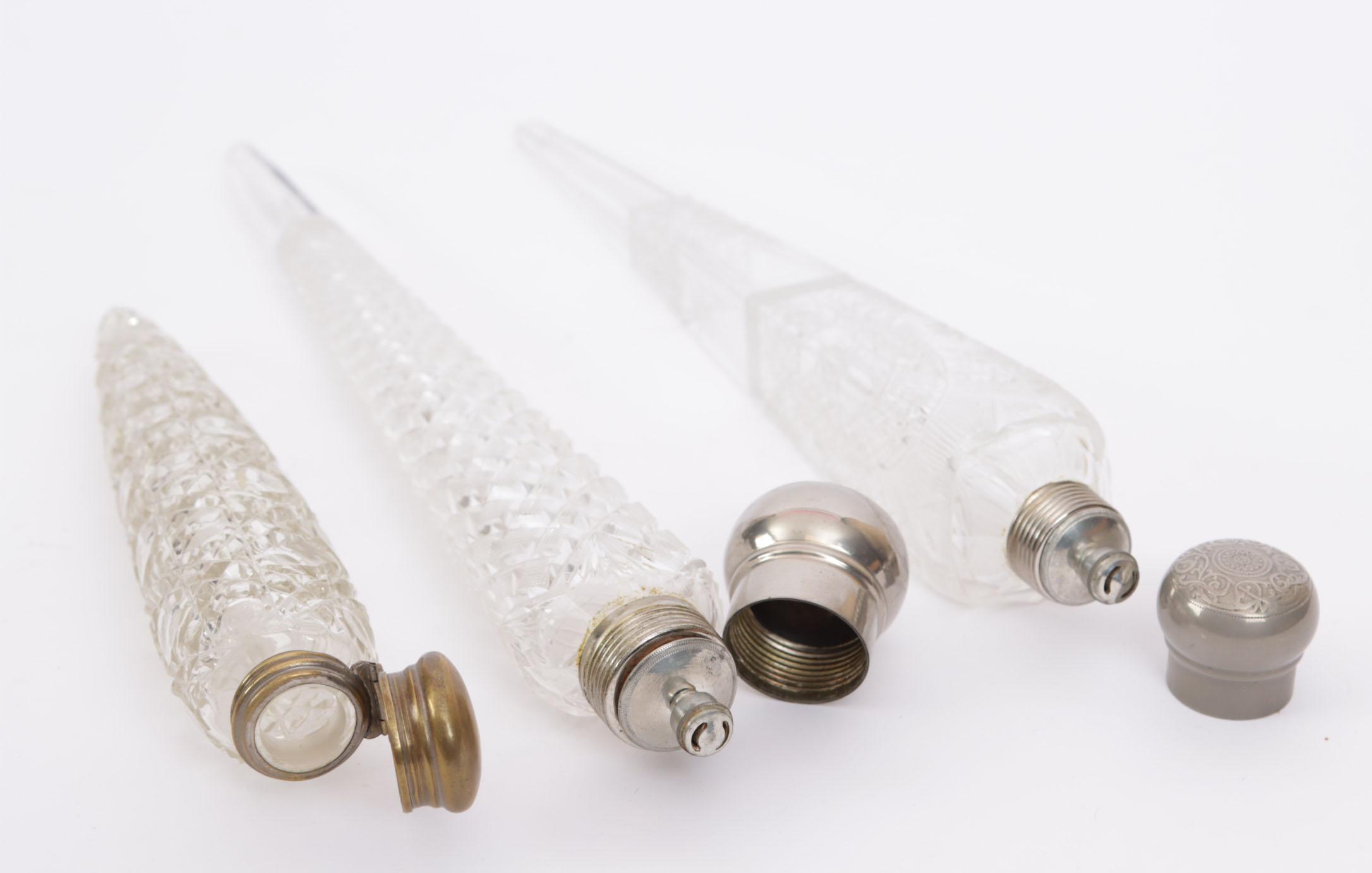 3 crystallen toilettafel puntflacons, waaronder: 1 fles met metalen schroefdop,diamantvorm geslepen, waaronder dop op kurk, lengte 33,7 cm, 1 fles decoratief geslepen, metalen gedecoreerde schroefdop, waaronder dop op kurk, lengte 31,7 cm, 1 fles ruitpatroon met koperkleurige metalen scharnierende dop, lengte 21,5 cm