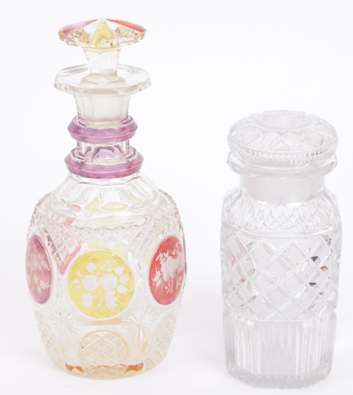 2 toilettafel flacons, waaronder: 1 crystallen, rechthoekige diamantpatroon geslepen fles met crystallen dop, barst in zijkant dop, hoogte 14 cm, 1 bolvormige crystallen fles met geëtste bloemdecoraties rondom op gele en rode ronde vlakken, hoogte 20 cm