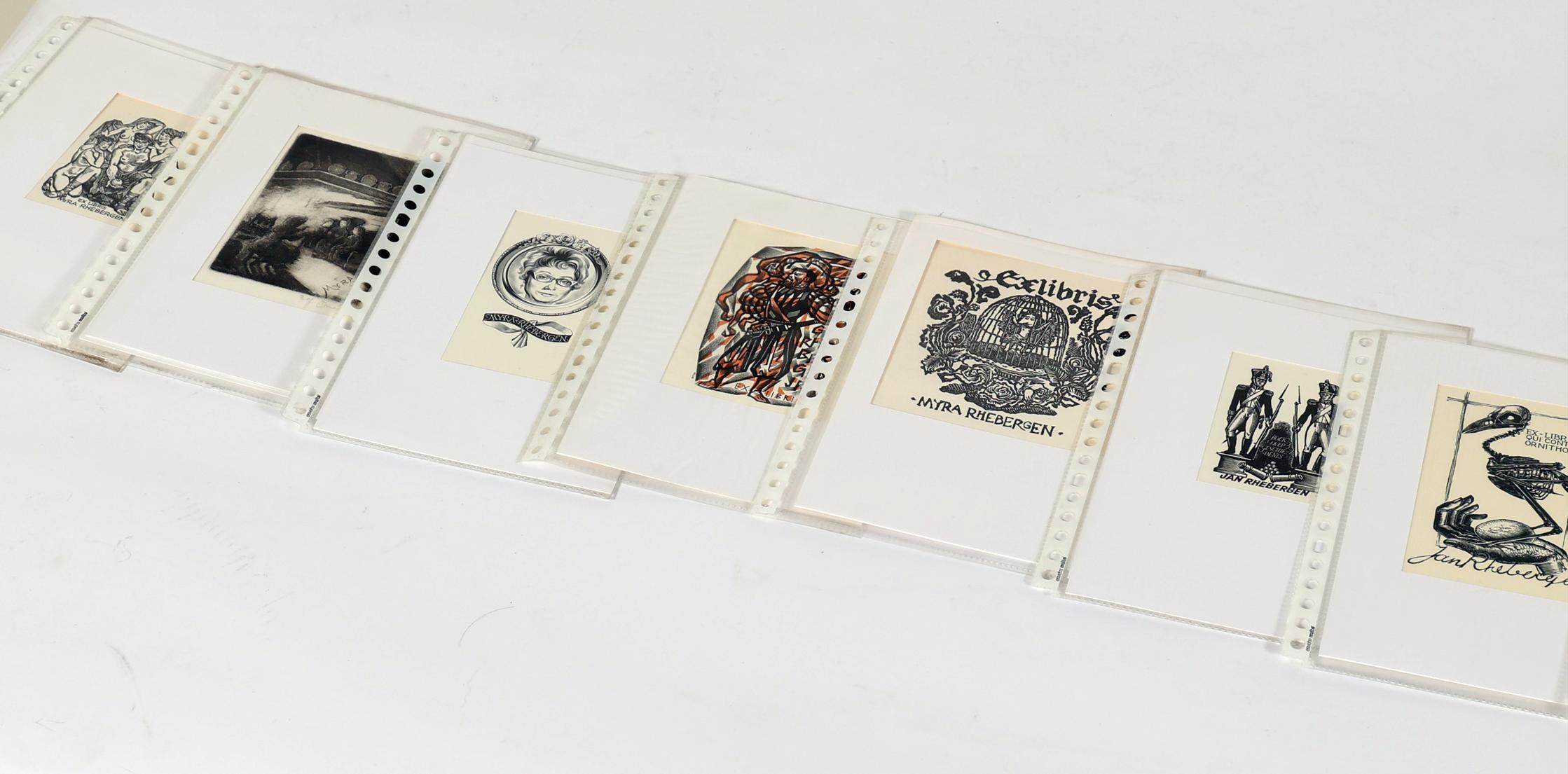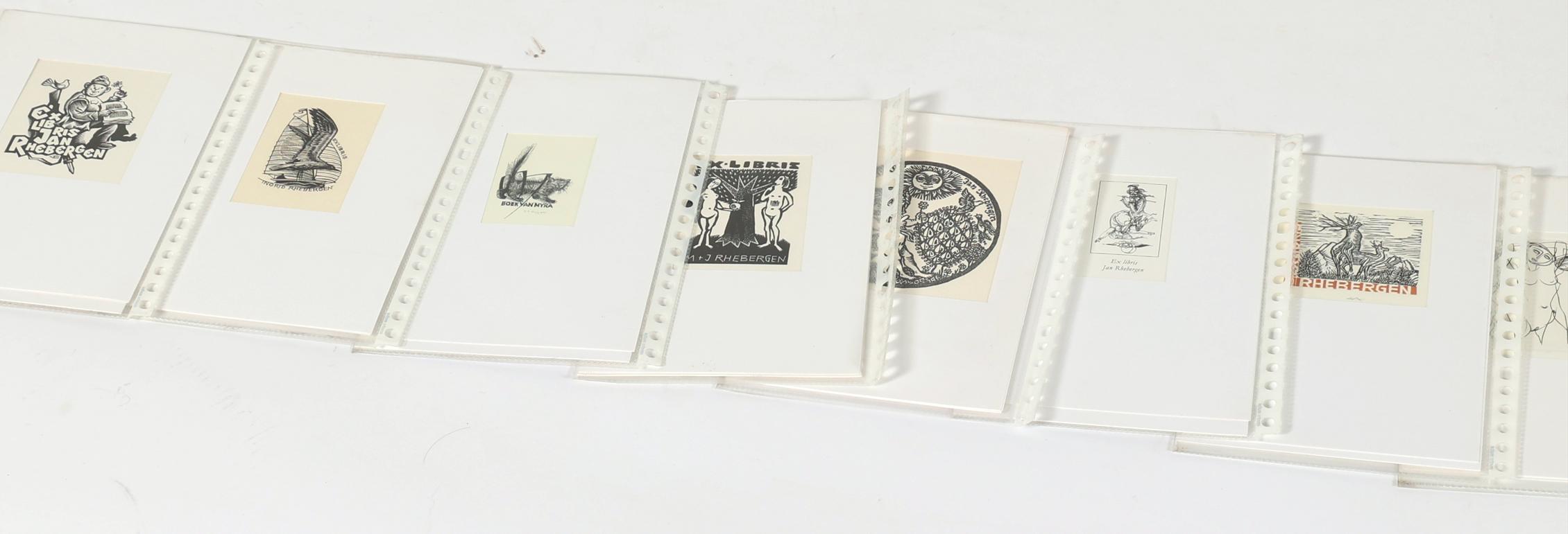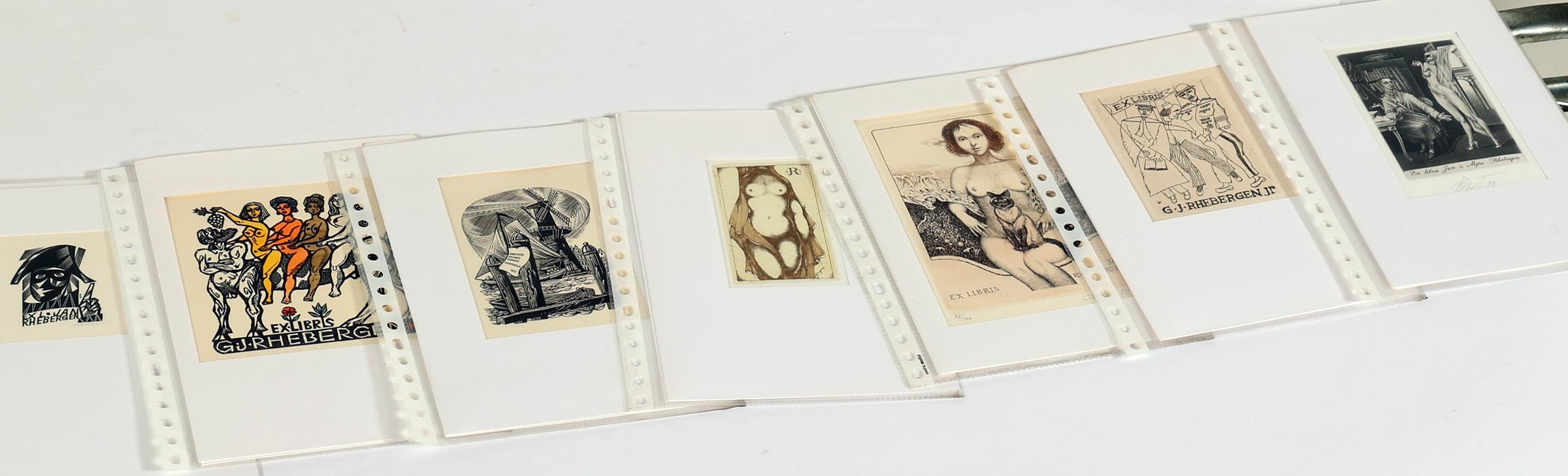 Rhebergen, J., plm. 30 exlibris op naam van J. / M. Rhebergen, diverse technieken (plm. 8 x diepdruk), deels gesigneerd, in passe-partouts. Werk van o.a. Mezl, K.-G. Hirsch, Ru van Rossum, C. de Wolff, K. Stanclova, J. Kabrt, J. Battermann, Vial, M. de Jong