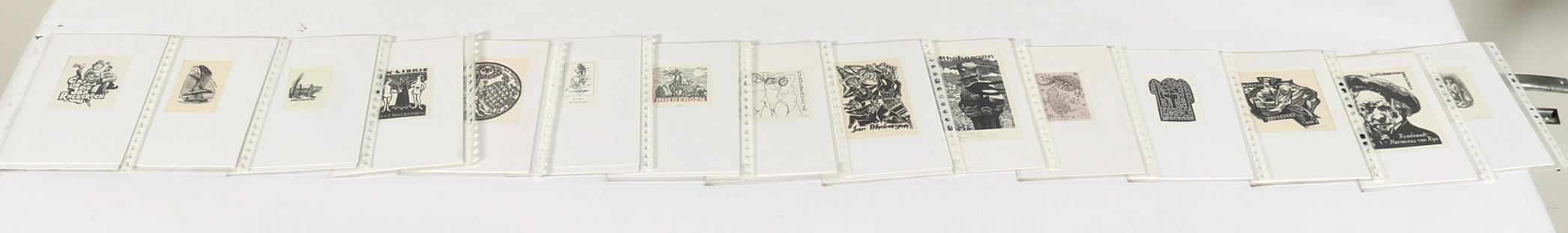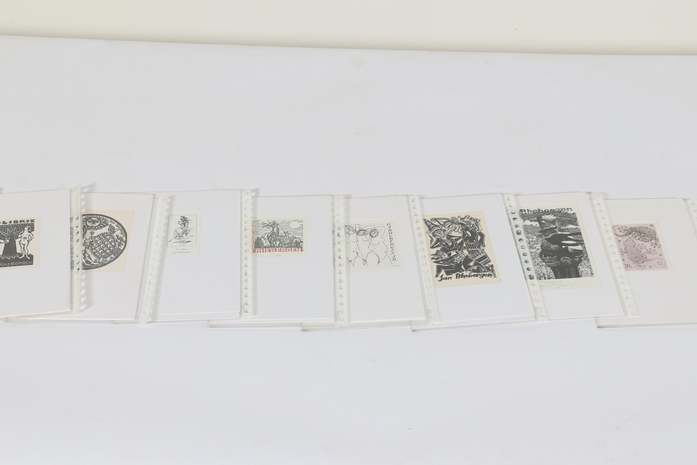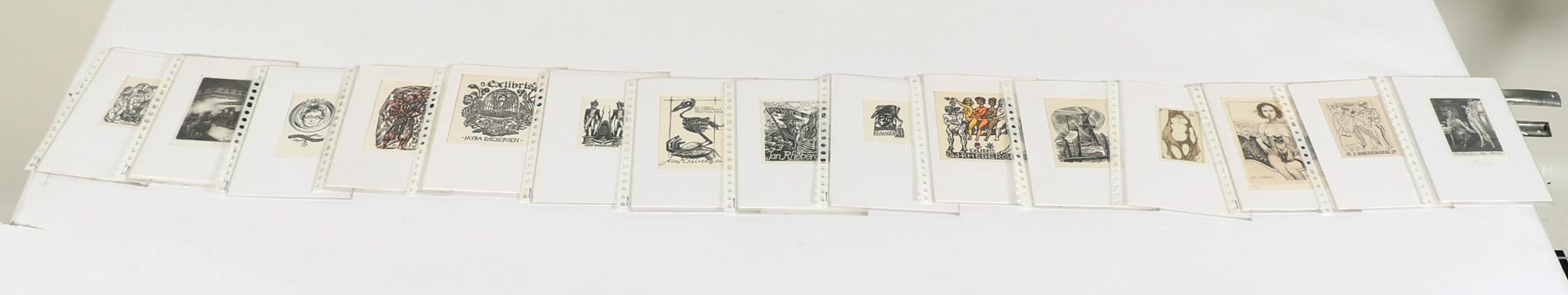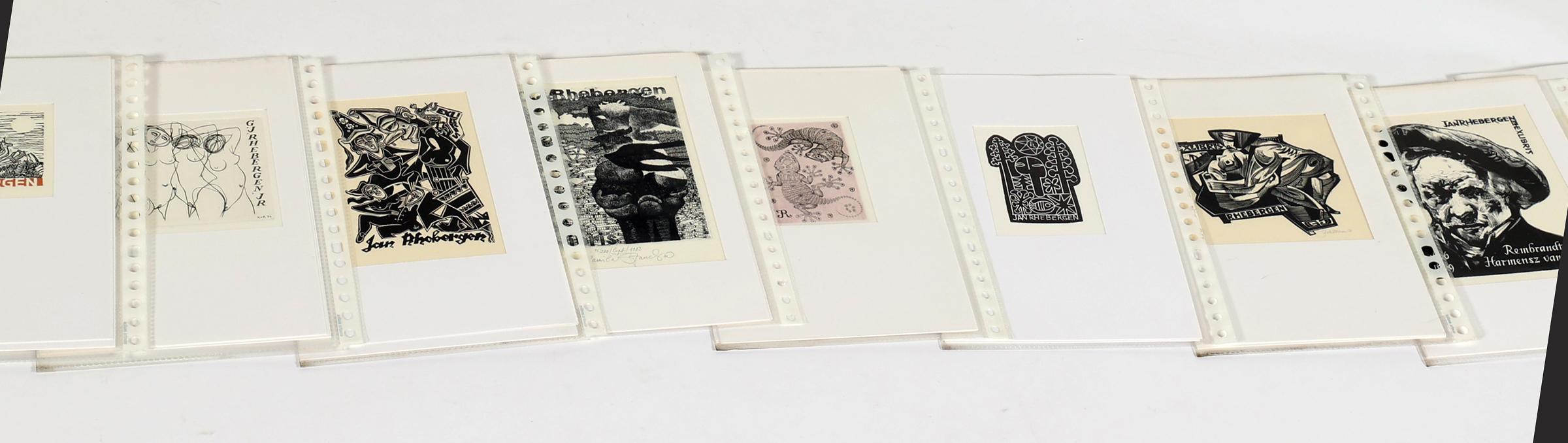 Rhebergen, J., plm. 30 exlibris op naam van J. / M. Rhebergen, diverse technieken (plm. 8 x diepdruk), deels gesigneerd, in passe-partouts. Werk van o.a. Mezl, K.-G. Hirsch, Ru van Rossum, C. de Wolff, K. Stanclova, J. Kabrt, J. Battermann, Vial, M. de Jong