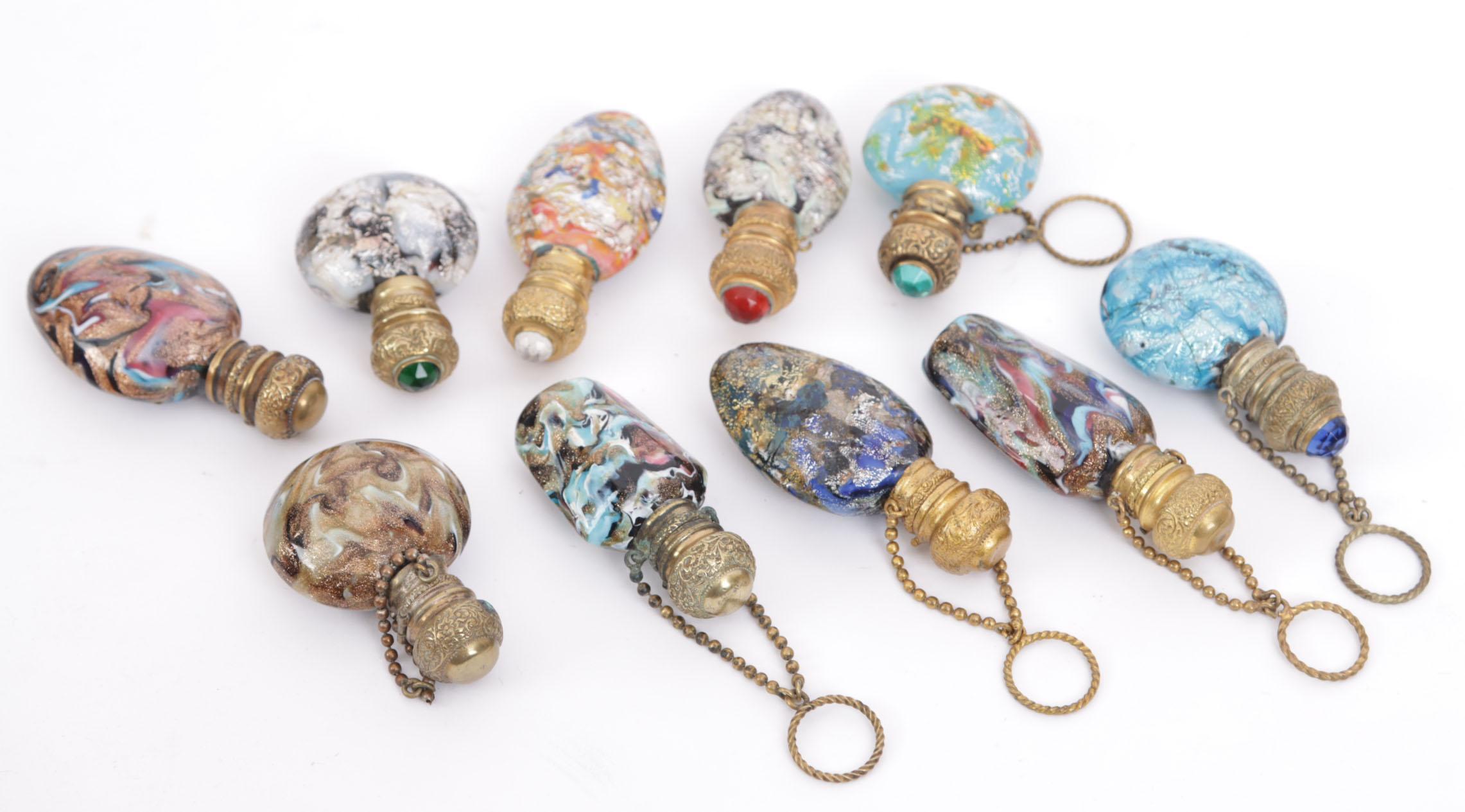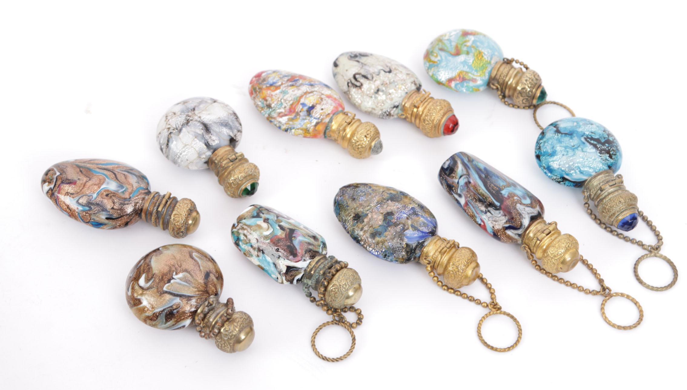 10 Venetiaanse millefiori glazen parfumflesjes, waarvan 6 aan bolletjesketting en pinkring, scharnierende koperen doppen, 19e eeuws, hoogte 6,5-7,5 cm